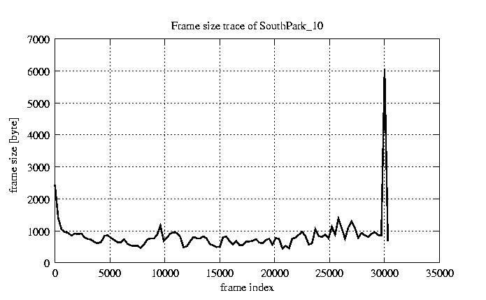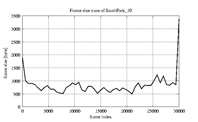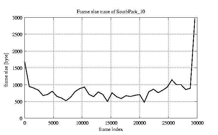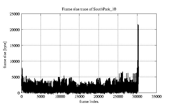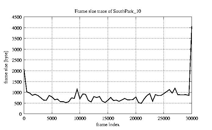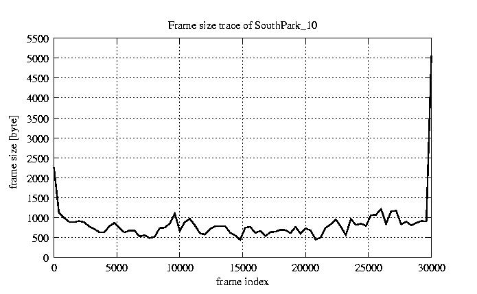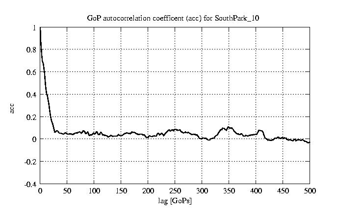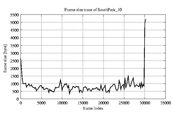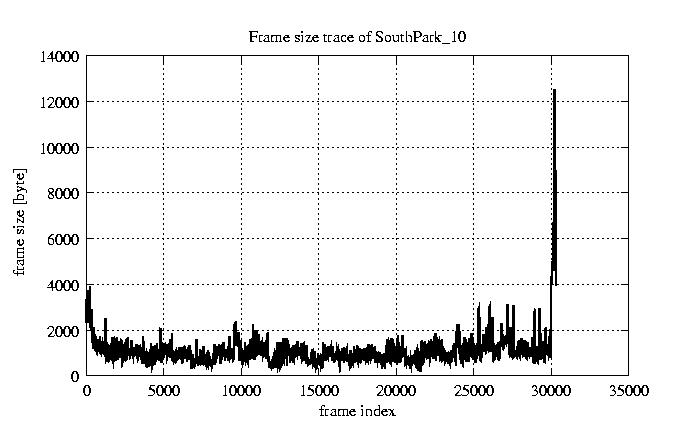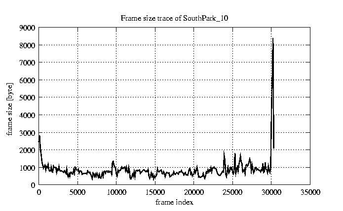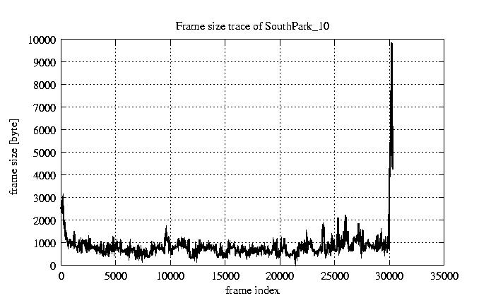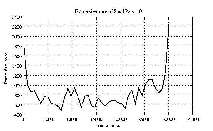 GoP statistics # of GoPs - 2527 mean GoP size byte 1e+04 var GoP size - 6.9e+07 CoV of GoP size - 0.82 min GoP size byte 1457 max GoP size byte 144313 Mean bit rate bit/sec 1.7e+05 Peak bit rate bit/sec 2.4e+06 Peak/Mean of bit rate - 14.21