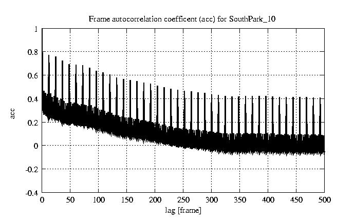 Frame statistics compression ratio YUV:MP4 44.91 File Size byte 2.6e+07 Video run time msec 1.2e+06 # of Frames - 30334 mean frame size byte 8.5e+02 var frame size - 1.3e+06 CoV of frame size - 1.33 min frame size byte 5 max frame size byte 21661 Mean bit rate bit/sec 1.7e+05 Peak bit rate bit/sec 4.3e+06 Peak/Mean of bit rate - 25.59
