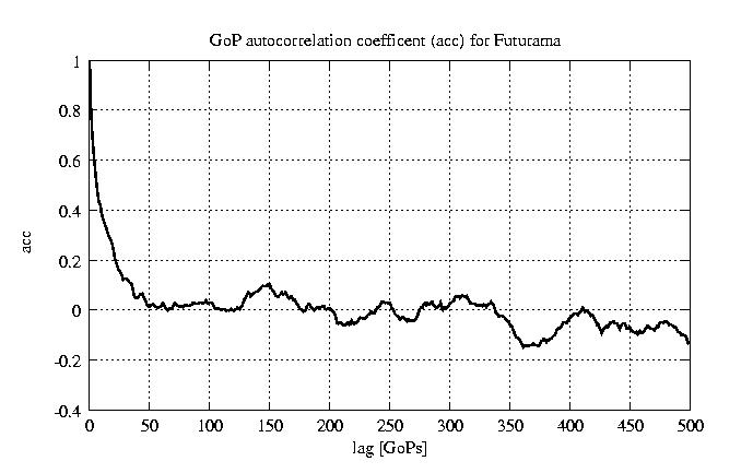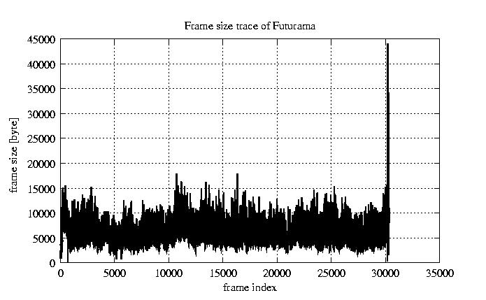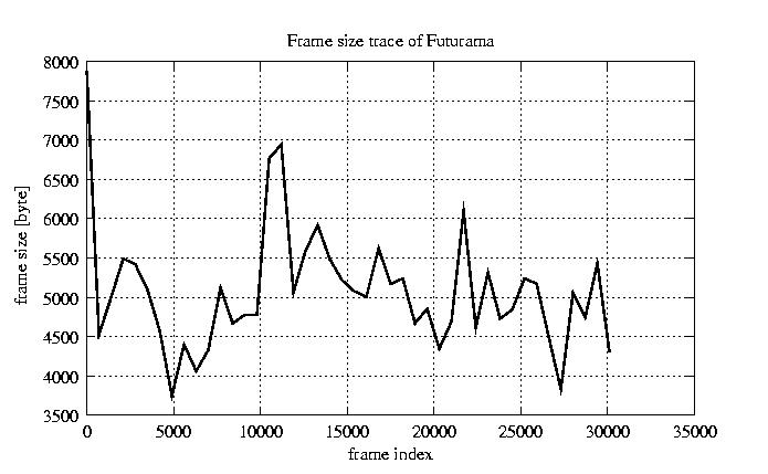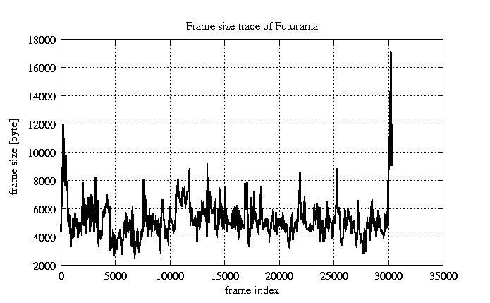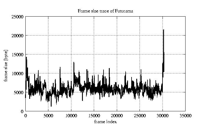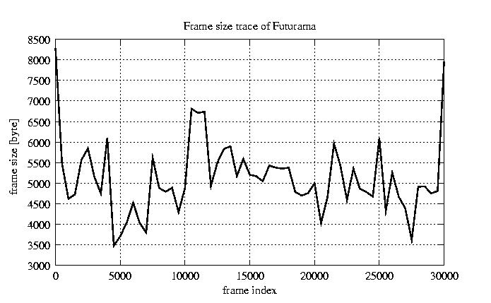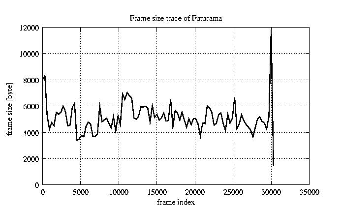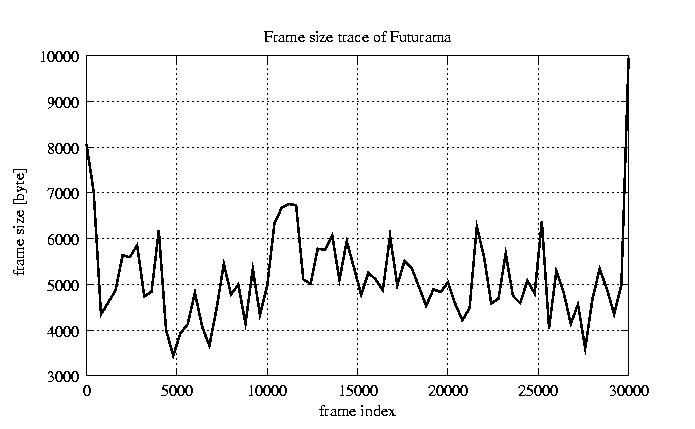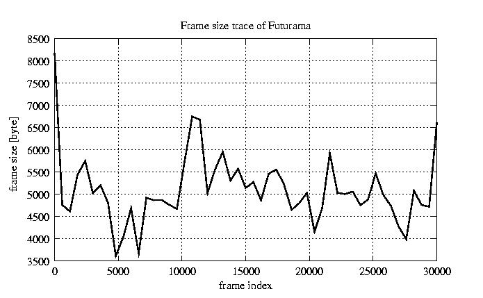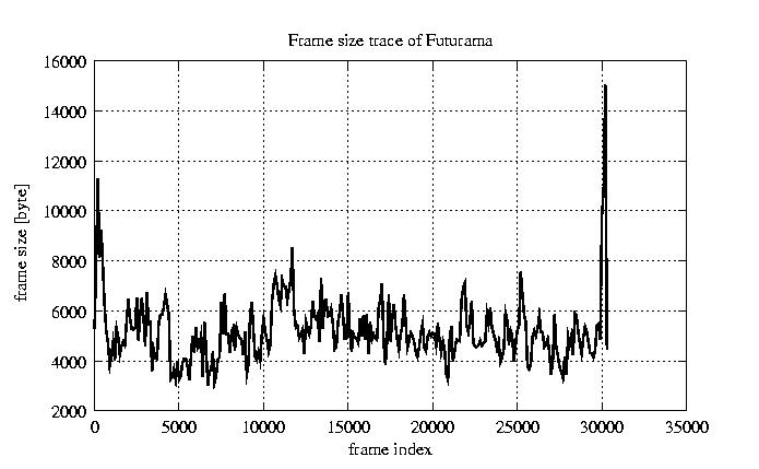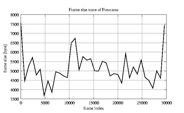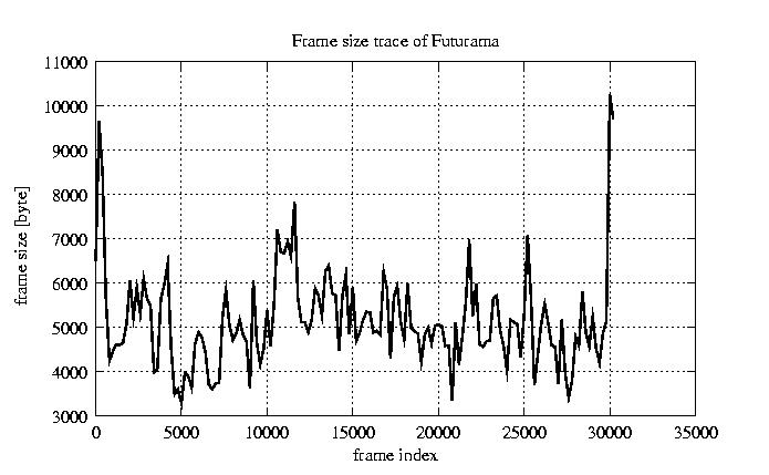 GoP statistics # of GoPs - 2527 mean GoP size byte 6.2e+04 var GoP size - 3.2e+08 CoV of GoP size - 0.29 min GoP size byte 12599 max GoP size byte 240670 Mean bit rate bit/sec 1e+06 Peak bit rate bit/sec 4e+06 Peak/Mean of bit rate - 3.90