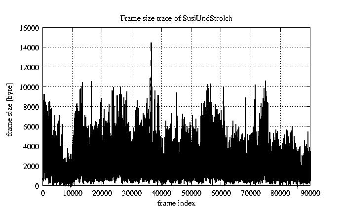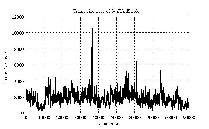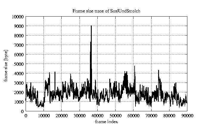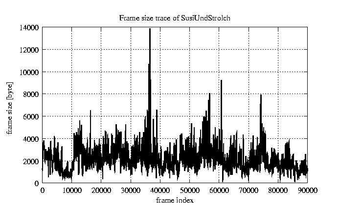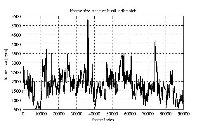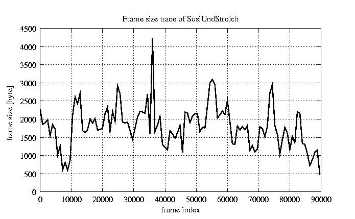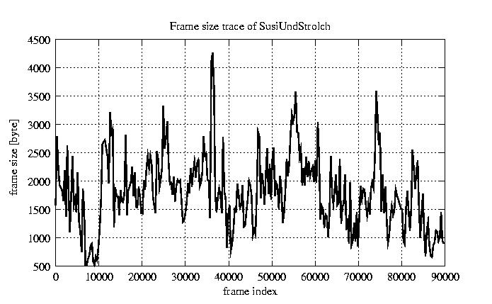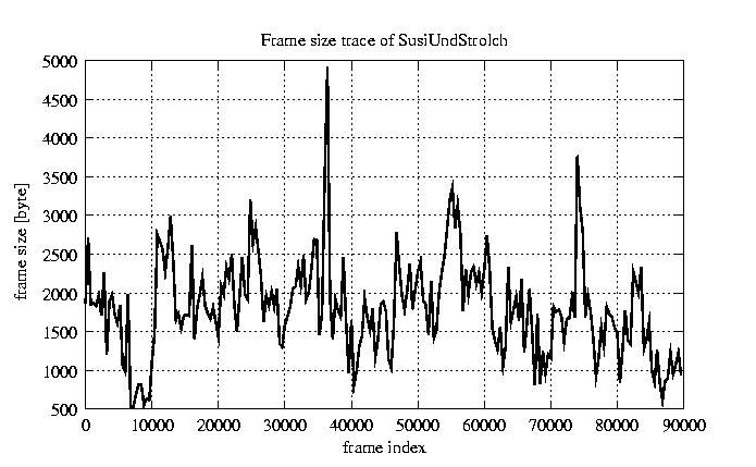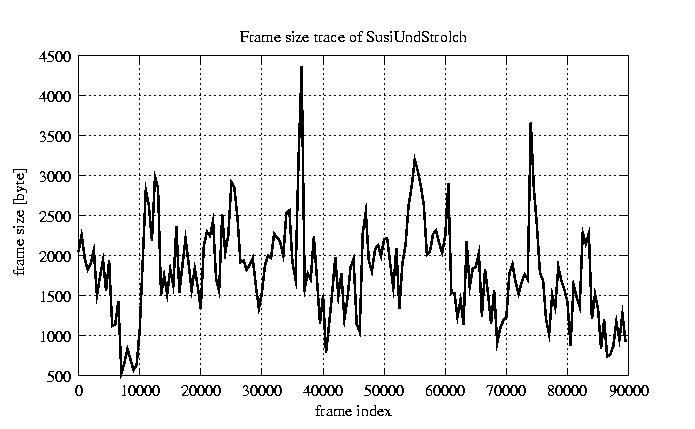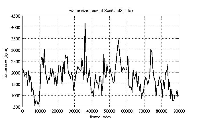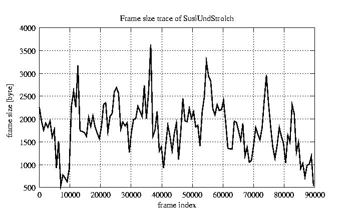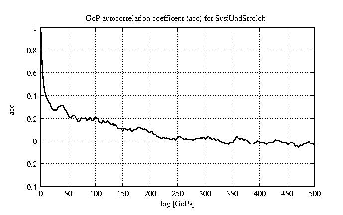 GoP statistics # of GoPs - 7499 mean GoP size byte 2.2e+04 var GoP size - 1.2e+08 CoV of GoP size - 0.50 min GoP size byte 1288 max GoP size byte 154379 Mean bit rate bit/sec 3.6e+05 Peak bit rate bit/sec 2.6e+06 Peak/Mean of bit rate - 7.13
