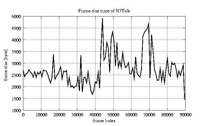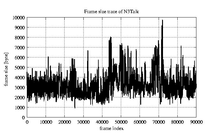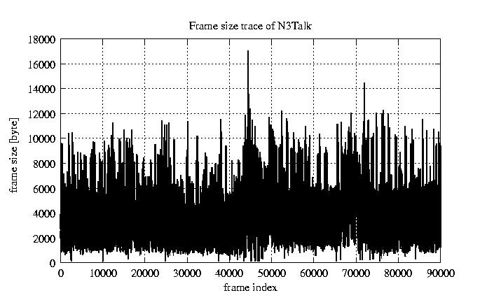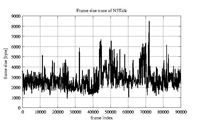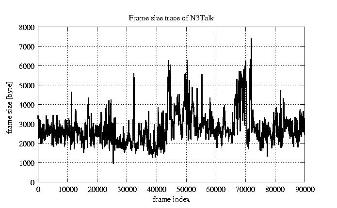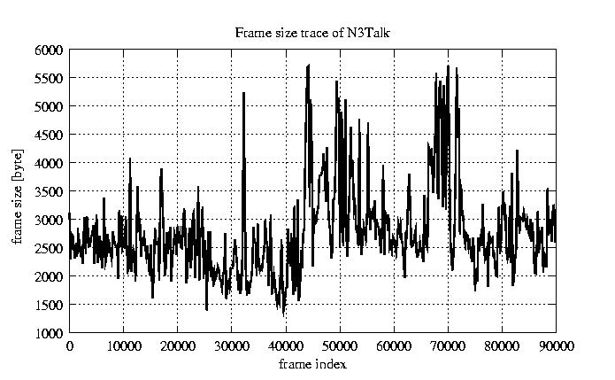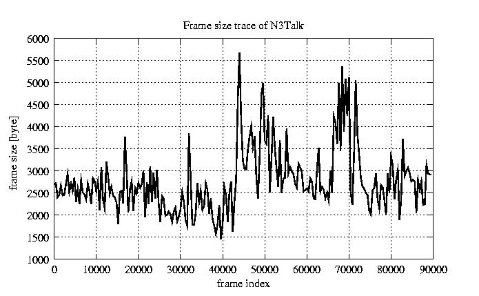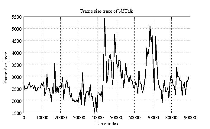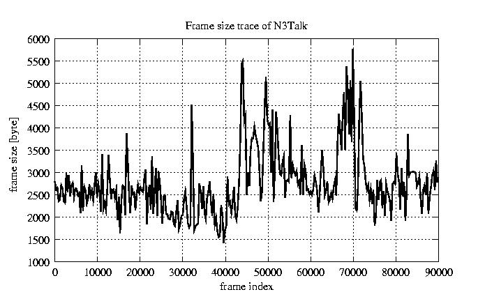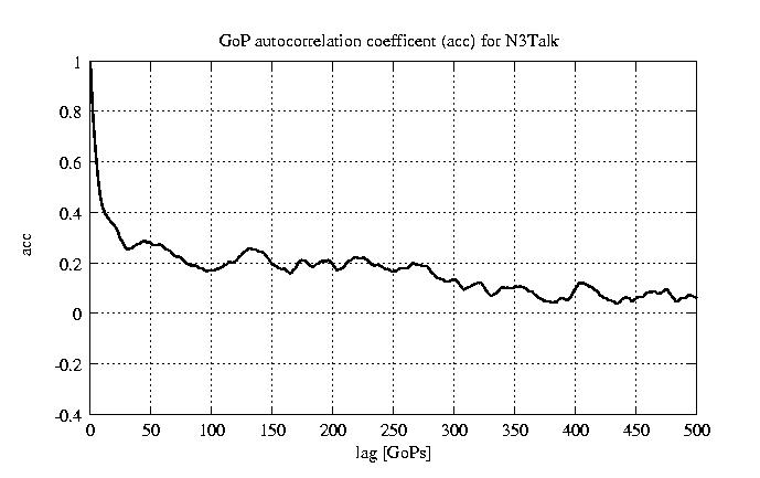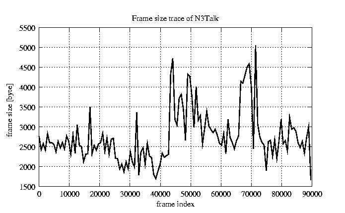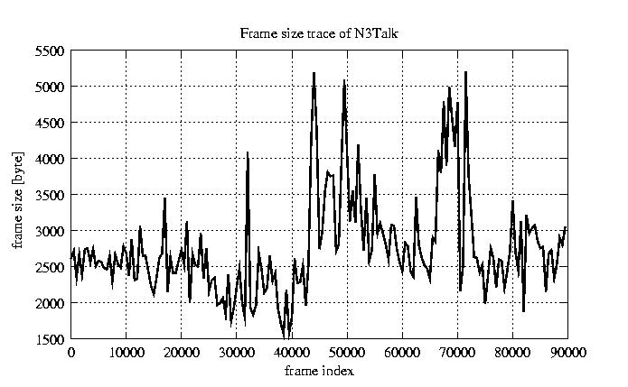 GoP statistics # of GoPs - 7499 mean GoP size byte 3.3e+04 var GoP size - 1.5e+08 CoV of GoP size - 0.36 min GoP size byte 9220 max GoP size byte 105426 Mean bit rate bit/sec 5.5e+05 Peak bit rate bit/sec 1.8e+06 Peak/Mean of bit rate - 3.18