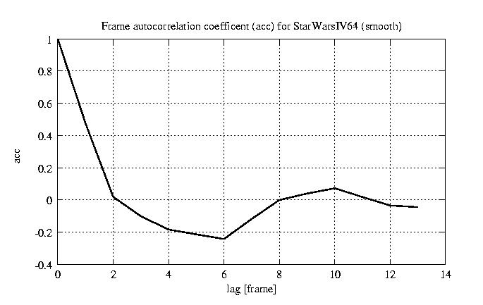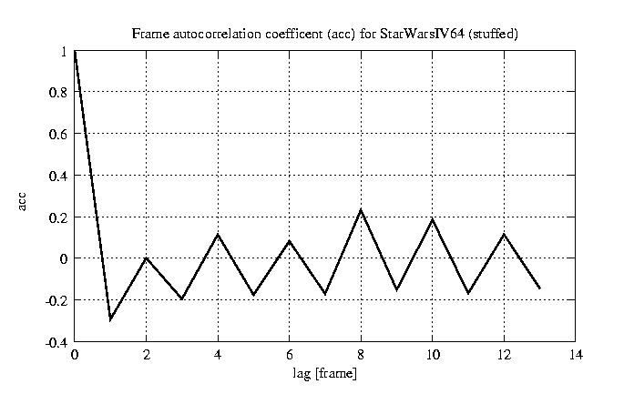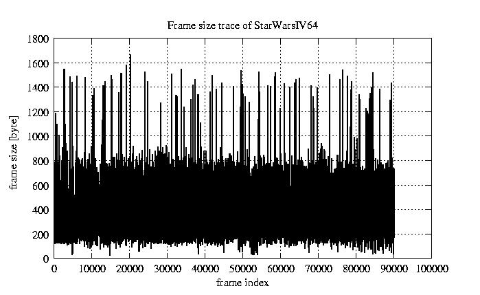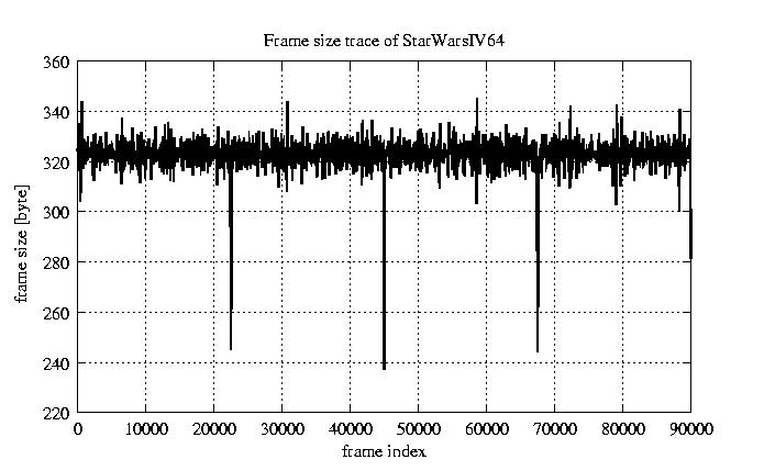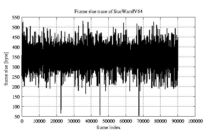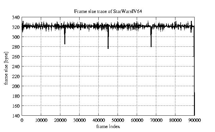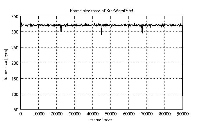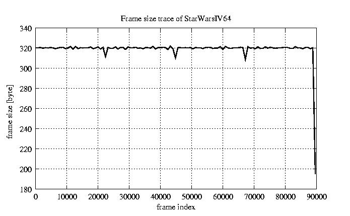 Frames, stuffed Rates Frames, original compression ratio YUV:H263 118.95 118.95 File size byte 2.9e+07 2.9e+07 Video run time msec 3.6e+06 3.6e+06 3.6e+06 # of Frames - 90084.00 24965.00 mean frame size byte 319.62 1153.32 var frame size - 334497.09 245477.20 CoV of frame size - 1.81 0.43 min frame size byte 0.00 23.00 max frame size byte 8203.00 8203.00 Peak/Mean frame - 25.66 7.11 Mean bit rate bit/sec 6.4e+04 Peak bit rate bit/sec 3.3e+05 Peak/Mean of bit rate - 5.2 CoV of bit rate - 0.45 max inter frame space frames 1.00 31.00