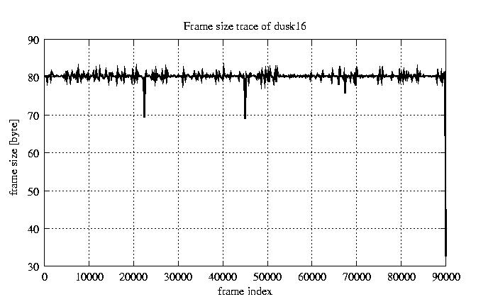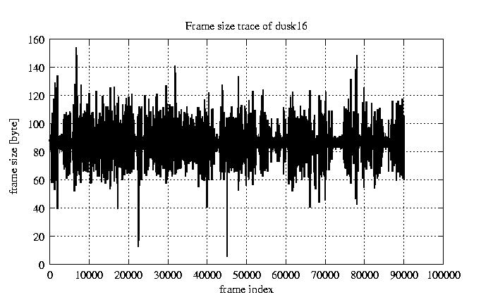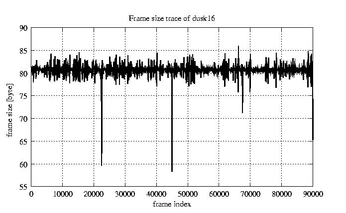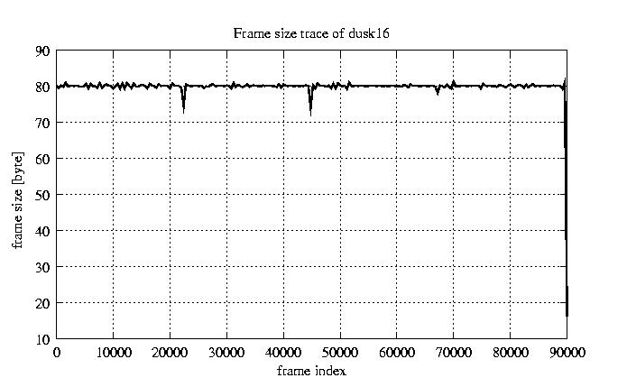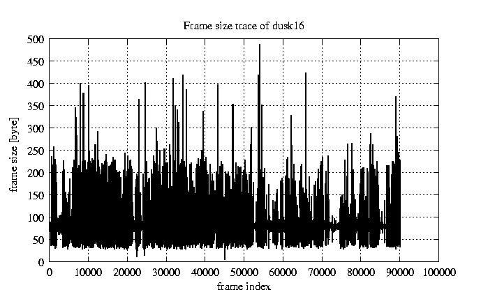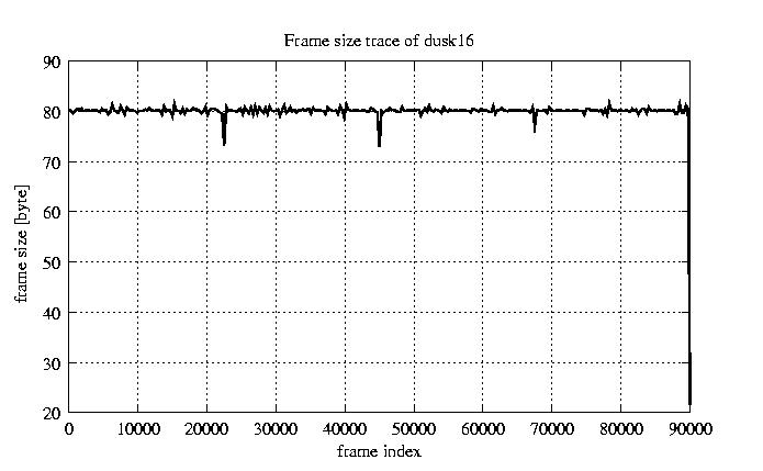 Frames, stuffed Rates Frames, original compression ratio YUV:H263 476.30 476.30 File size byte 7.2e+06 7.2e+06 Video run time msec 3.6e+06 3.6e+06 3.6e+06 # of Frames - 90081.00 16017.00 mean frame size byte 79.82 448.91 var frame size - 46119.54 93698.21 CoV of frame size - 2.69 0.68 min frame size byte 0.00 30.00 max frame size byte 5943.00 5943.00 Peak/Mean frame - 74.46 13.24 Mean bit rate bit/sec 1.6e+04 Peak bit rate bit/sec 9.8e+04 Peak/Mean of bit rate - 6.1 CoV of bit rate - 0.3 max inter frame space frames 1.00 74.00