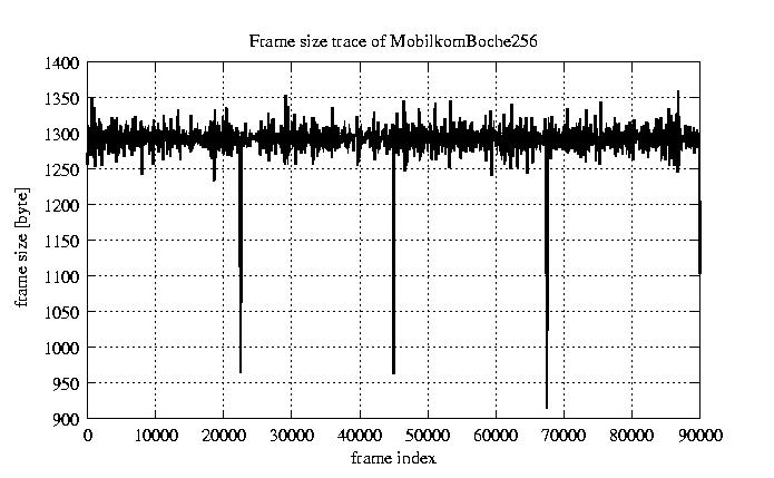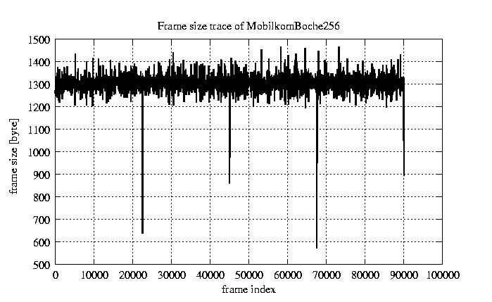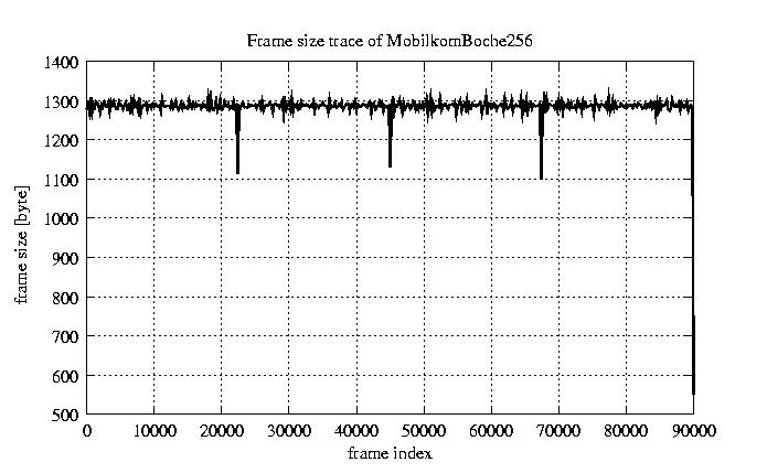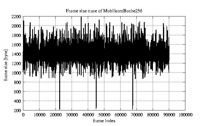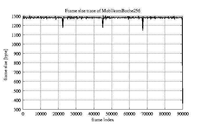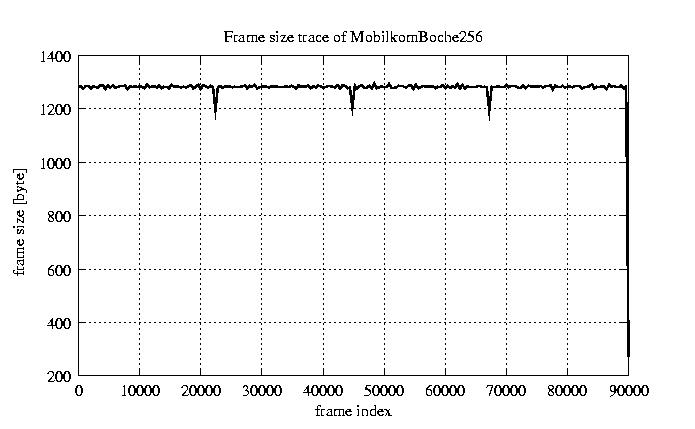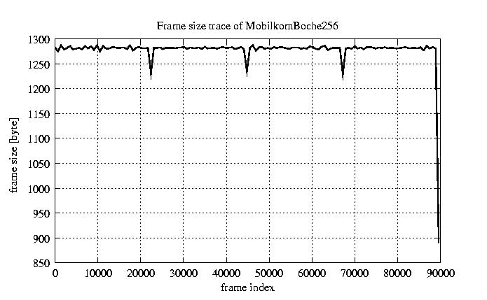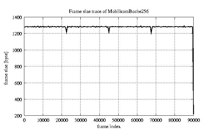 Frames, stuffed Rates Frames, original compression ratio YUV:H263 29.73 29.73 File size byte 1.2e+08 1.2e+08 Video run time msec 3.6e+06 3.6e+06 3.6e+06 # of Frames - 90081.00 17707.00 mean frame size byte 1278.74 6505.36 var frame size - 6986377.99 1540539.67 CoV of frame size - 2.07 0.19 min frame size byte 0.00 1461.00 max frame size byte 9421.00 9421.00 Peak/Mean frame - 7.37 1.45 Mean bit rate bit/sec 2.6e+05 Peak bit rate bit/sec 1.5e+06 Peak/Mean of bit rate - 5.8 CoV of bit rate - 0.53 max inter frame space frames 1.00 33.00