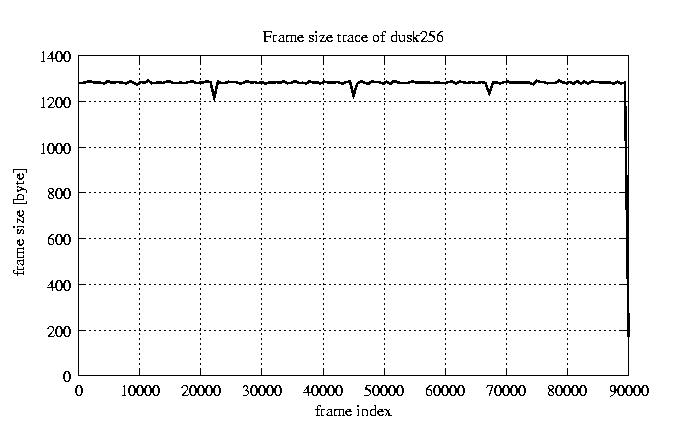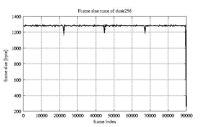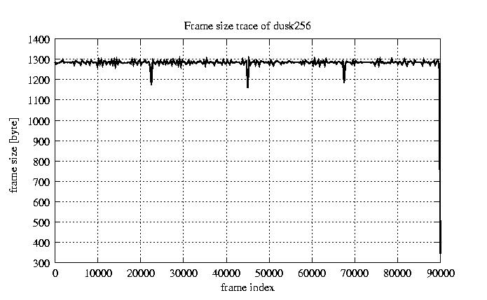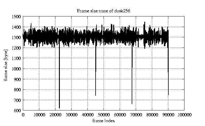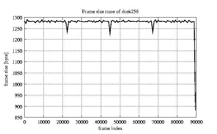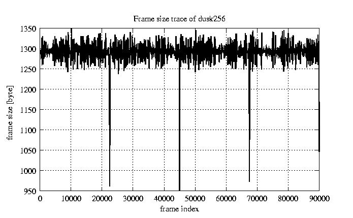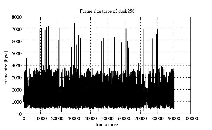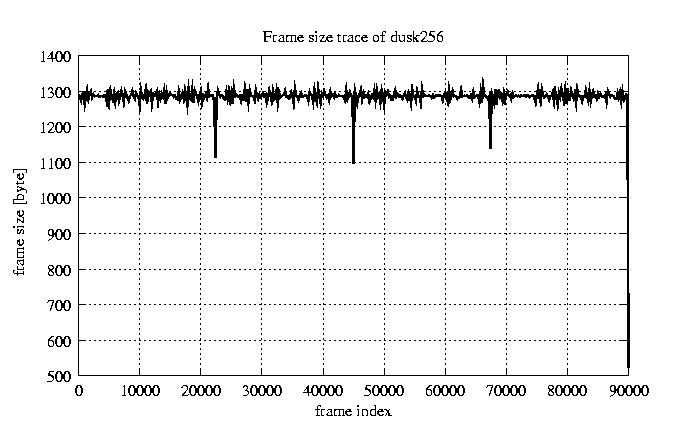 Frames, stuffed Rates Frames, original compression ratio YUV:H263 29.73 29.73 File size byte 1.2e+08 1.2e+08 Video run time msec 3.6e+06 3.6e+06 3.6e+06 # of Frames - 90081.00 27534.00 mean frame size byte 1278.79 4183.71 var frame size - 4532883.33 2676476.34 CoV of frame size - 1.66 0.39 min frame size byte 0.00 266.00 max frame size byte 12566.00 12566.00 Peak/Mean frame - 9.83 3.00 Mean bit rate bit/sec 2.6e+05 Peak bit rate bit/sec 1.5e+06 Peak/Mean of bit rate - 5.9 CoV of bit rate - 0.39 max inter frame space frames 1.00 33.00