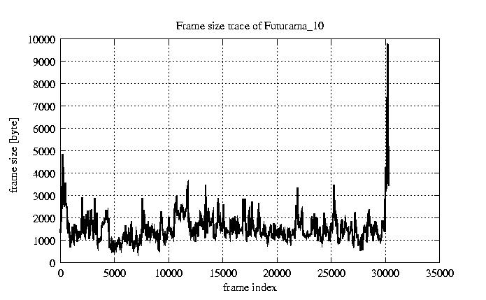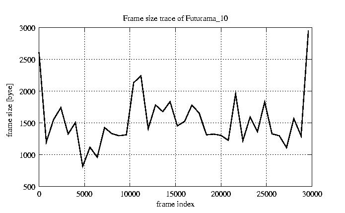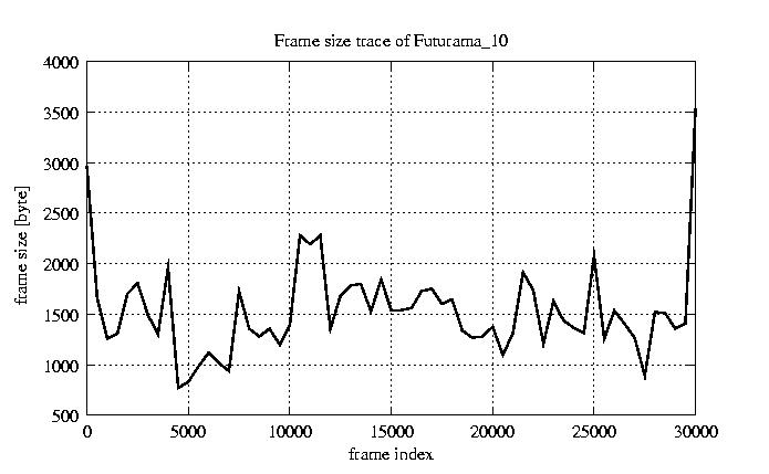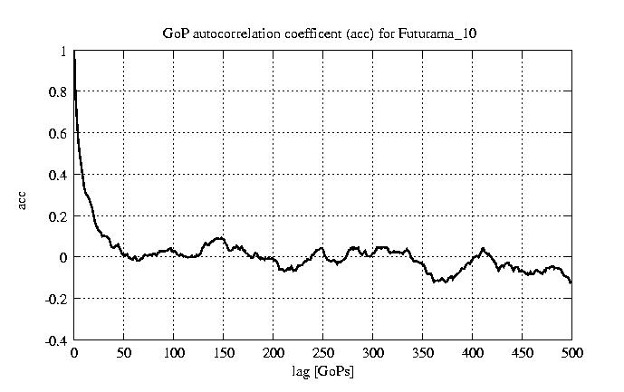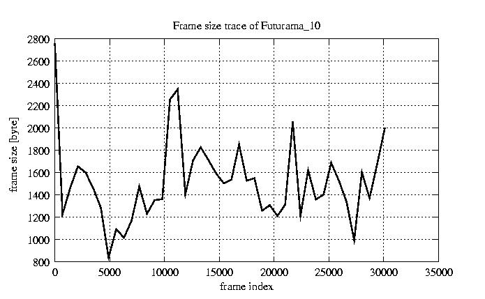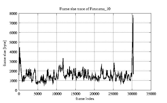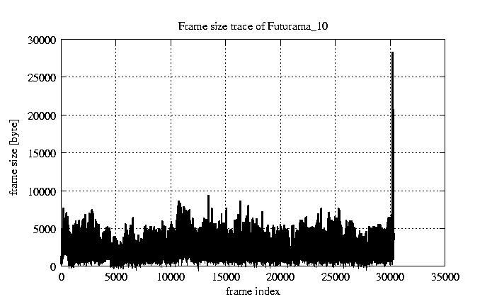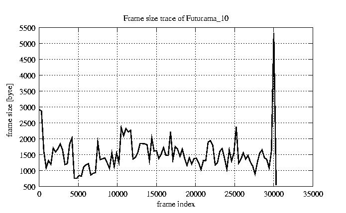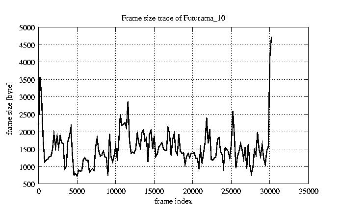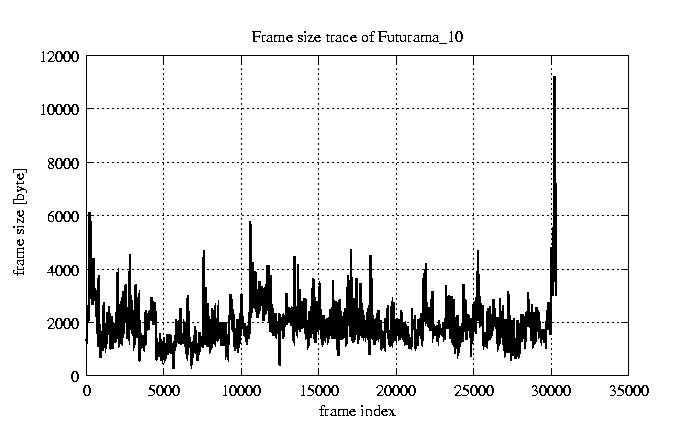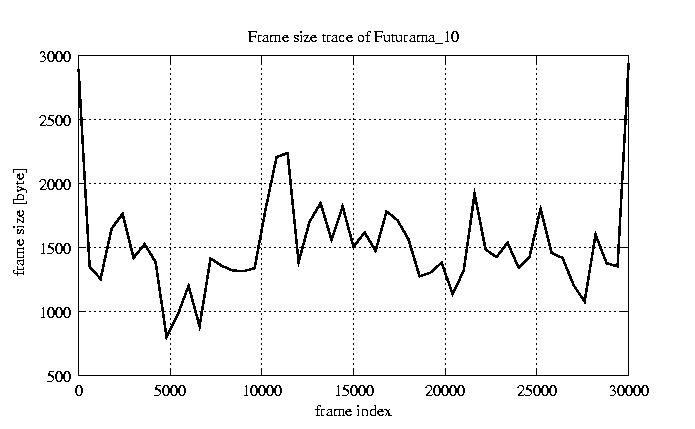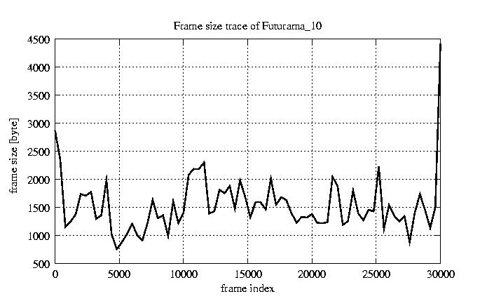 GoP statistics # of GoPs - 2527 mean GoP size byte 1.8e+04 var GoP size - 8.5e+07 CoV of GoP size - 0.50 min GoP size byte 2339 max GoP size byte 128760 Mean bit rate bit/sec 3.1e+05 Peak bit rate bit/sec 2.1e+06 Peak/Mean of bit rate - 6.97