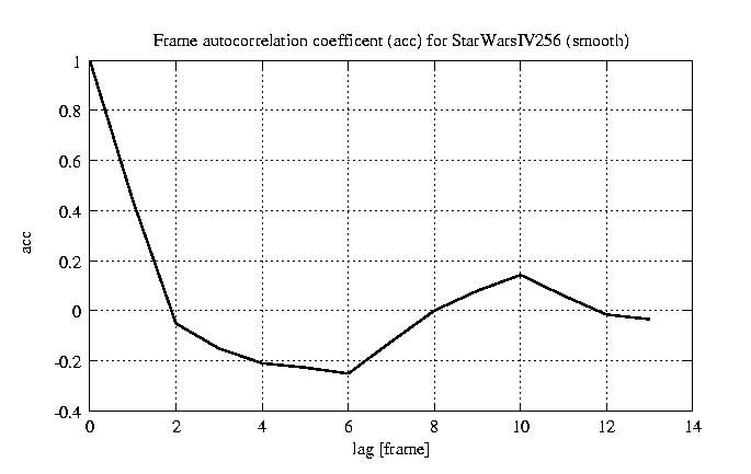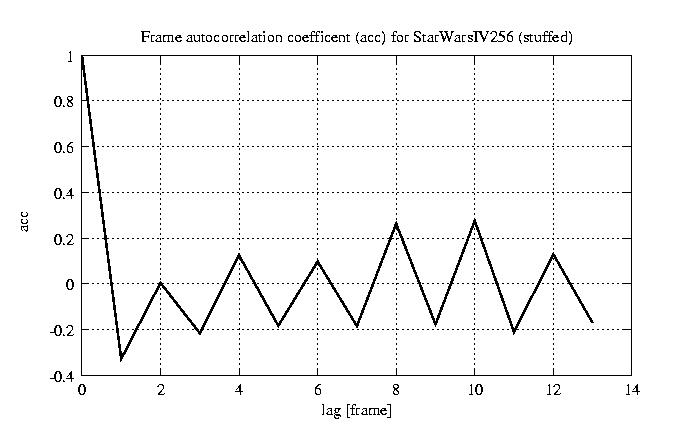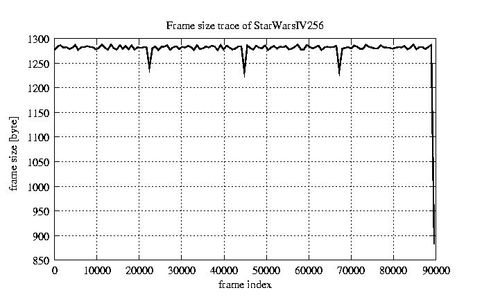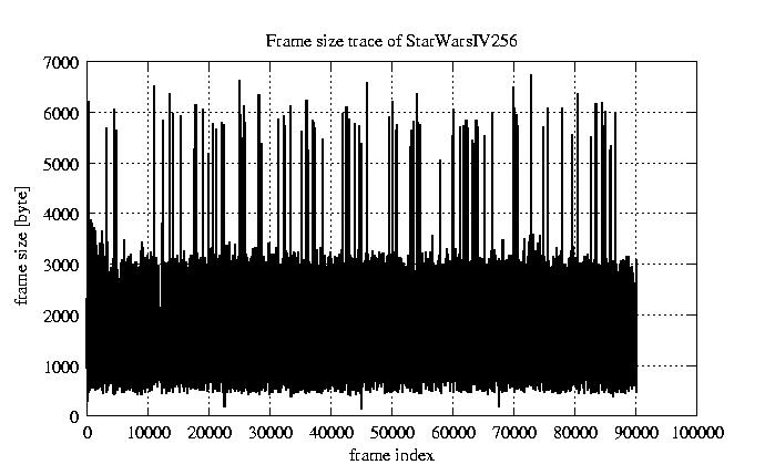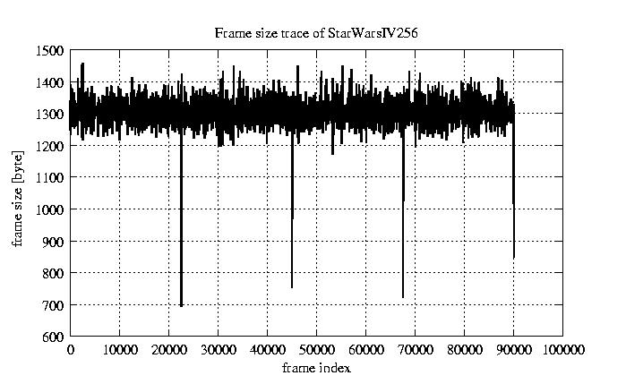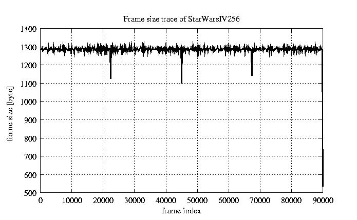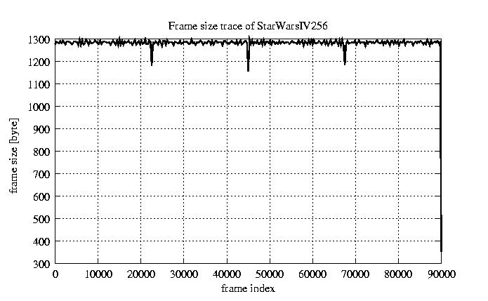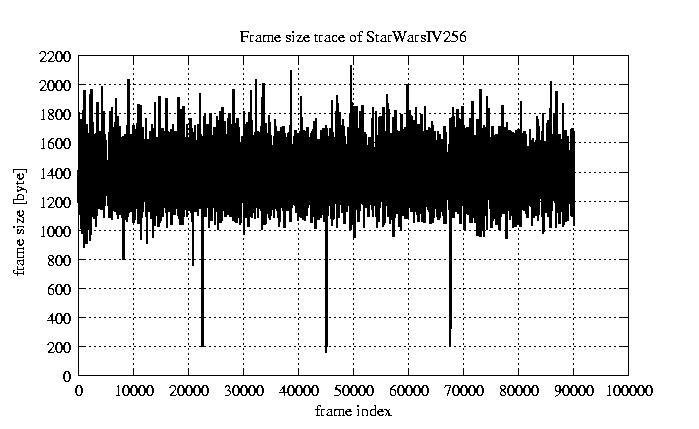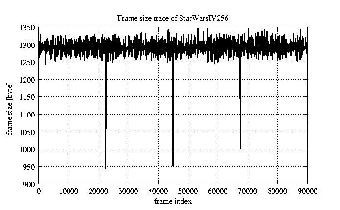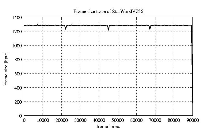 Frames, stuffed Rates Frames, original compression ratio YUV:H263 29.73 29.73 File size byte 1.2e+08 1.2e+08 Video run time msec 3.6e+06 3.6e+06 3.6e+06 # of Frames - 90082.00 25243.00 mean frame size byte 1278.80 4563.53 var frame size - 4829246.85 2243592.43 CoV of frame size - 1.72 0.33 min frame size byte 0.00 579.00 max frame size byte 16318.00 16318.00 Peak/Mean frame - 12.76 3.58 Mean bit rate bit/sec 2.6e+05 Peak bit rate bit/sec 1.3e+06 Peak/Mean of bit rate - 5.3 CoV of bit rate - 0.47 max inter frame space frames 1.00 31.00
