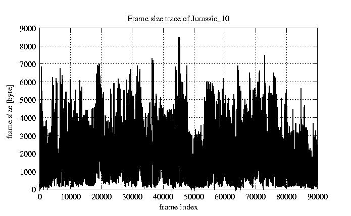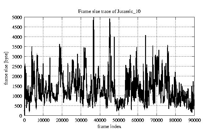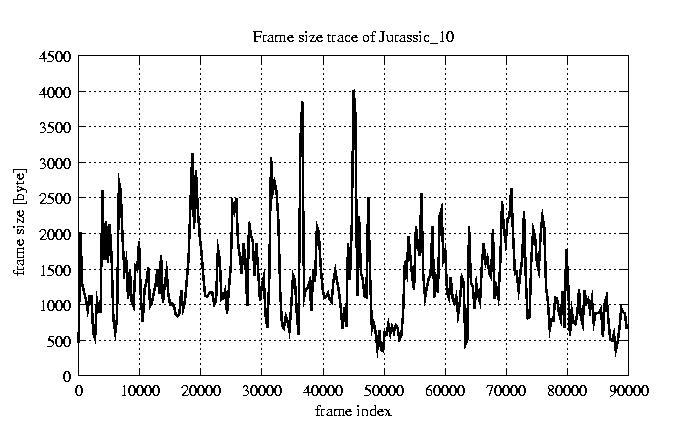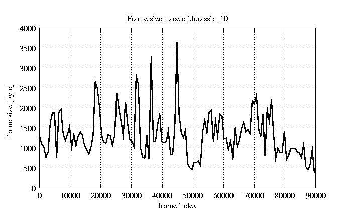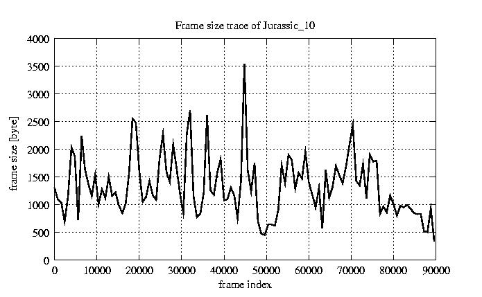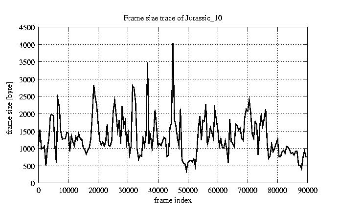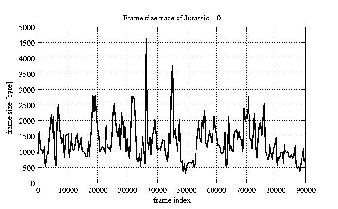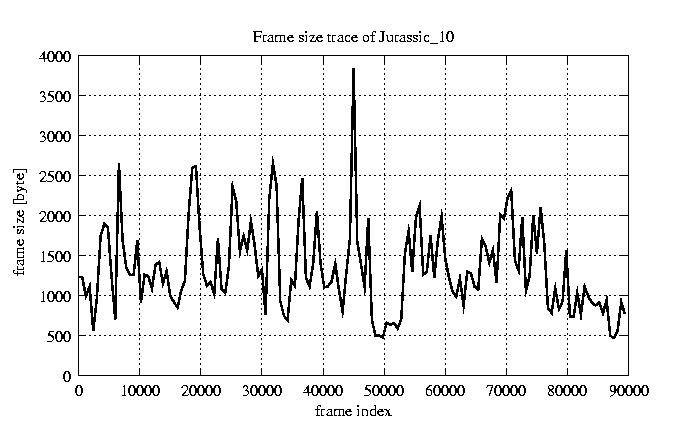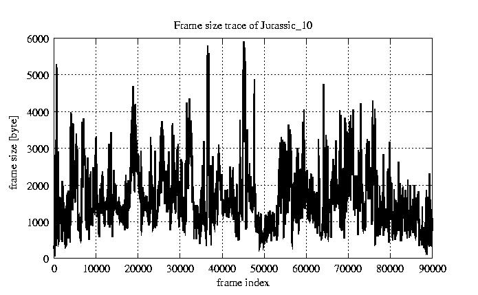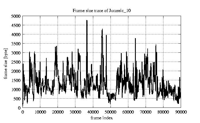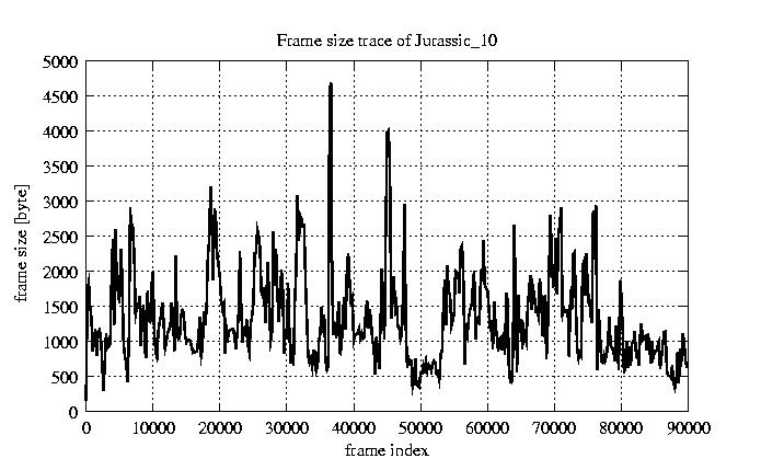 GoP statistics # of GoPs - 7499 mean GoP size byte 1.6e+04 var GoP size - 8.5e+07 CoV of GoP size - 0.57 min GoP size byte 851 max GoP size byte 62889 Mean bit rate bit/sec 2.7e+05 Peak bit rate bit/sec 1e+06 Peak/Mean of bit rate - 3.92