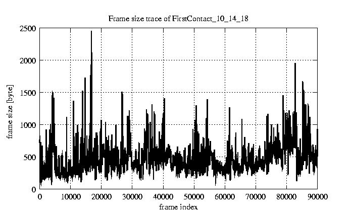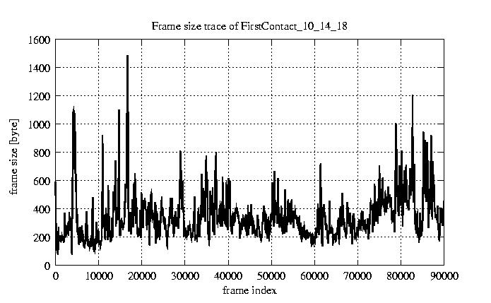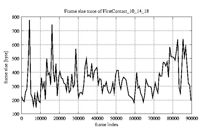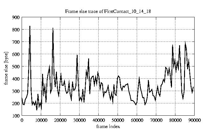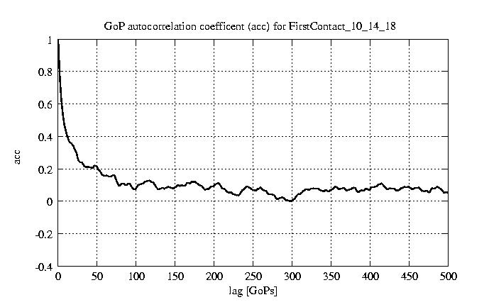 GoP statistics # of GoPs - 7499 mean GoP size byte 4.1e+03 var GoP size - 5e+06 CoV of GoP size - 0.54 min GoP size byte 868 max GoP size byte 24815 Mean bit rate bit/sec 6.9e+04 Peak bit rate bit/sec 4.1e+05 Peak/Mean of bit rate - 6.03
