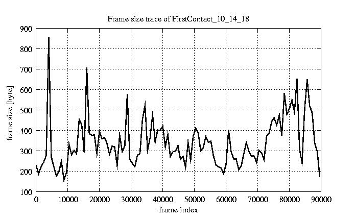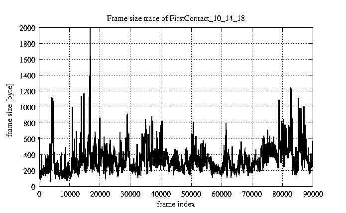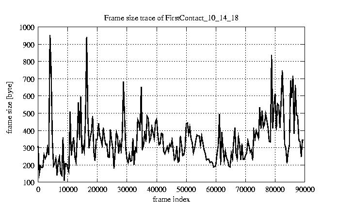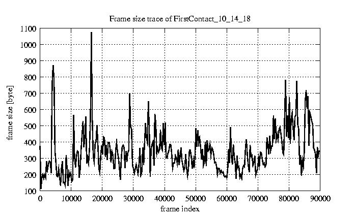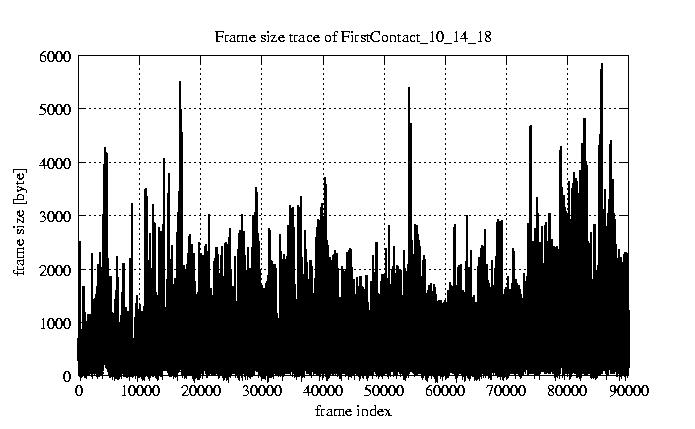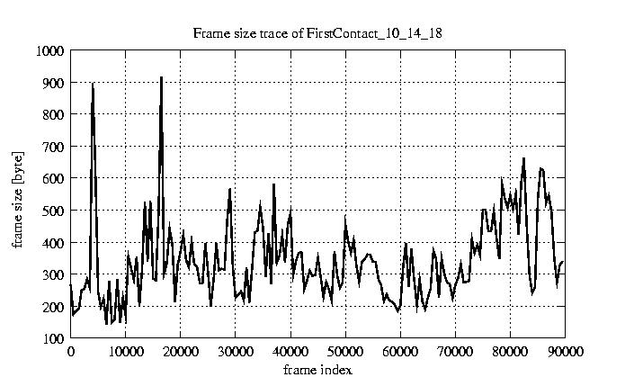 Frame statistics compression ratio YUV:MP4 110.94 File Size byte 3.1e+07 Video run time msec 3.6e+06 # of Frames - 89998 mean frame size byte 3.4e+02 var frame size - 2.6e+05 CoV of frame size - 1.50 min frame size byte 26 max frame size byte 5852 Mean bit rate bit/sec 6.9e+04 Peak bit rate bit/sec 1.2e+06 Peak/Mean of bit rate - 17.08
