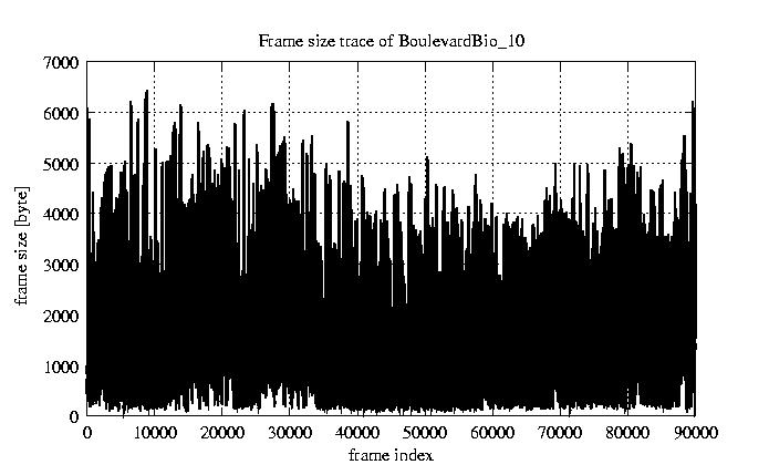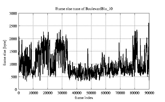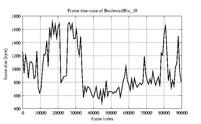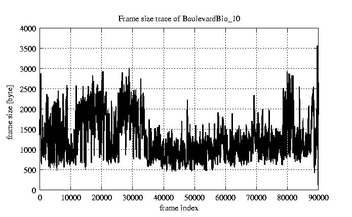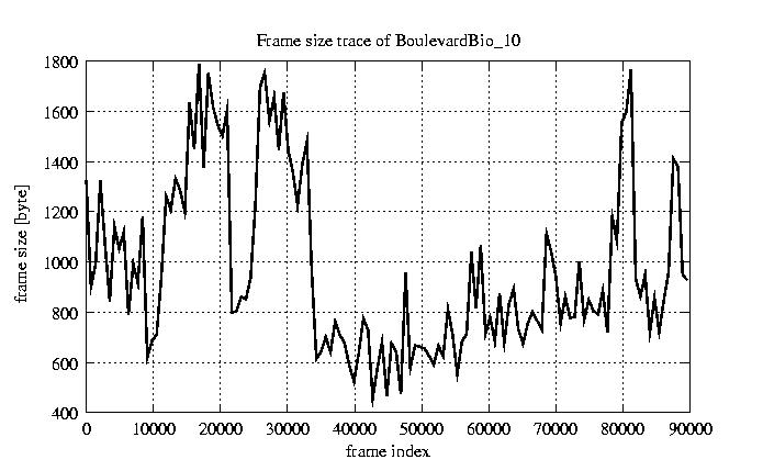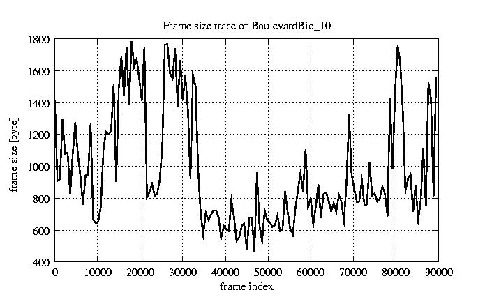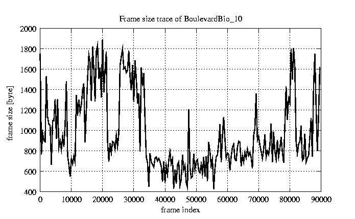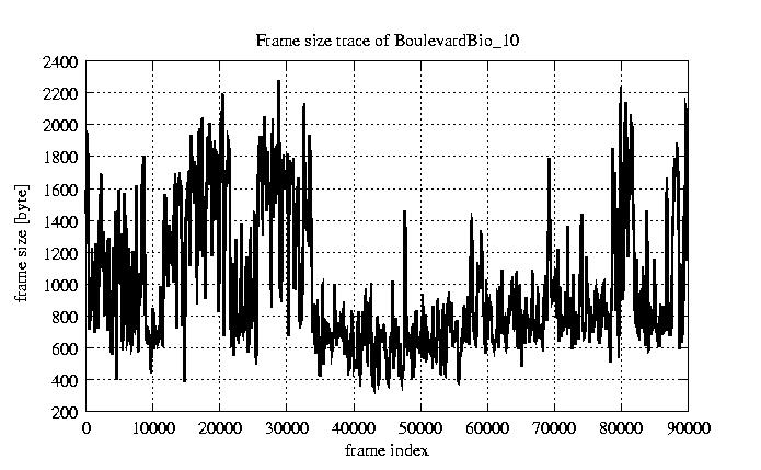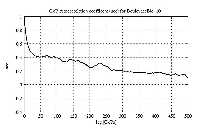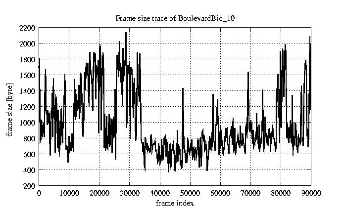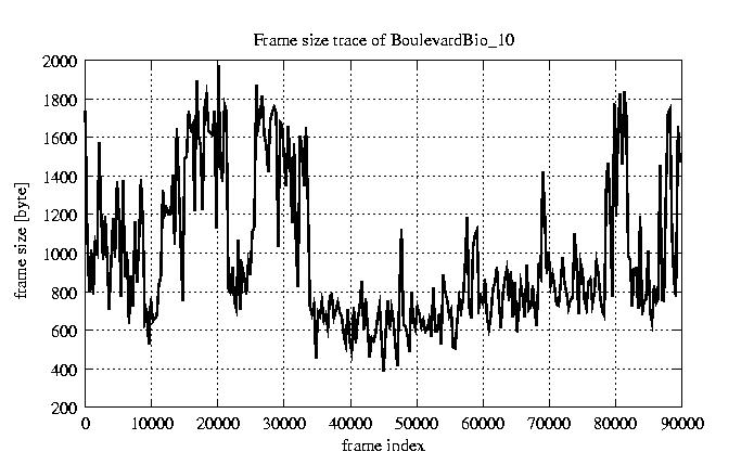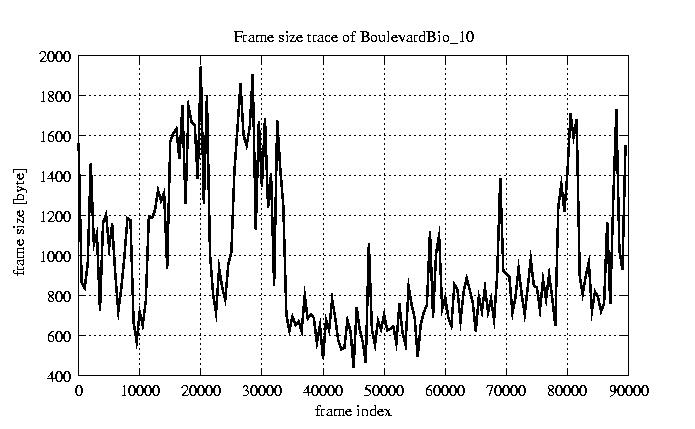 GoP statistics # of GoPs - 7499 mean GoP size byte 1.2e+04 var GoP size - 3.1e+07 CoV of GoP size - 0.47 min GoP size byte 1053 max GoP size byte 36767 Mean bit rate bit/sec 1.9e+05 Peak bit rate bit/sec 6.1e+05 Peak/Mean of bit rate - 3.15
