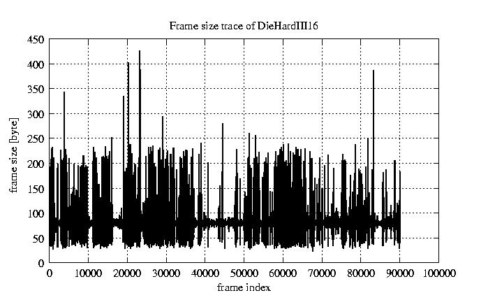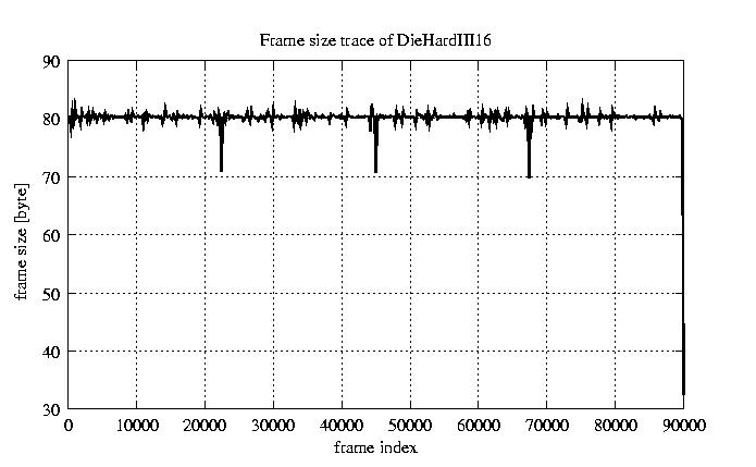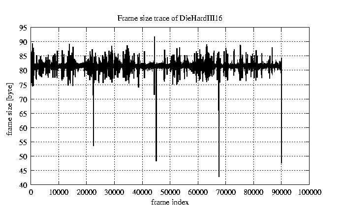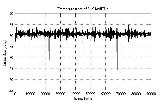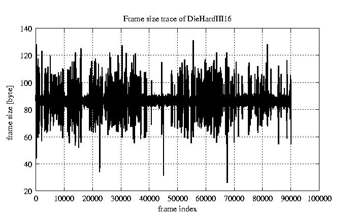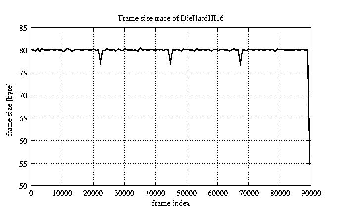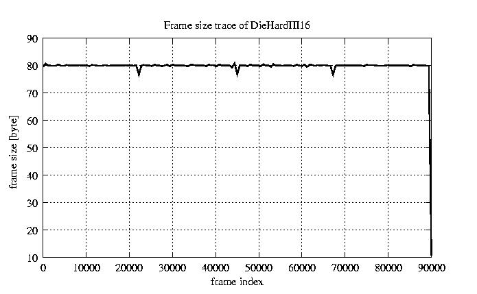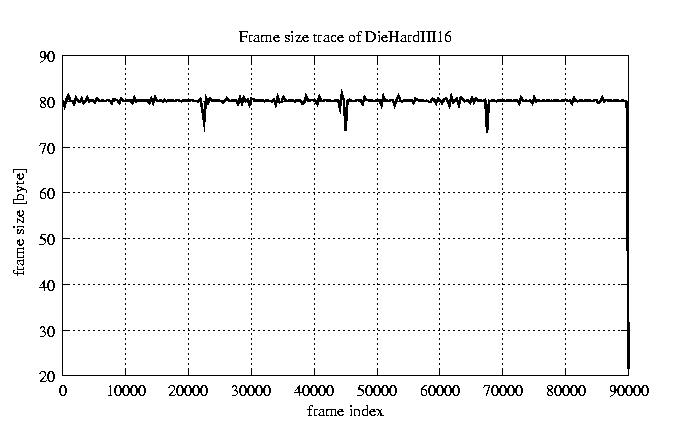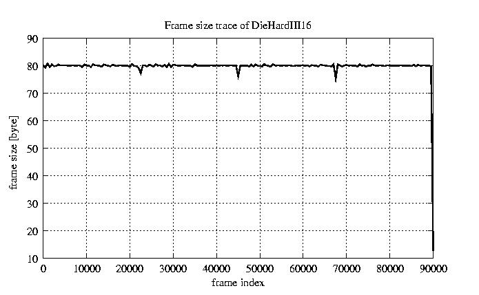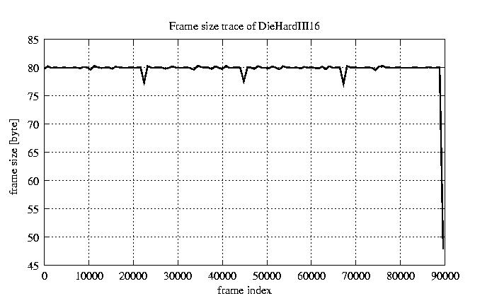 Frames, stuffed Rates Frames, original compression ratio YUV:H263 476.30 476.30 File size byte 7.2e+06 7.2e+06 Video run time msec 3.6e+06 3.6e+06 3.6e+06 # of Frames - 90079.00 15408.00 mean frame size byte 79.82 466.64 var frame size - 49503.79 108911.28 CoV of frame size - 2.79 0.71 min frame size byte 0.00 36.00 max frame size byte 3614.00 3614.00 Peak/Mean frame - 45.28 7.74 Mean bit rate bit/sec 1.6e+04 Peak bit rate bit/sec 8.5e+04 Peak/Mean of bit rate - 5.3 CoV of bit rate - 0.24 max inter frame space frames 1.00 45.00