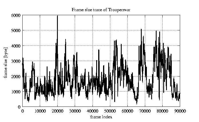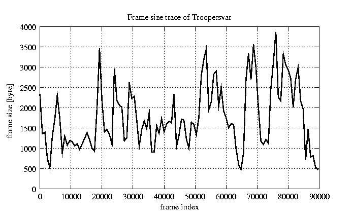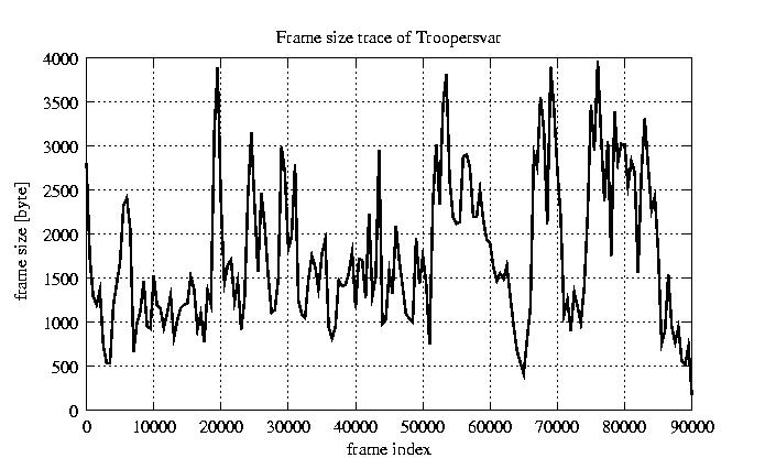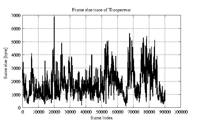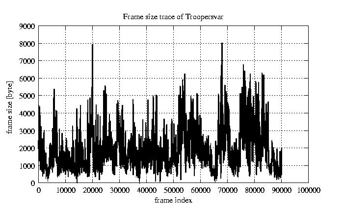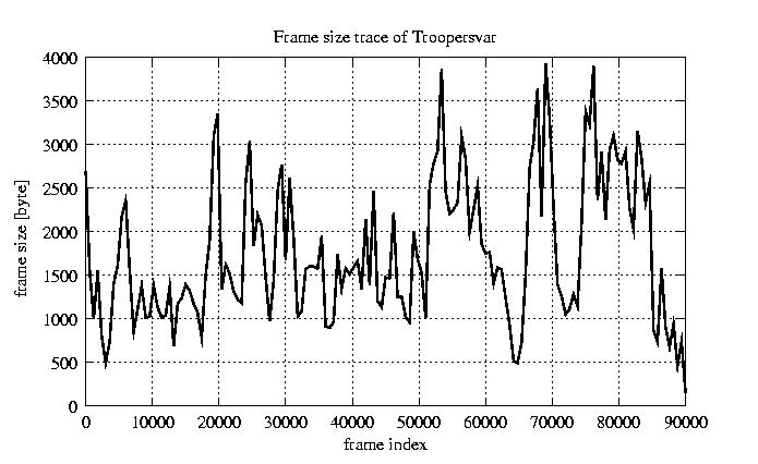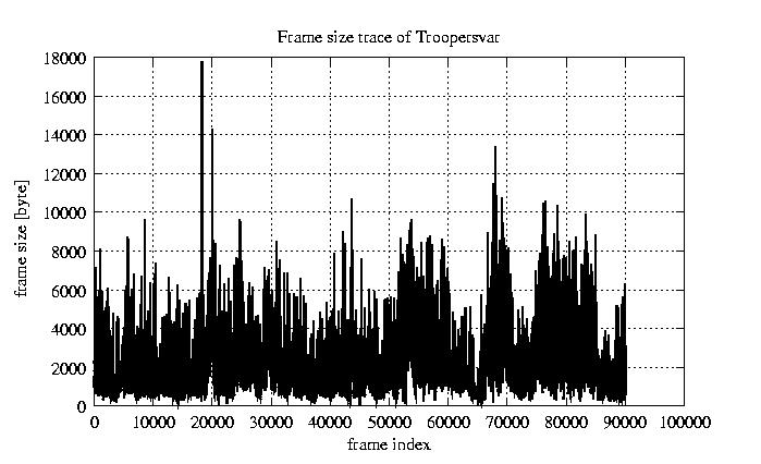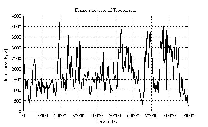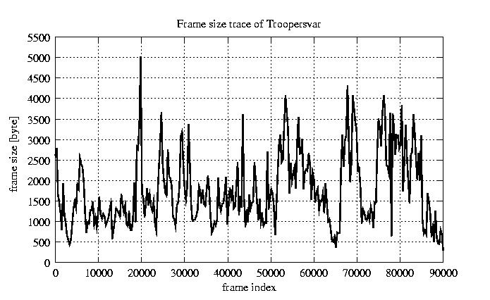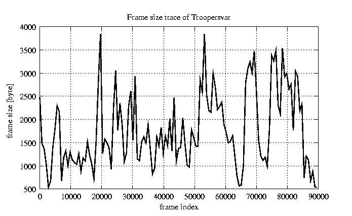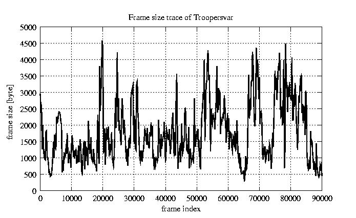 Frames, stuffed Rates Frames, original compression ratio YUV:H263 21.50 21.50 File size byte 1.6e+08 1.6e+08 Video run time msec 3.6e+06 3.6e+06 3.6e+06 # of Frames - 90084.00 57474.00 mean frame size byte 1768.16 2771.38 var frame size - 3543904.63 2774324.08 CoV of frame size - 1.06 0.60 min frame size byte 0.00 89.00 max frame size byte 17796.00 17796.00 Peak/Mean frame - 10.06 6.42 Mean bit rate bit/sec 3.5e+05 Peak bit rate bit/sec 3.6e+06 Peak/Mean of bit rate - 10 CoV of bit rate - 0.69 max inter frame space frames 1.00 29.00