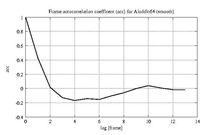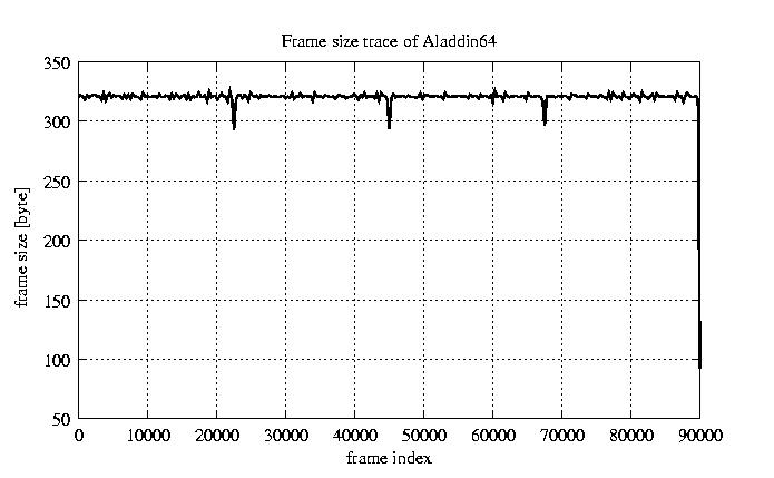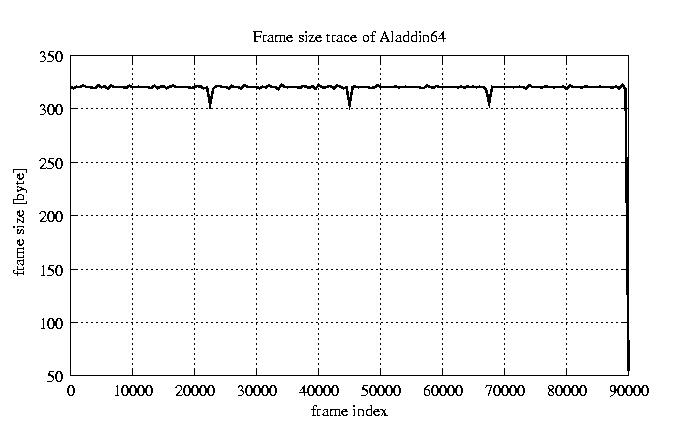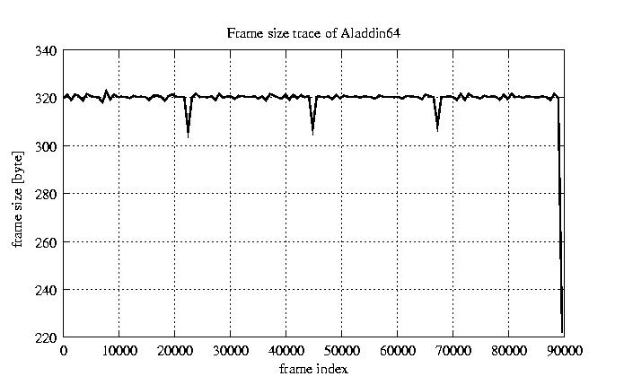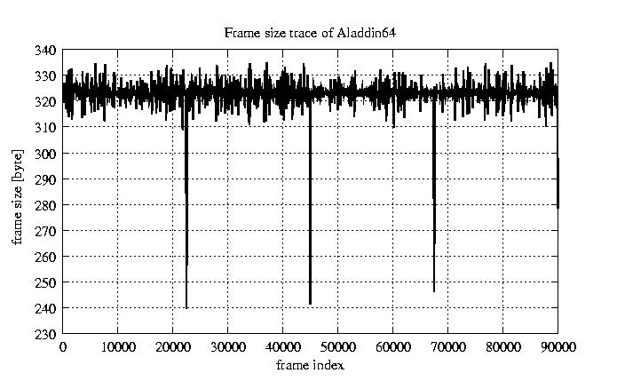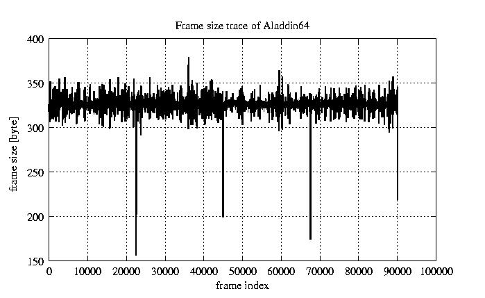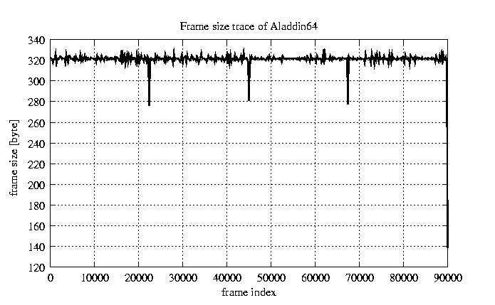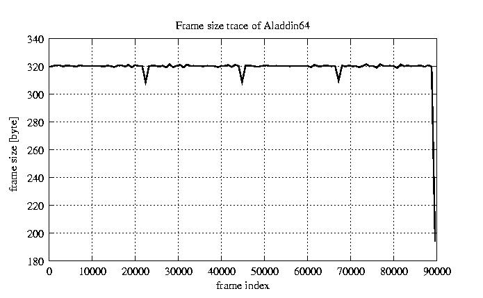 Frames, stuffed Rates Frames, original compression ratio YUV:H263 118.96 118.96 File size byte 2.9e+07 2.9e+07 Video run time msec 3.6e+06 3.6e+06 3.6e+06 # of Frames - 90083.00 30921.00 mean frame size byte 319.59 931.06 var frame size - 241619.64 134589.08 CoV of frame size - 1.54 0.39 min frame size byte 0.00 19.00 max frame size byte 4448.00 4448.00 Peak/Mean frame - 13.92 4.78 Mean bit rate bit/sec 6.4e+04 Peak bit rate bit/sec 4.2e+05 Peak/Mean of bit rate - 6.5 CoV of bit rate - 0.35 max inter frame space frames 1.00 31.00