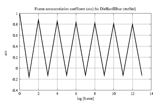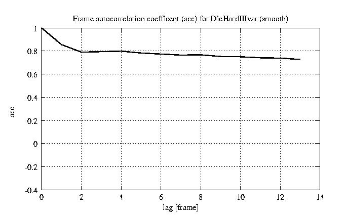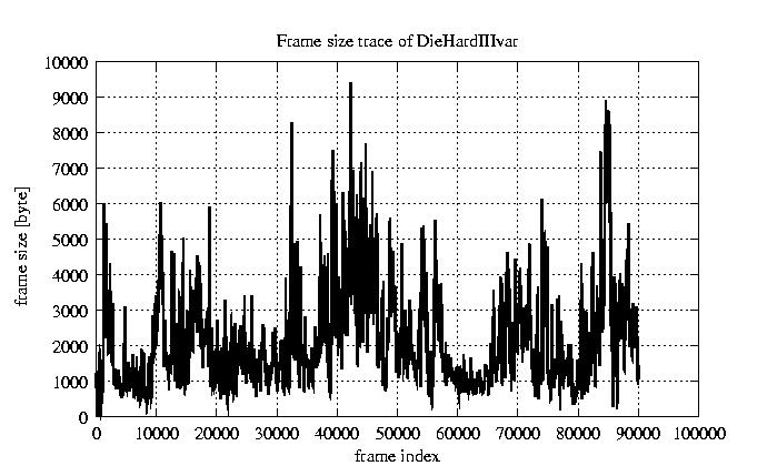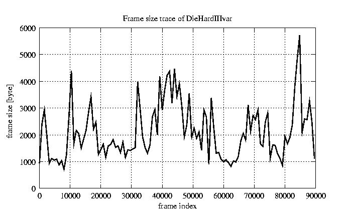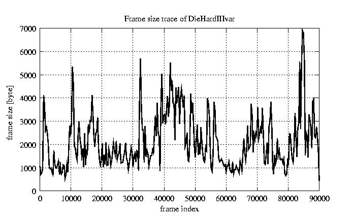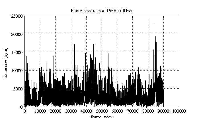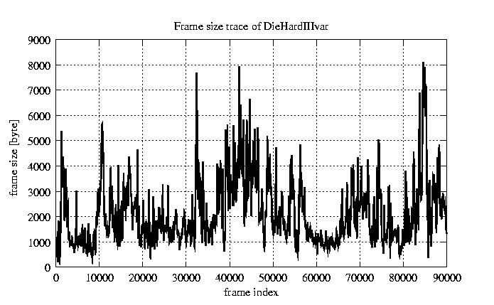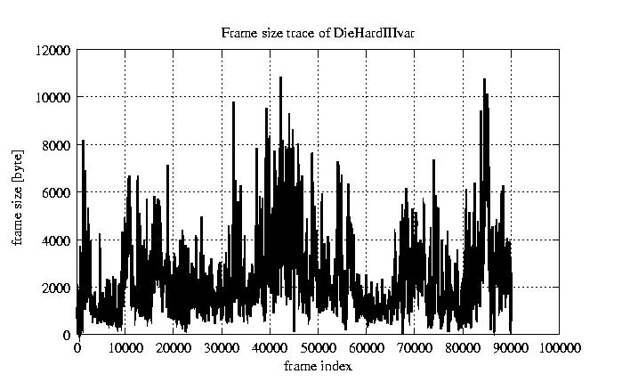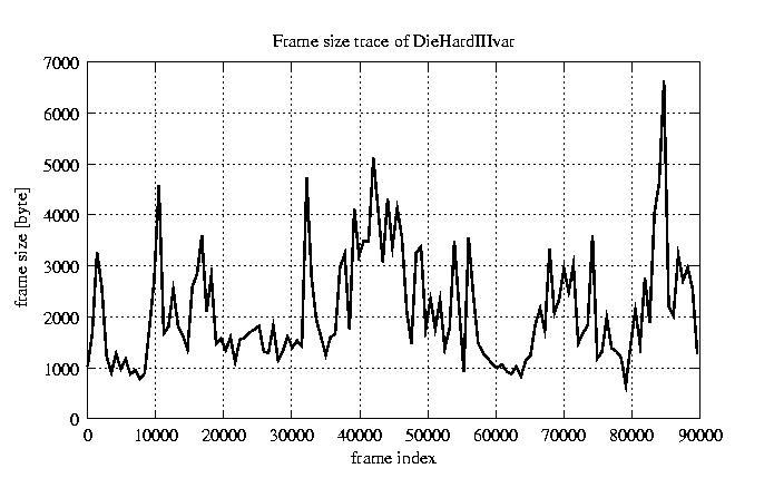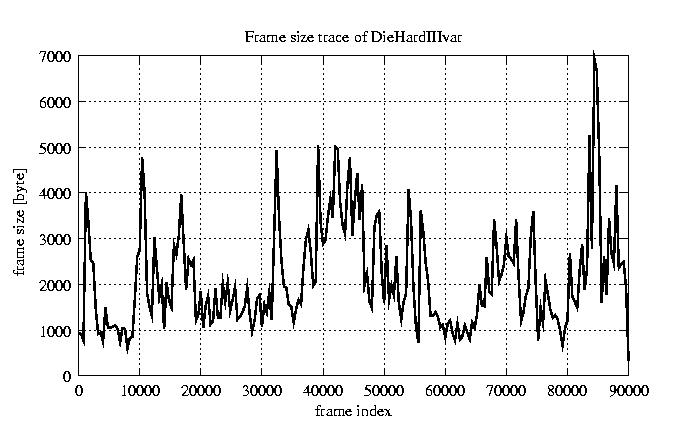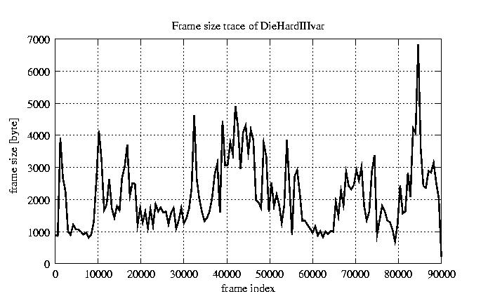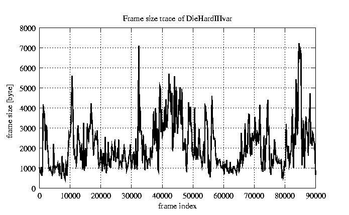 Frames, stuffed Rates Frames, original compression ratio YUV:H263 17.87 17.87 File size byte 1.9e+08 1.9e+08 Video run time msec 3.6e+06 3.6e+06 3.6e+06 # of Frames - 90084.00 59049.00 mean frame size byte 2127.56 3245.76 var frame size - 5800720.98 5220043.22 CoV of frame size - 1.13 0.70 min frame size byte 0.00 29.00 max frame size byte 22785.00 22785.00 Peak/Mean frame - 10.71 7.02 Mean bit rate bit/sec 4.3e+05 Peak bit rate bit/sec 4.6e+06 Peak/Mean of bit rate - 11 CoV of bit rate - 0.76 max inter frame space frames 1.00 29.00