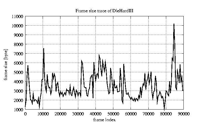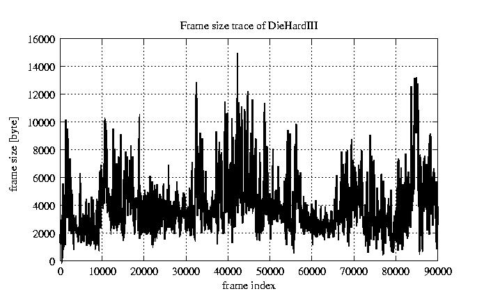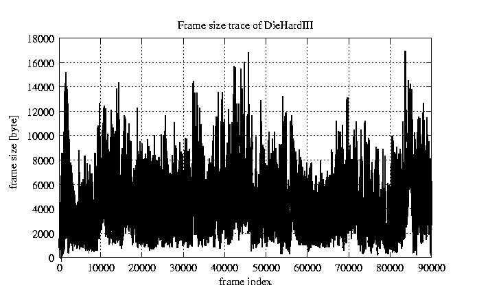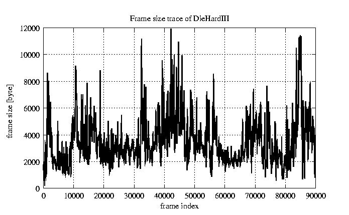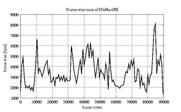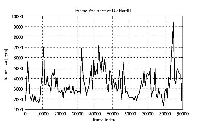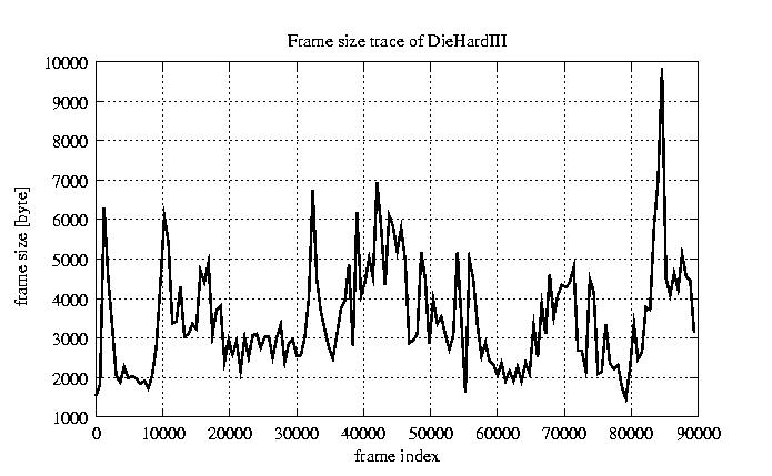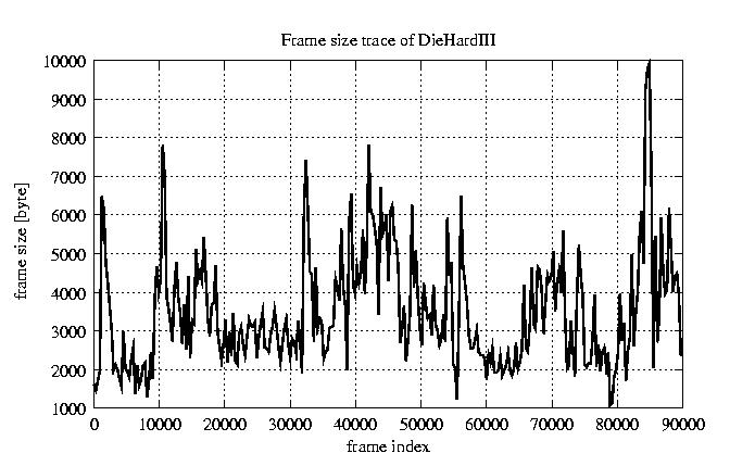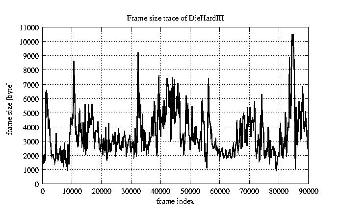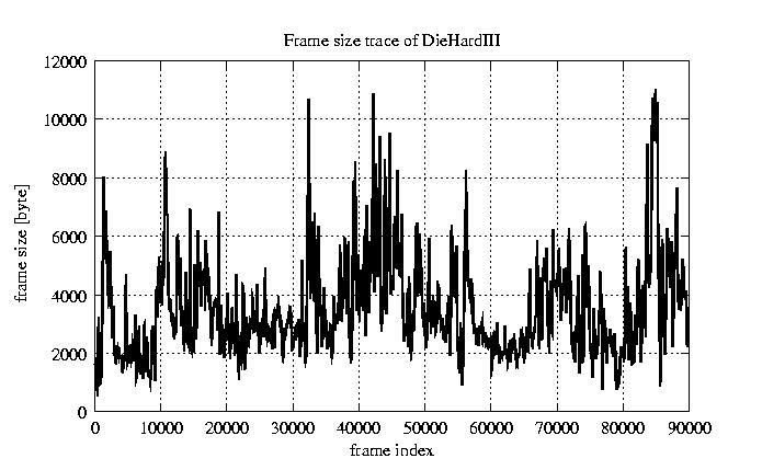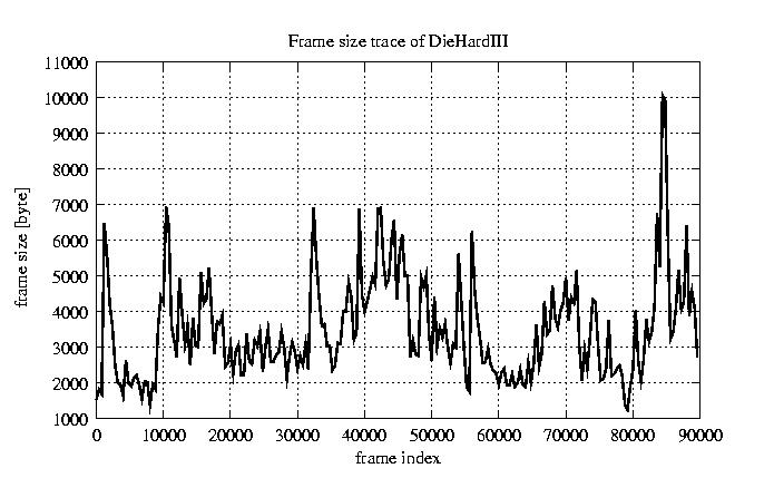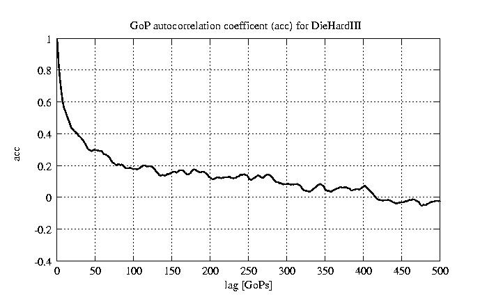 GoP statistics # of GoPs - 7499 mean GoP size byte 4.2e+04 var GoP size - 4.9e+08 CoV of GoP size - 0.53 min GoP size byte 2034 max GoP size byte 164975 Mean bit rate bit/sec 7e+05 Peak bit rate bit/sec 2.7e+06 Peak/Mean of bit rate - 3.94