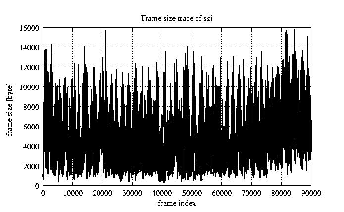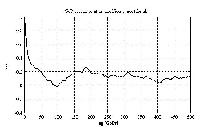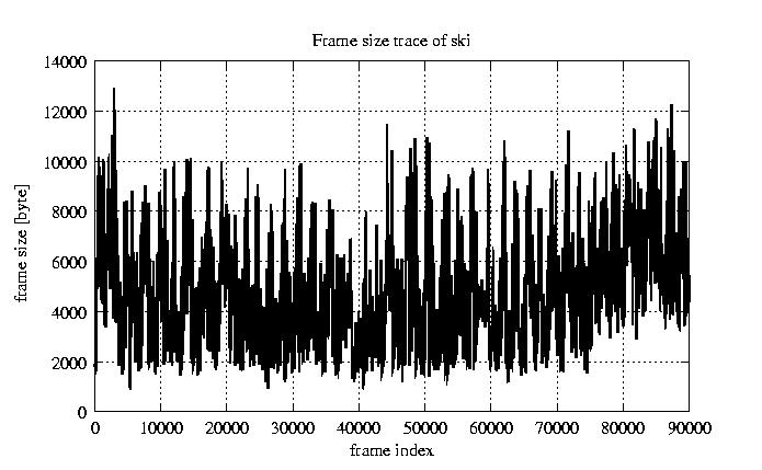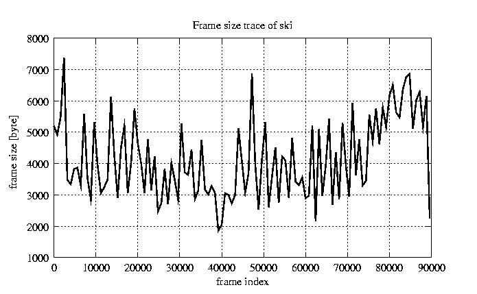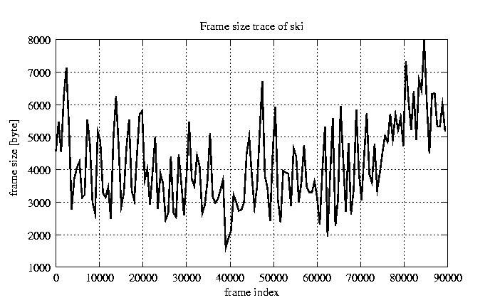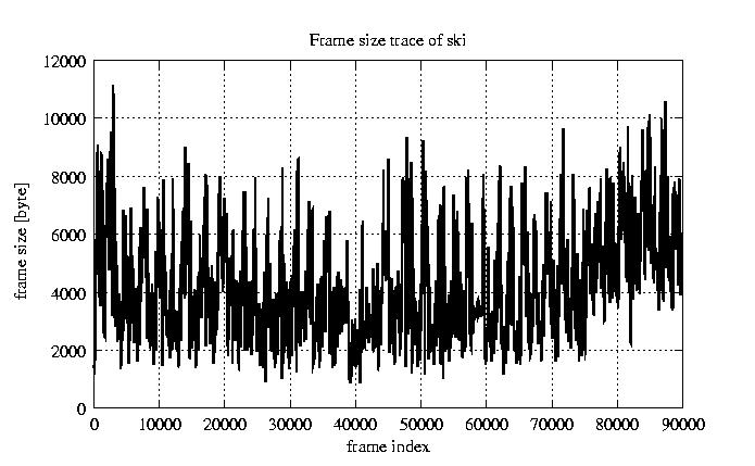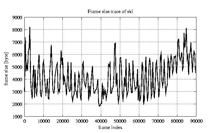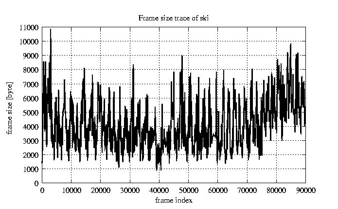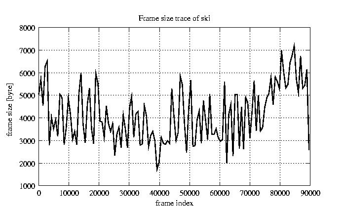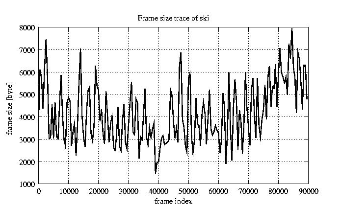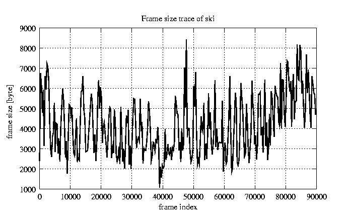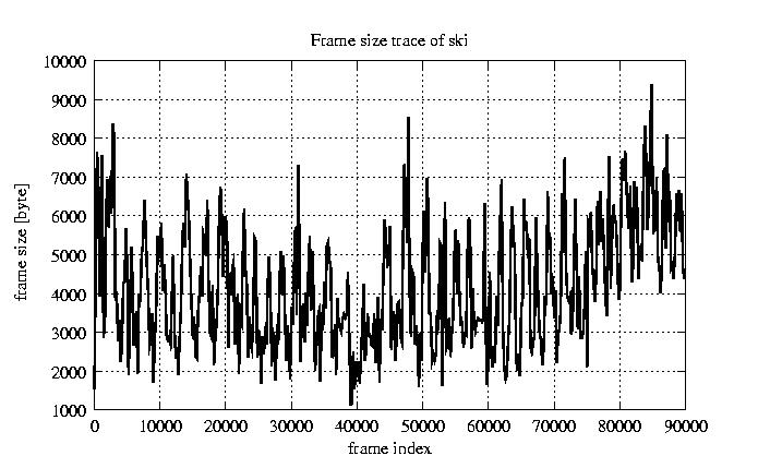 GoP statistics # of GoPs - 7499 mean GoP size byte 5e+04 var GoP size - 5.5e+08 CoV of GoP size - 0.47 min GoP size byte 8704 max GoP size byte 140444 Mean bit rate bit/sec 8.3e+05 Peak bit rate bit/sec 2.3e+06 Peak/Mean of bit rate - 2.82