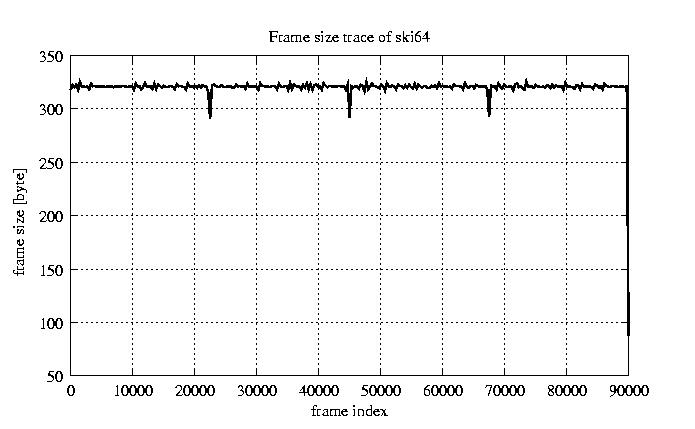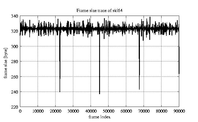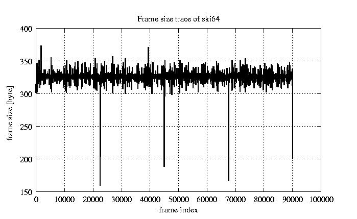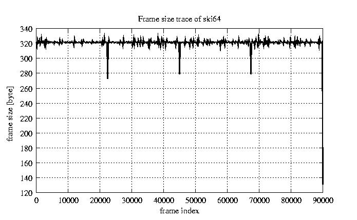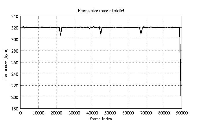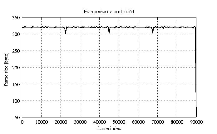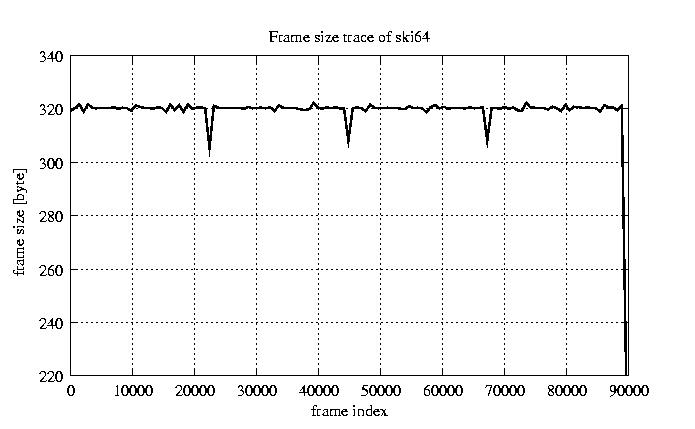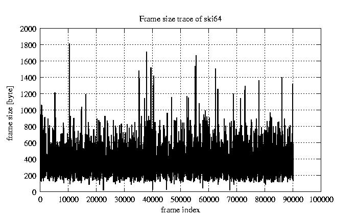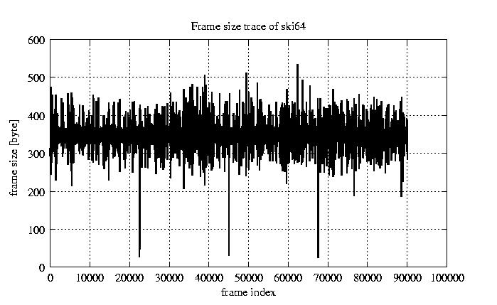 Frames, stuffed Rates Frames, original compression ratio YUV:H263 118.96 118.96 File size byte 2.9e+07 2.9e+07 Video run time msec 3.6e+06 3.6e+06 3.6e+06 # of Frames - 90082.00 33121.00 mean frame size byte 319.58 869.19 var frame size - 214501.39 105675.74 CoV of frame size - 1.45 0.37 min frame size byte 0.00 51.00 max frame size byte 5474.00 5474.00 Peak/Mean frame - 17.13 6.30 Mean bit rate bit/sec 6.4e+04 Peak bit rate bit/sec 3.6e+05 Peak/Mean of bit rate - 5.7 CoV of bit rate - 0.3 max inter frame space frames 1.00 33.00