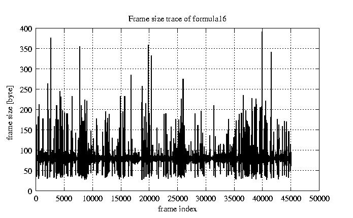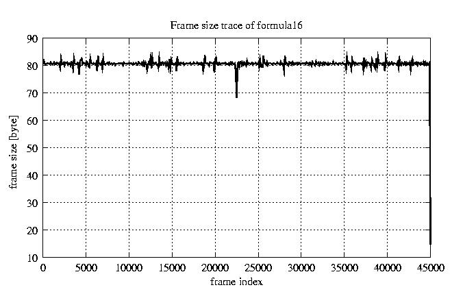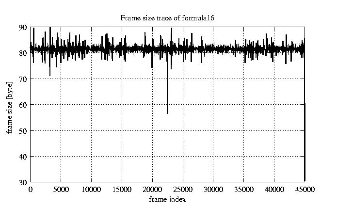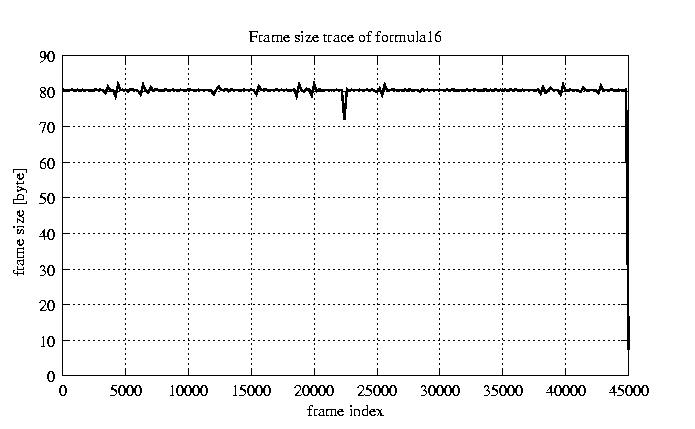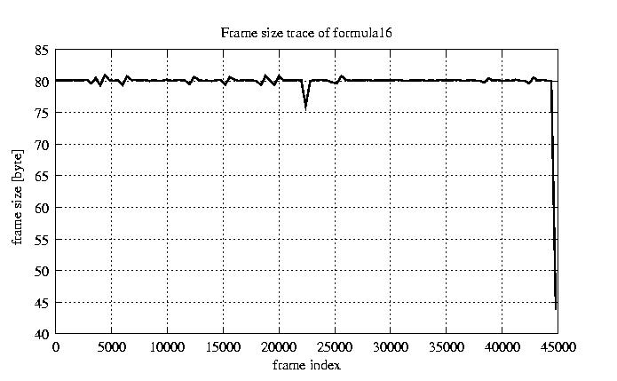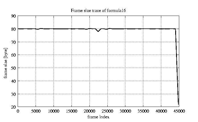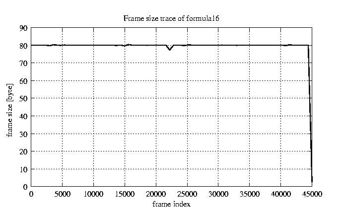Frames, stuffed Rates Frames, original compression ratio YUV:H263 476.07 476.07 File size byte 3.6e+06 3.6e+06 Video run time msec 1.8e+06 1.8e+06 1.8e+06 # of Frames - 45018.00 6937.00 mean frame size byte 79.86 518.23 var frame size - 49646.67 95013.70 CoV of frame size - 2.79 0.59 min frame size byte 0.00 70.00 max frame size byte 4831.00 4831.00 Peak/Mean frame - 60.50 9.32 Mean bit rate bit/sec 1.6e+04 Peak bit rate bit/sec 7.8e+04 Peak/Mean of bit rate - 4.9 CoV of bit rate - 0.21 max inter frame space frames 1.00 60.00