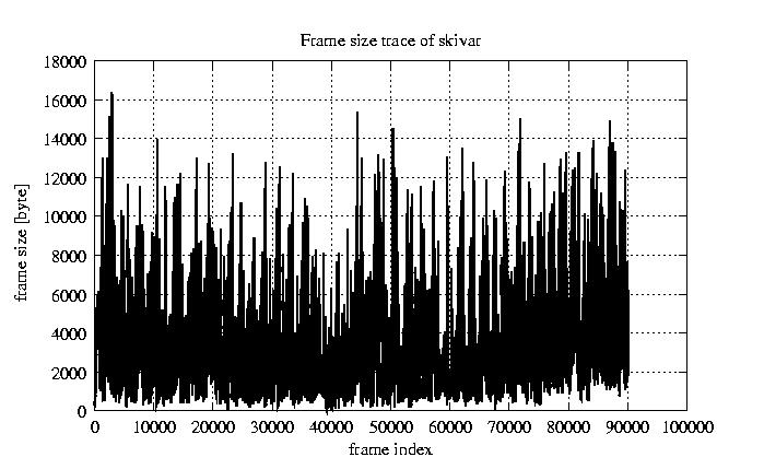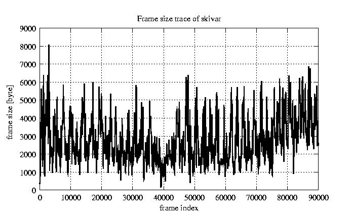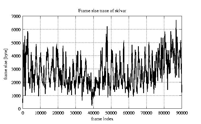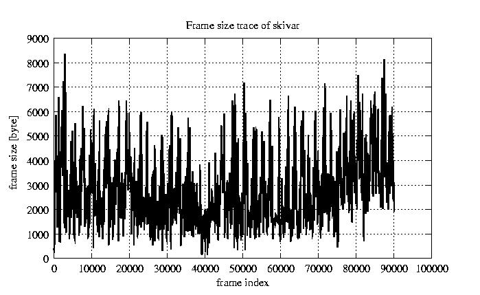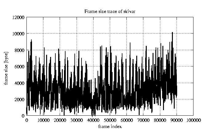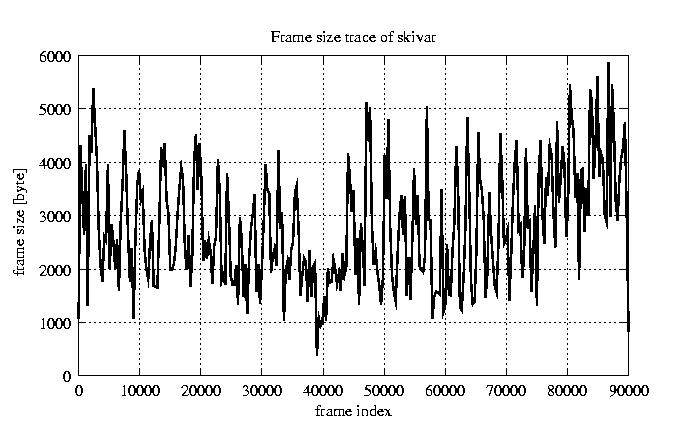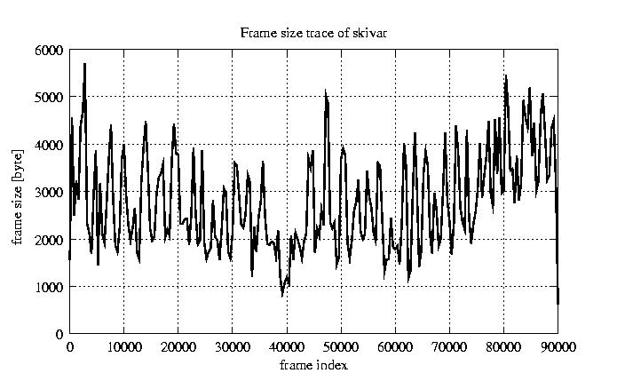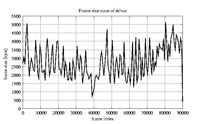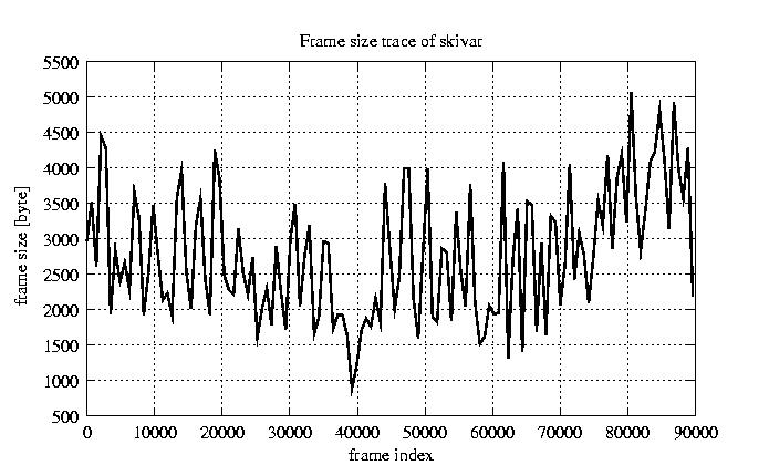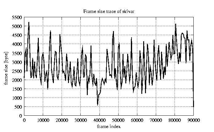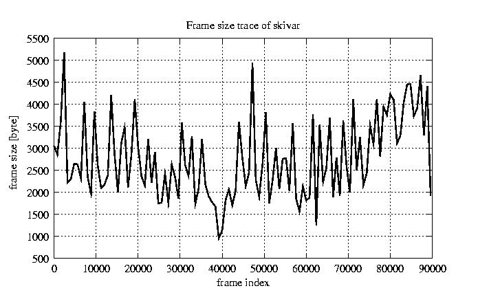Frames, stuffed Rates Frames, original compression ratio YUV:H263 13.70 13.70 File size byte 2.5e+08 2.5e+08 Video run time msec 3.6e+06 3.6e+06 3.6e+06 # of Frames - 90084.00 62328.00 mean frame size byte 2774.90 4010.62 var frame size - 7959677.83 6548268.99 CoV of frame size - 1.02 0.64 min frame size byte 0.00 213.00 max frame size byte 17445.00 17445.00 Peak/Mean frame - 6.29 4.35 Mean bit rate bit/sec 5.5e+05 Peak bit rate bit/sec 3.3e+06 Peak/Mean of bit rate - 5.9 CoV of bit rate - 0.63 max inter frame space frames 1.00 29.00