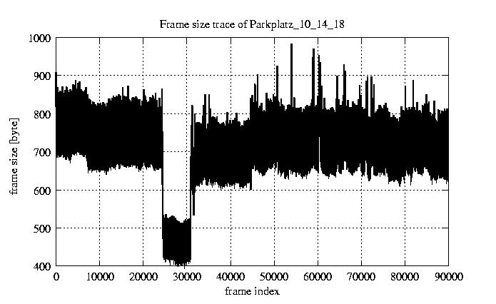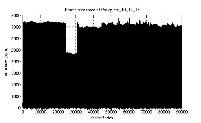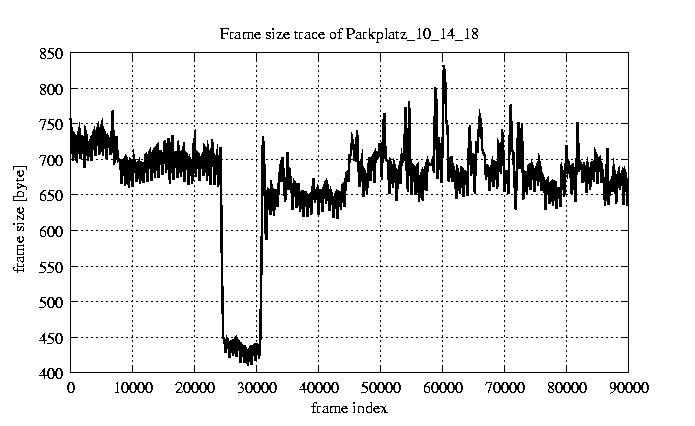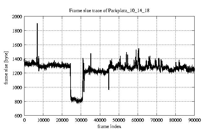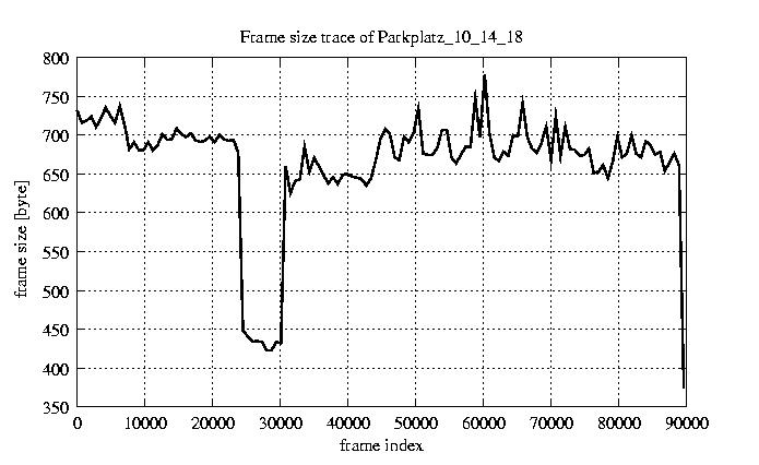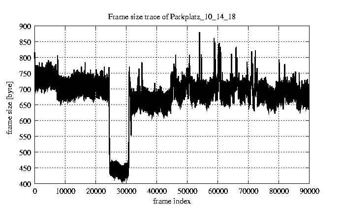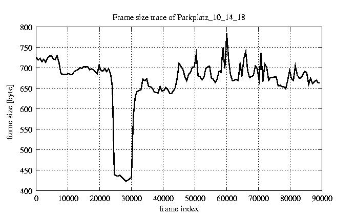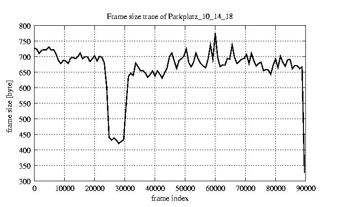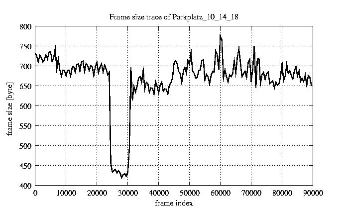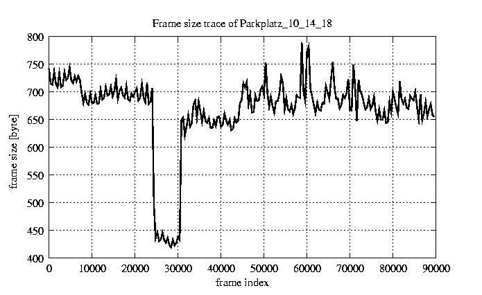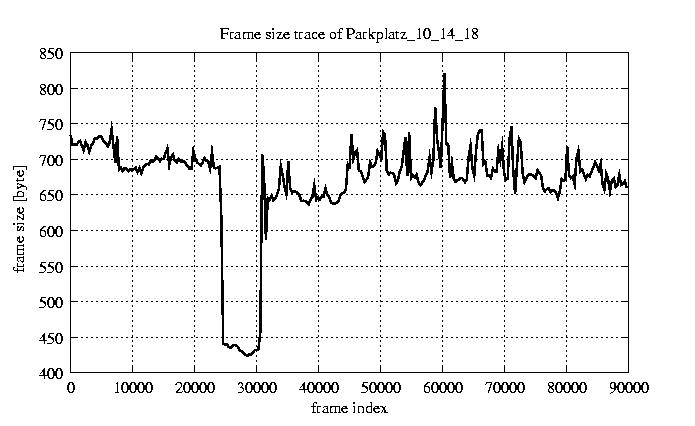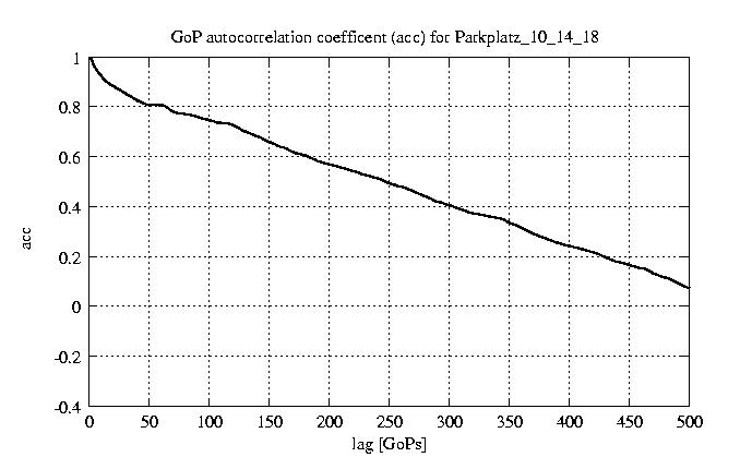 GoP statistics # of GoPs - 7499 mean GoP size byte 8e+03 var GoP size - 7.4e+05 CoV of GoP size - 0.11 min GoP size byte 4992 max GoP size byte 15461 Mean bit rate bit/sec 1.3e+05 Peak bit rate bit/sec 2.6e+05 Peak/Mean of bit rate - 1.94