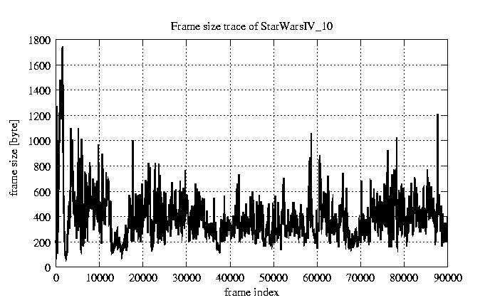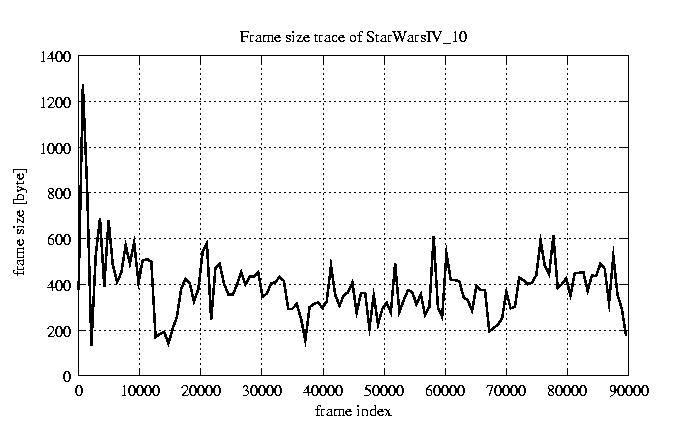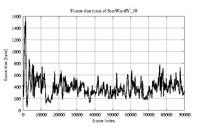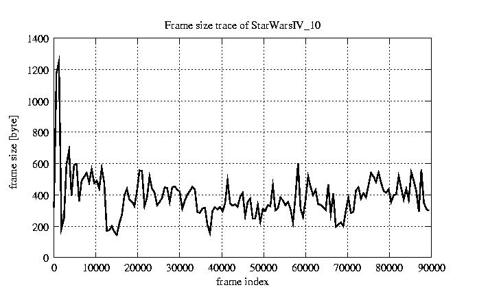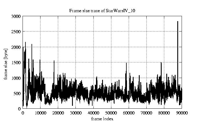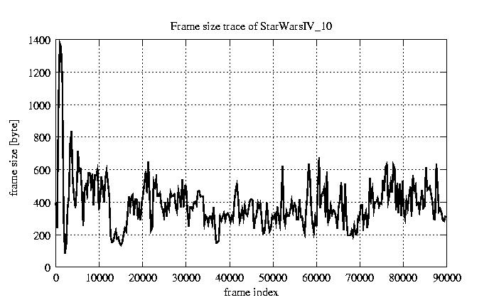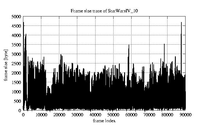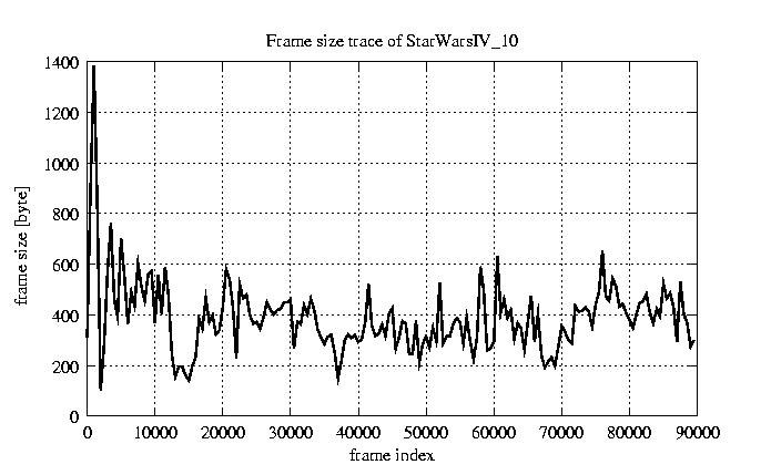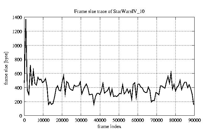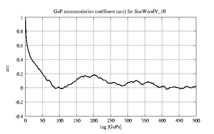 GoP statistics # of GoPs - 7499 mean GoP size byte 4.7e+03 var GoP size - 6e+06 CoV of GoP size - 0.52 min GoP size byte 736 max GoP size byte 29321 Mean bit rate bit/sec 7.8e+04 Peak bit rate bit/sec 4.9e+05 Peak/Mean of bit rate - 6.29
