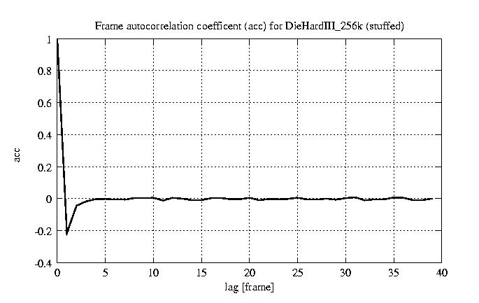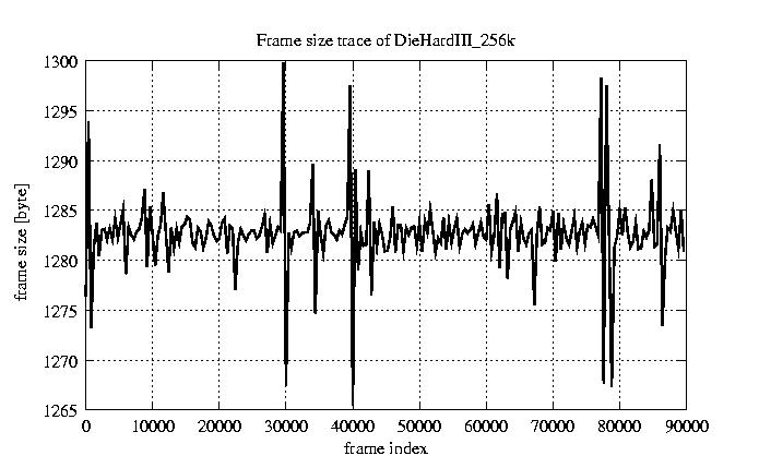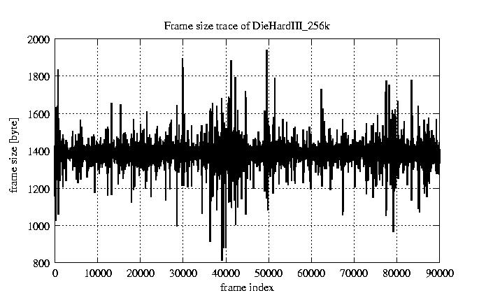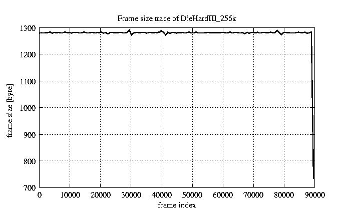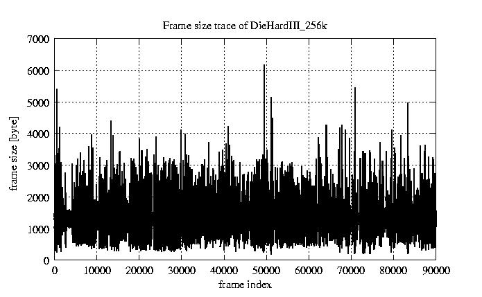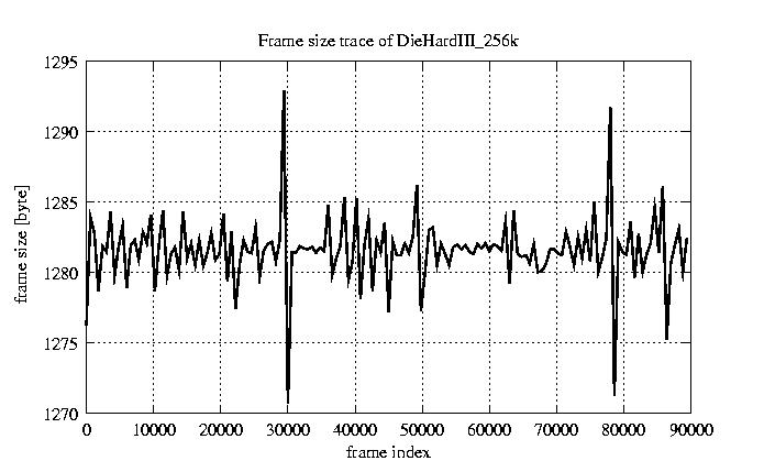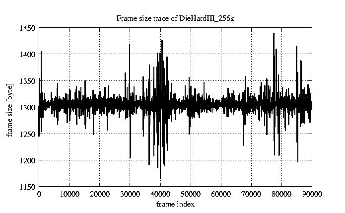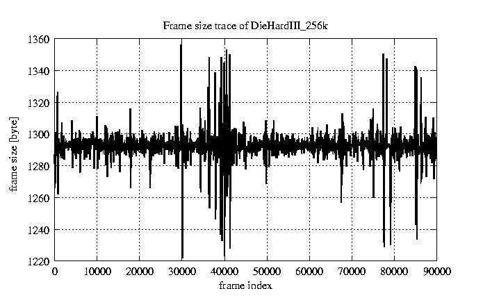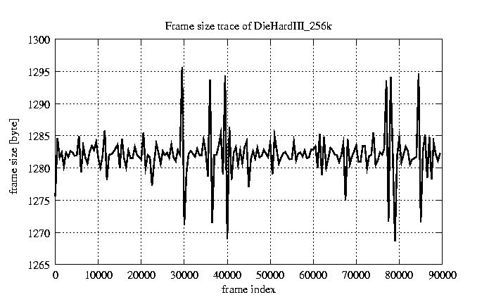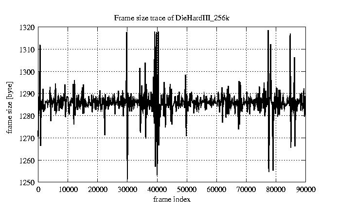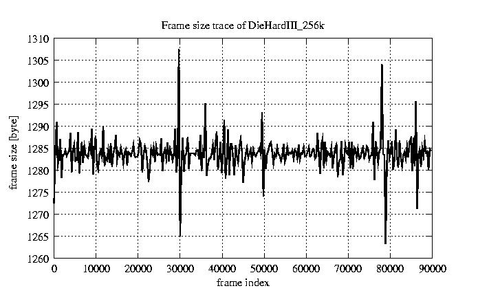Frames Rates compression ratio YUV:H261 29.71 File size byte 1.2e+08 Video run time msec 3.6e+06 3.6e+06 # of Frames - 90000.00 mean frame size byte 1279.45 var frame size - 46816.23 CoV of frame size - 0.17 min frame size byte 187.00 max frame size byte 6171.00 Peak/Mean frame - 4.82 Mean bit rate bit/sec 2.6e+05 Peak bit rate bit/sec 1.2e+06 Peak/Mean of bit rate - 4.8 CoV of bit rate - 0.17 max inter frame space frames 1.00