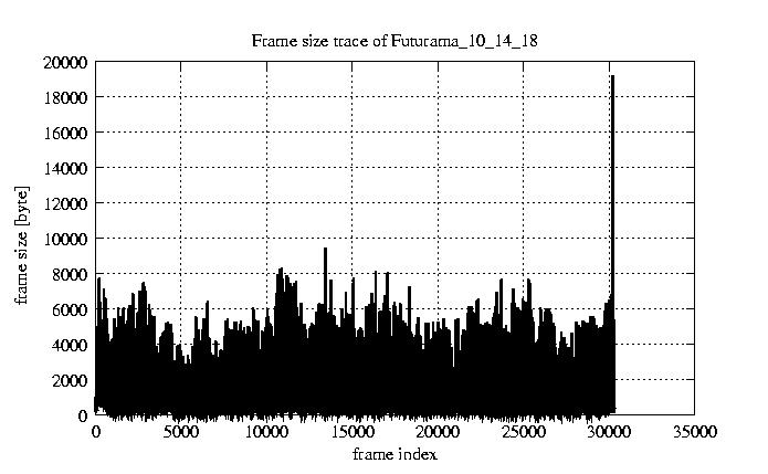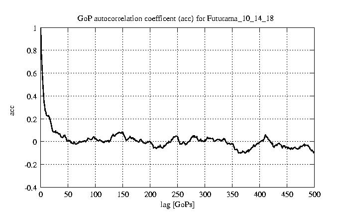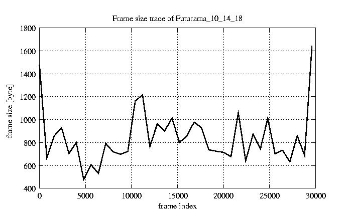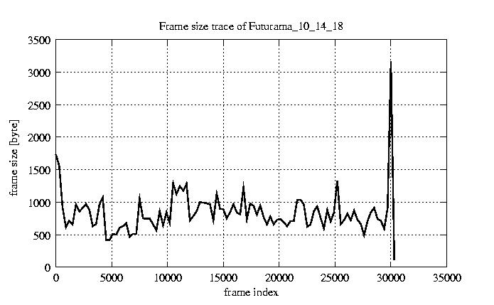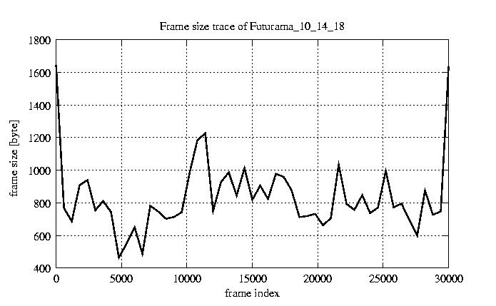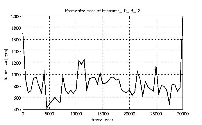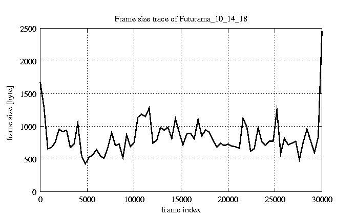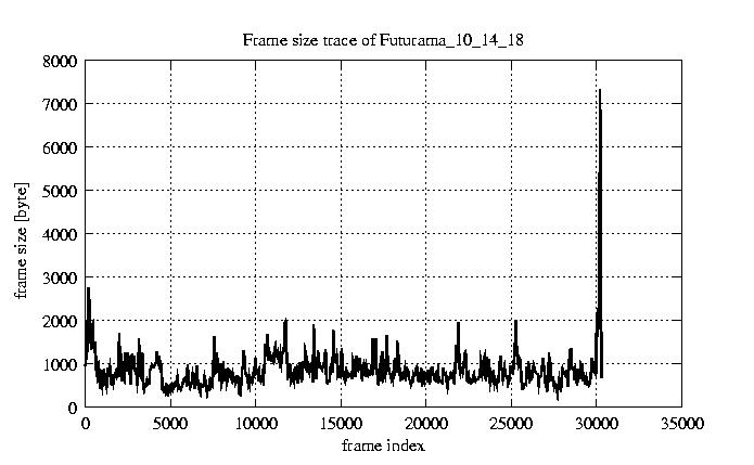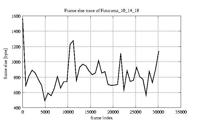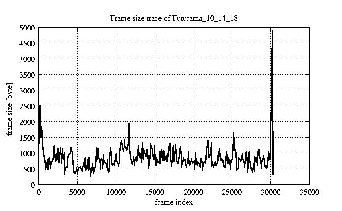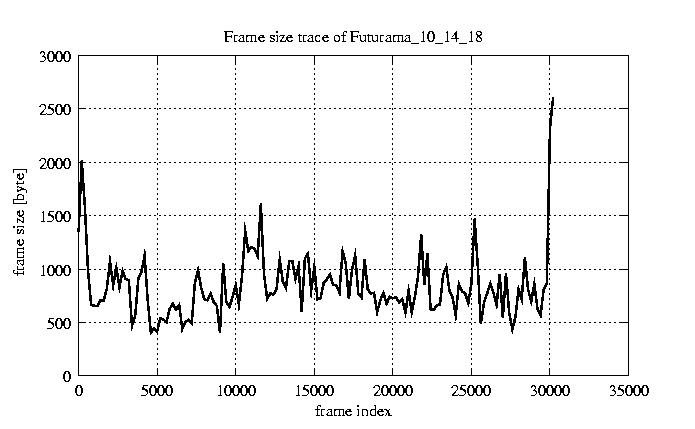GoP statistics # of GoPs - 2527 mean GoP size byte 1e+04 var GoP size - 3.3e+07 CoV of GoP size - 0.57 min GoP size byte 1691 max GoP size byte 116312 Mean bit rate bit/sec 1.7e+05 Peak bit rate bit/sec 1.9e+06 Peak/Mean of bit rate - 11.50