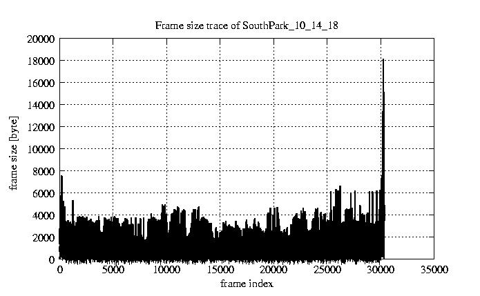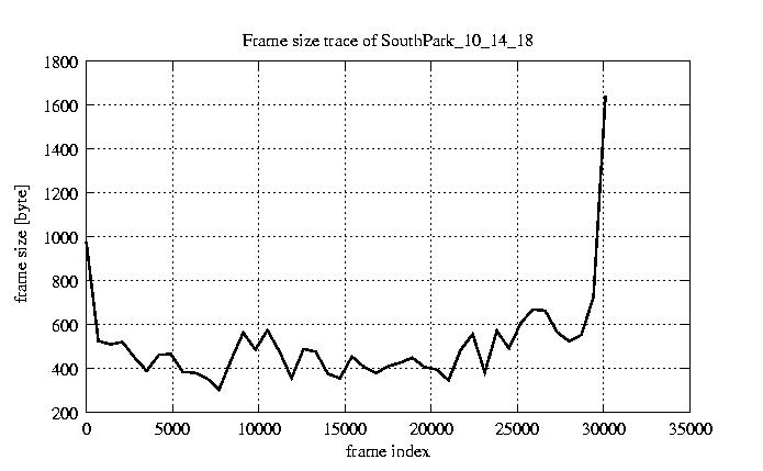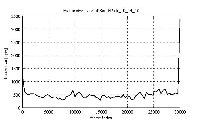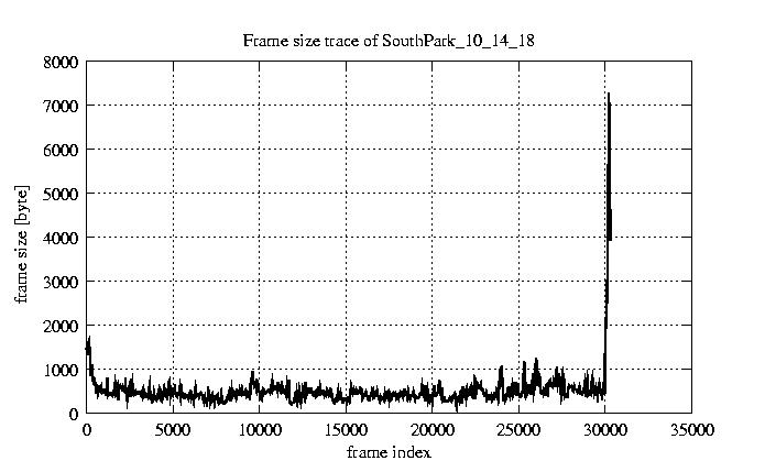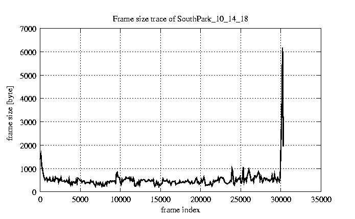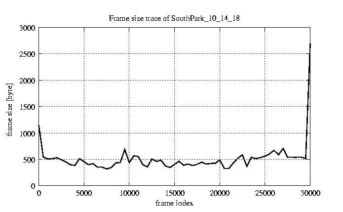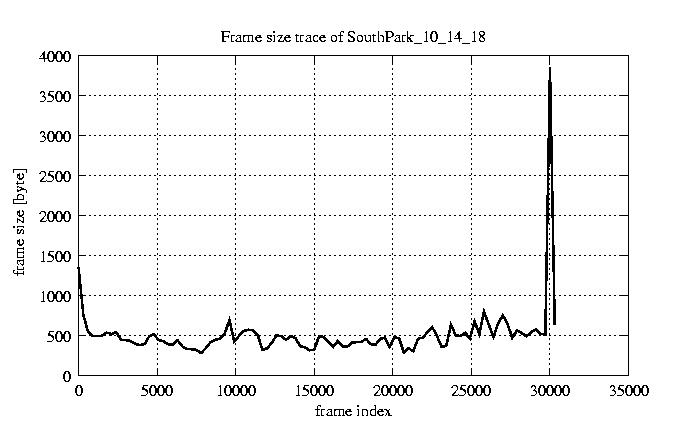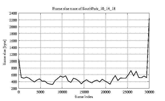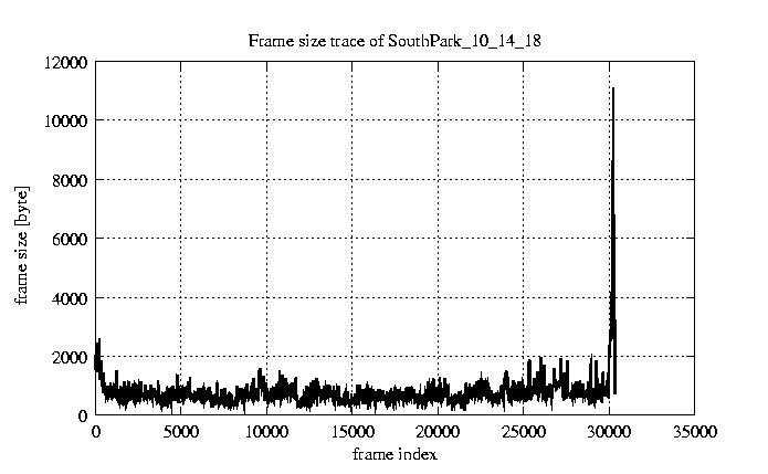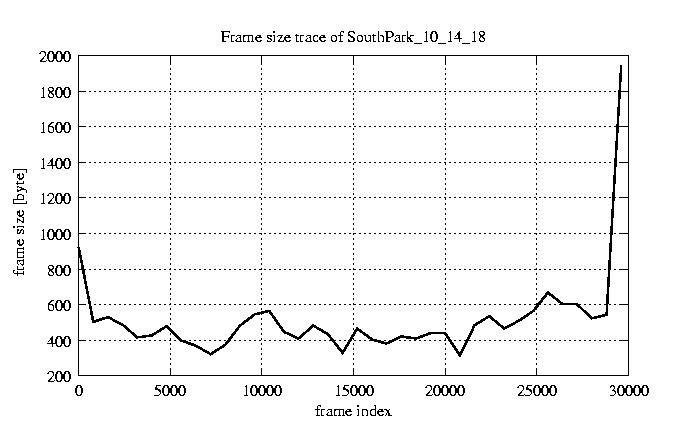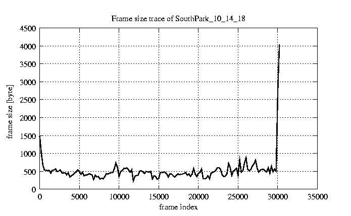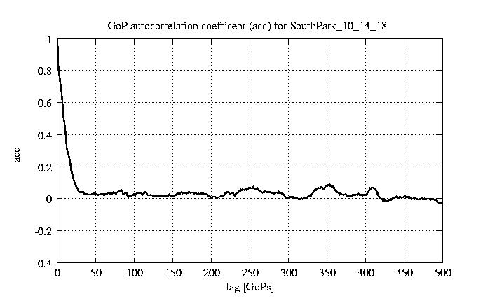 GoP statistics # of GoPs - 2528 mean GoP size byte 6.2e+03 var GoP size - 3.3e+07 CoV of GoP size - 0.92 min GoP size byte 1136 max GoP size byte 123885 Mean bit rate bit/sec 1e+05 Peak bit rate bit/sec 2.1e+06 Peak/Mean of bit rate - 19.95