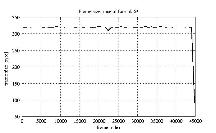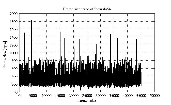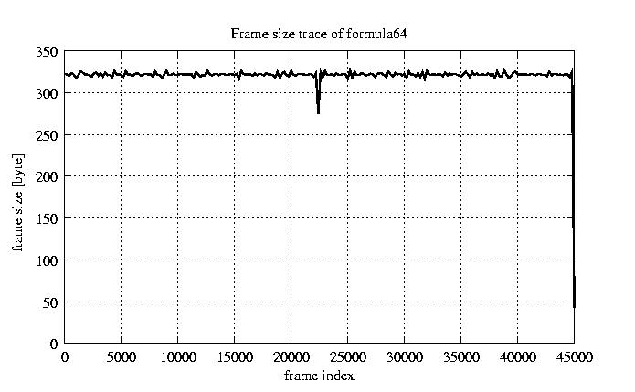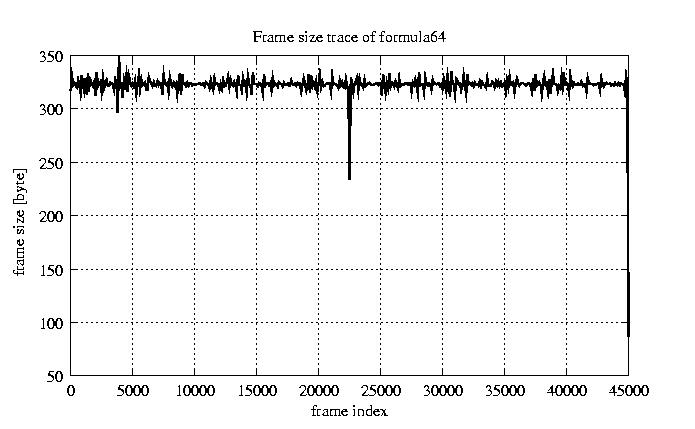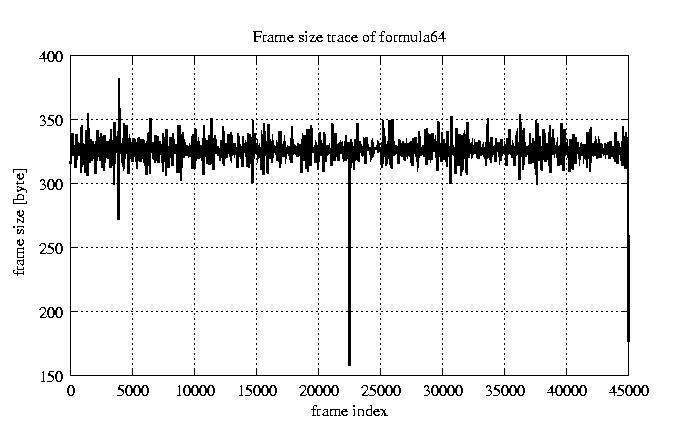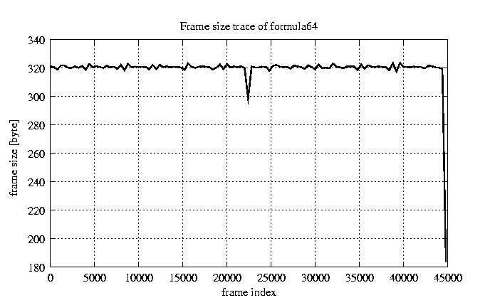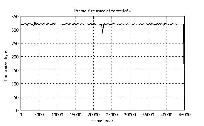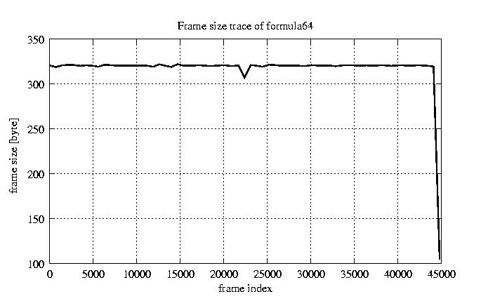 Frames, stuffed Rates Frames, original compression ratio YUV:H263 118.92 118.92 File size byte 1.4e+07 1.4e+07 Video run time msec 1.8e+06 1.8e+06 1.8e+06 # of Frames - 45026.00 16686.00 mean frame size byte 319.69 862.65 var frame size - 210056.38 98425.40 CoV of frame size - 1.43 0.36 min frame size byte 0.00 101.00 max frame size byte 4831.00 4831.00 Peak/Mean frame - 15.11 5.60 Mean bit rate bit/sec 6.4e+04 Peak bit rate bit/sec 3.7e+05 Peak/Mean of bit rate - 5.7 CoV of bit rate - 0.32 max inter frame space frames 1.00 31.00