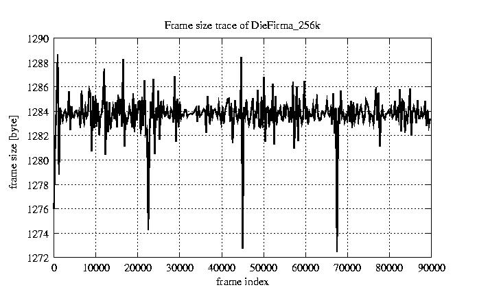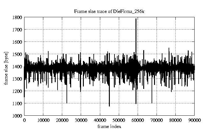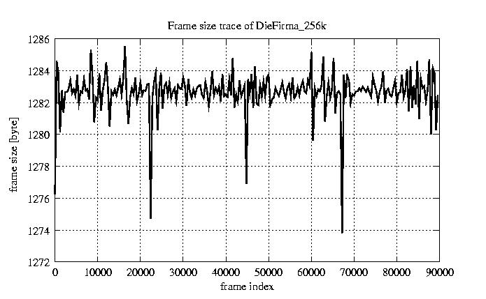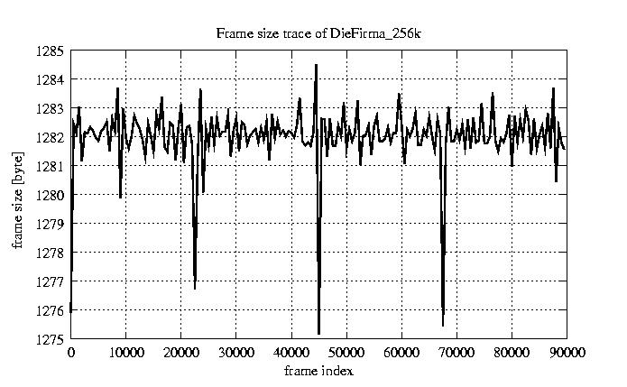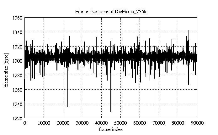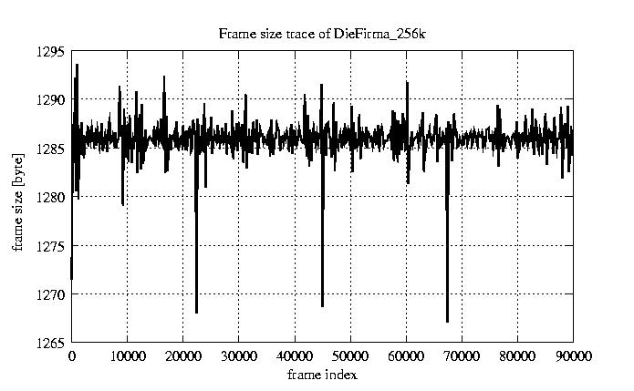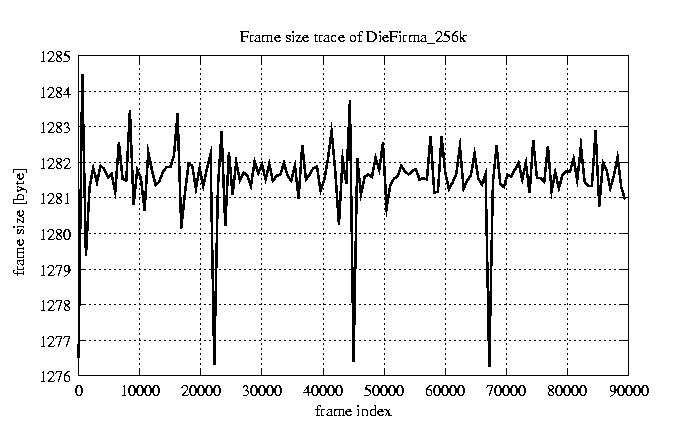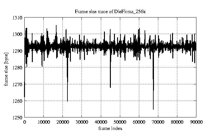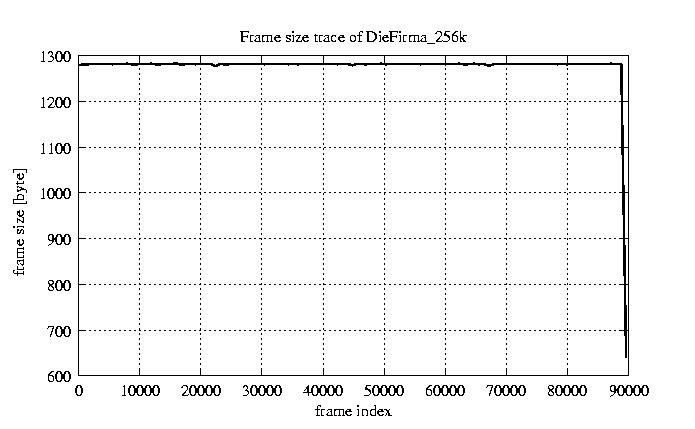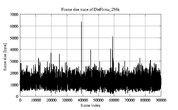 Frames Rates compression ratio YUV:H261 29.71 File size byte 1.2e+08 Video run time msec 3.6e+06 3.6e+06 # of Frames - 90000.00 mean frame size byte 1279.42 var frame size - 35790.63 CoV of frame size - 0.15 min frame size byte 220.00 max frame size byte 6365.00 Peak/Mean frame - 4.97 Mean bit rate bit/sec 2.6e+05 Peak bit rate bit/sec 1.3e+06 Peak/Mean of bit rate - 5 CoV of bit rate - 0.15 max inter frame space frames 1.00
