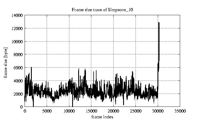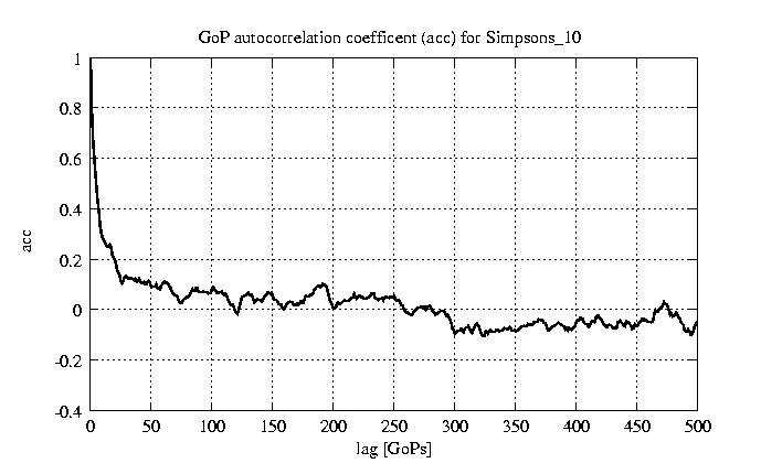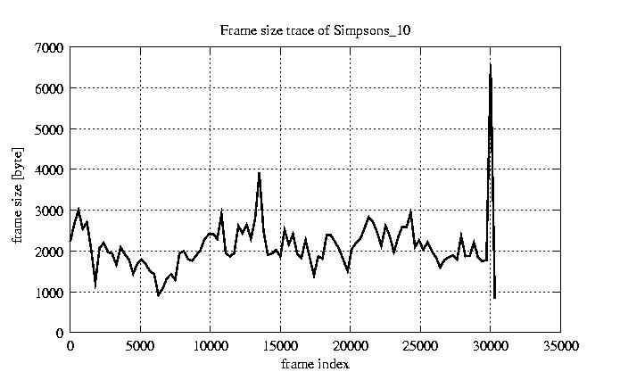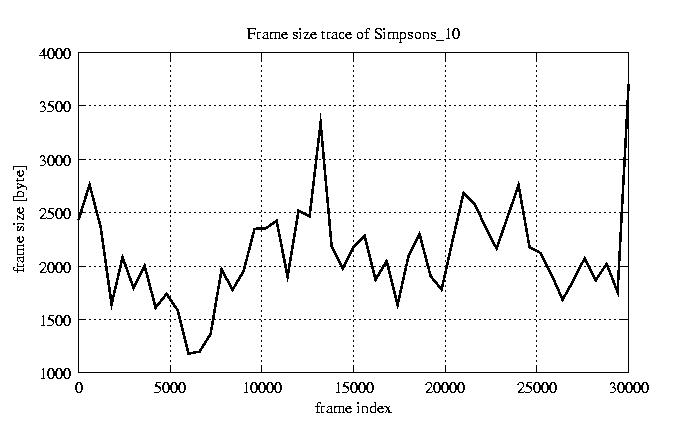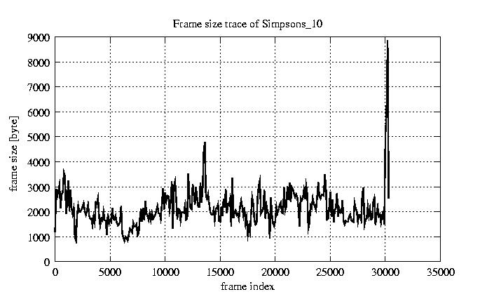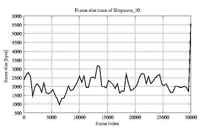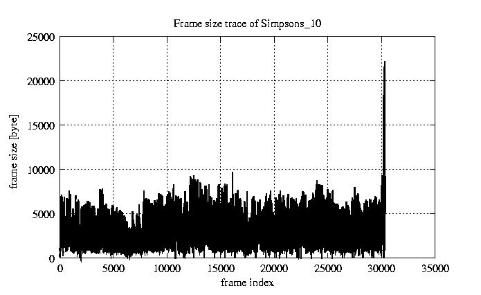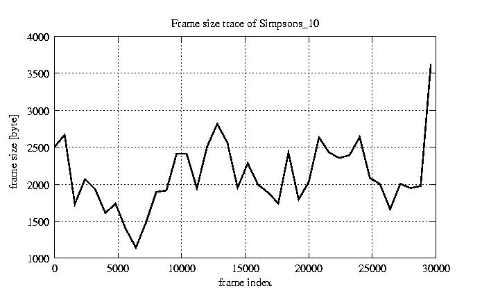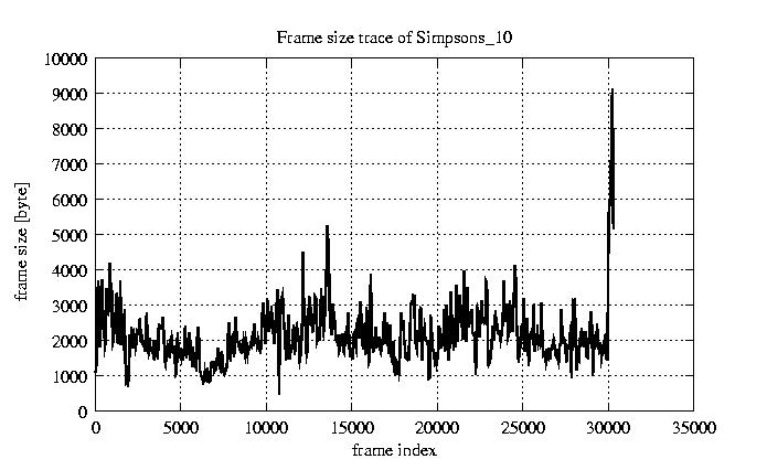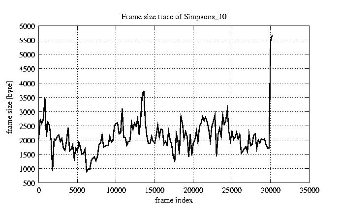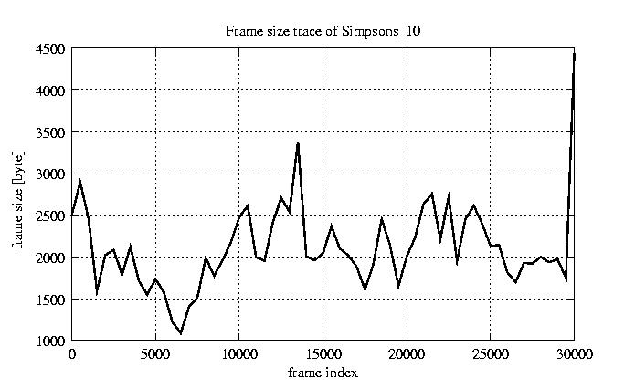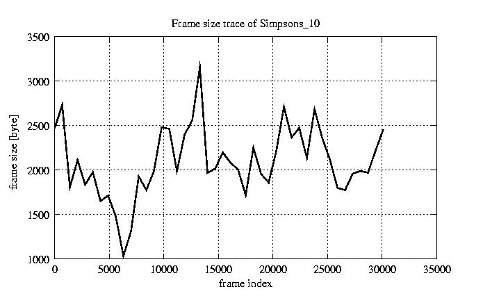 GoP statistics # of GoPs - 2527 mean GoP size byte 2.5e+04 var GoP size - 1.2e+08 CoV of GoP size - 0.43 min GoP size byte 464 max GoP size byte 143550 Mean bit rate bit/sec 4.2e+05 Peak bit rate bit/sec 2.4e+06 Peak/Mean of bit rate - 5.63