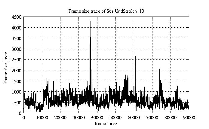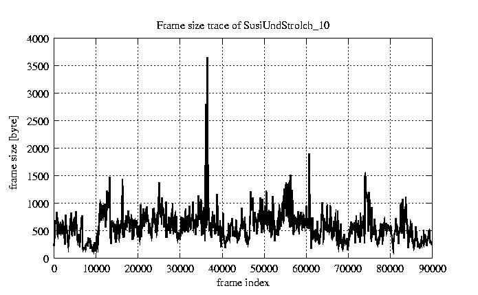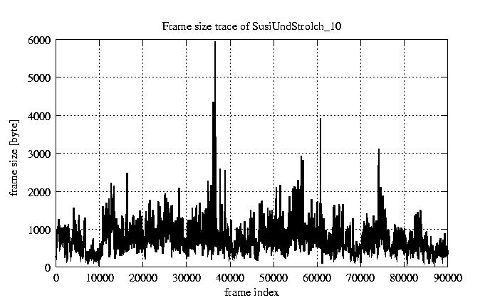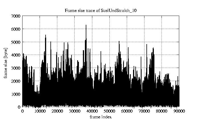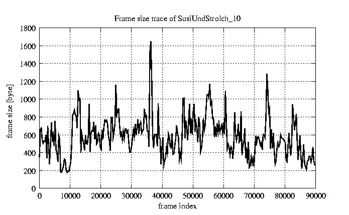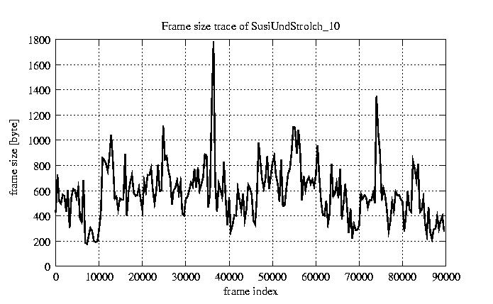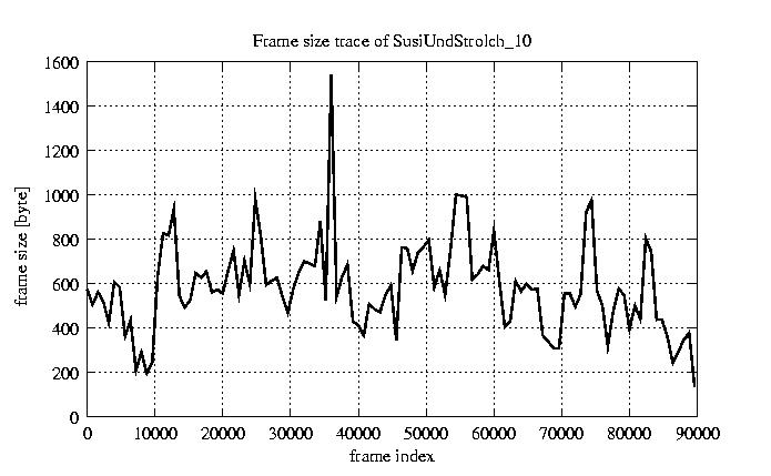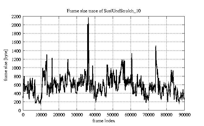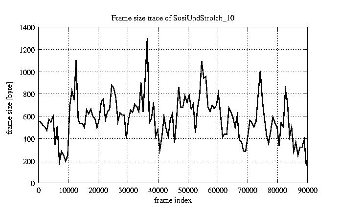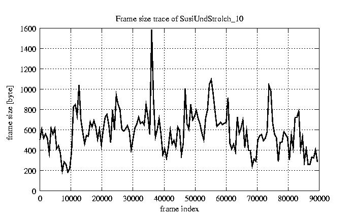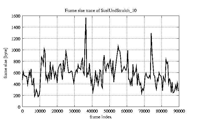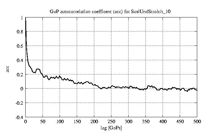 GoP statistics # of GoPs - 7499 mean GoP size byte 7e+03 var GoP size - 1.6e+07 CoV of GoP size - 0.58 min GoP size byte 828 max GoP size byte 64971 Mean bit rate bit/sec 1.2e+05 Peak bit rate bit/sec 1.1e+06 Peak/Mean of bit rate - 9.27