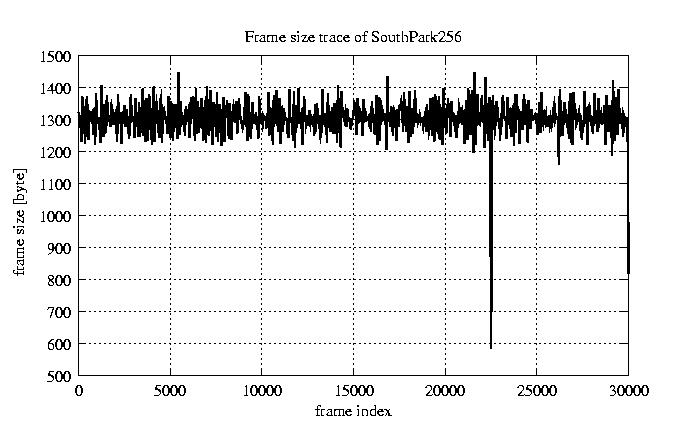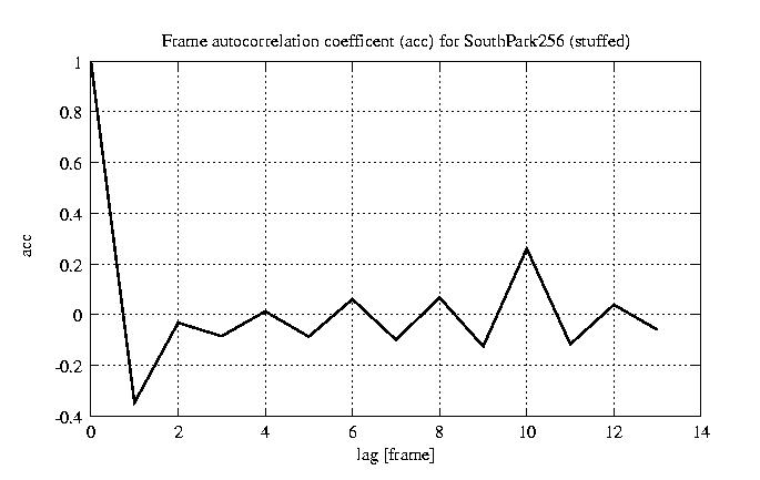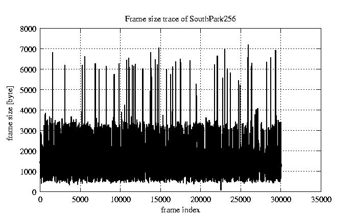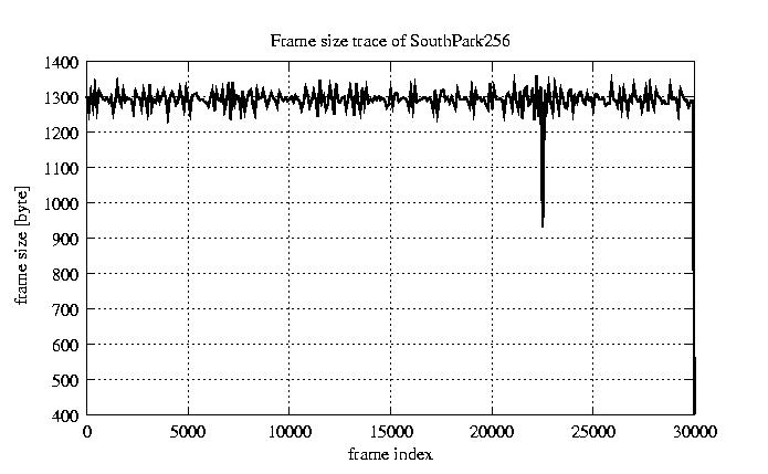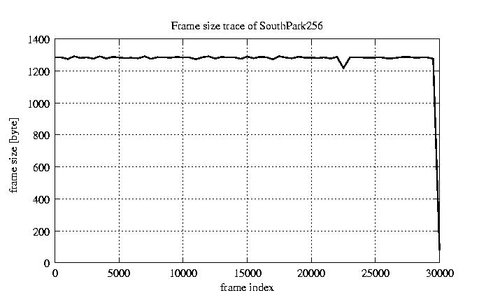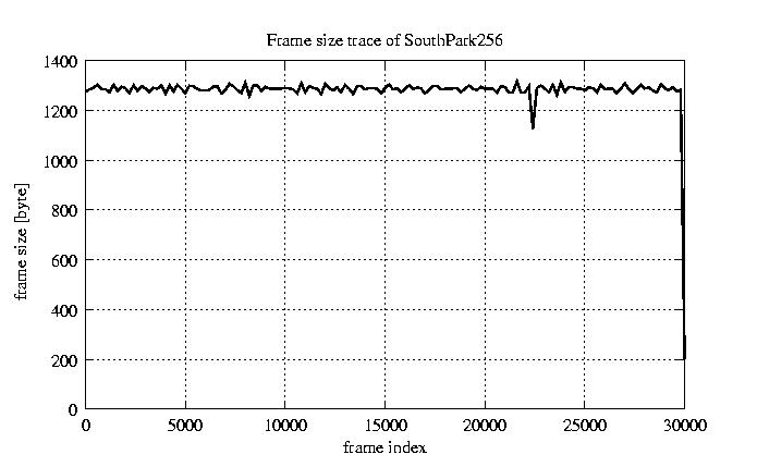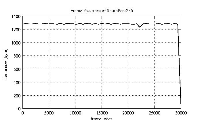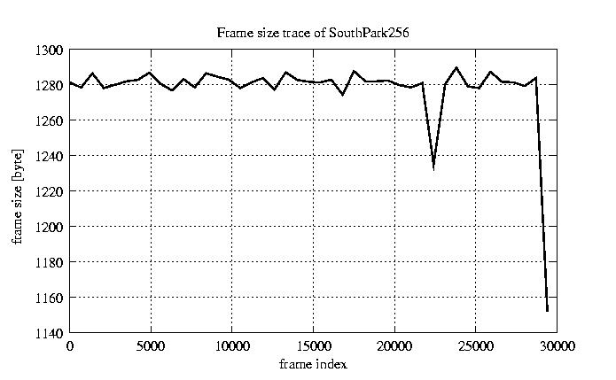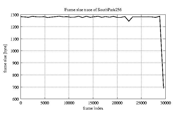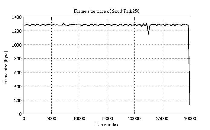 Frames, stuffed Rates Frames, original compression ratio YUV:H263 29.73 29.73 File size byte 3.8e+07 3.8e+07 Video run time msec 1.2e+06 1.2e+06 1.2e+06 # of Frames - 30028.00 9140.00 mean frame size byte 1278.81 4201.31 var frame size - 4553492.38 2681209.41 CoV of frame size - 1.67 0.39 min frame size byte 0.00 664.00 max frame size byte 13077.00 13077.00 Peak/Mean frame - 10.23 3.11 Mean bit rate bit/sec 2.6e+05 Peak bit rate bit/sec 1.4e+06 Peak/Mean of bit rate - 5.6 CoV of bit rate - 0.46 max inter frame space frames 1.00 29.00