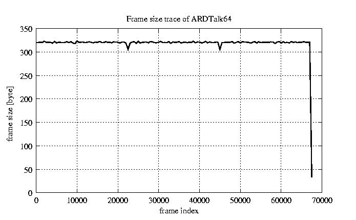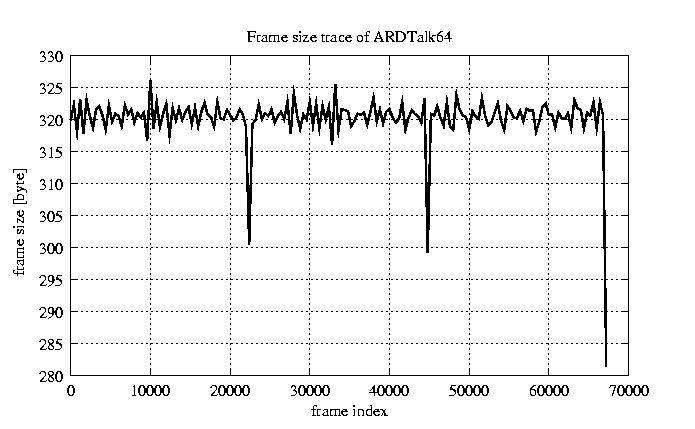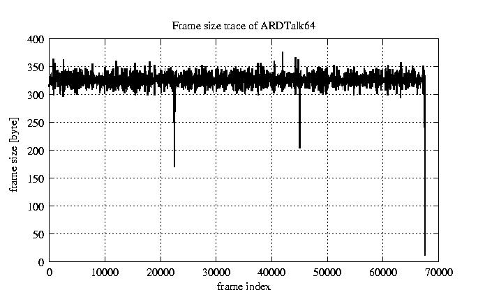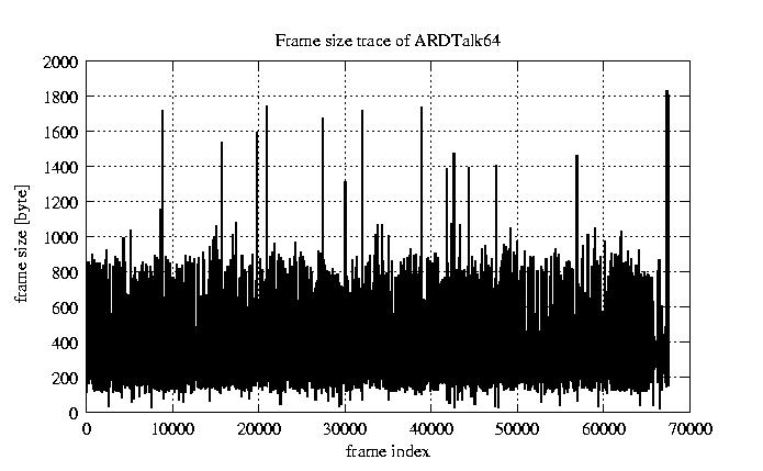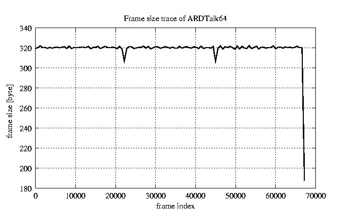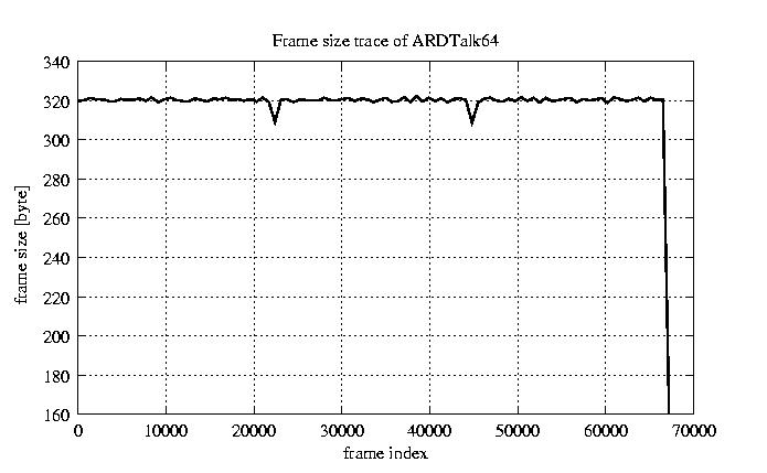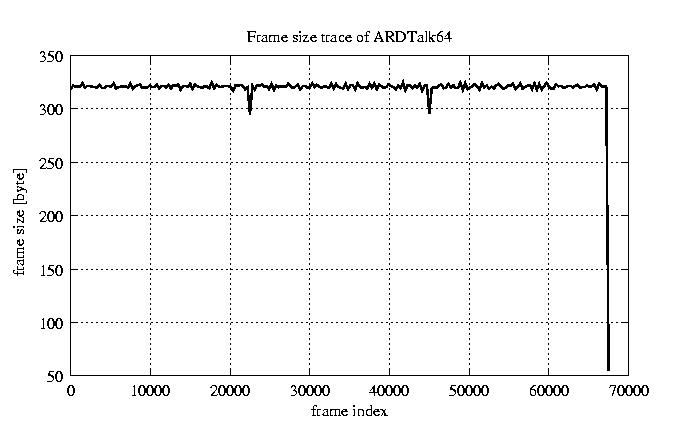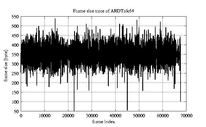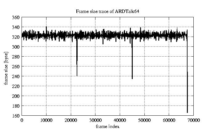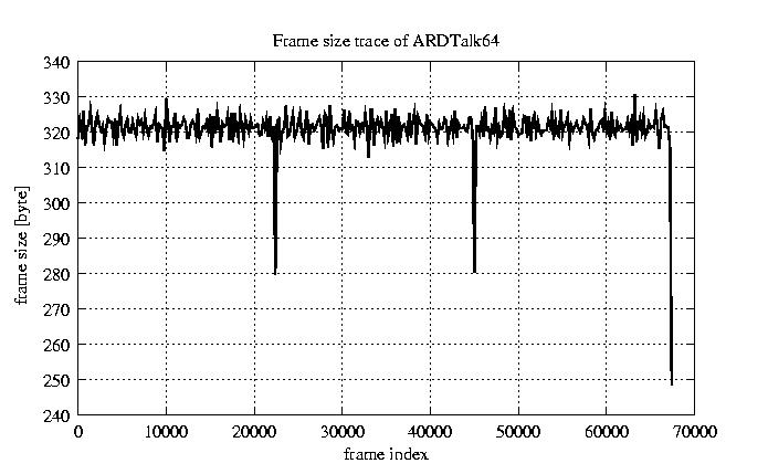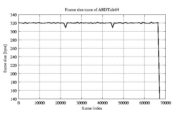 Frames, stuffed Rates Frames, original compression ratio YUV:H263 118.94 118.94 File size byte 2.2e+07 2.2e+07 Video run time msec 2.7e+06 2.7e+06 2.7e+06 # of Frames - 67552.00 17029.00 mean frame size byte 319.65 1268.00 var frame size - 352628.97 196320.30 CoV of frame size - 1.86 0.35 min frame size byte 0.00 35.00 max frame size byte 4286.00 4286.00 Peak/Mean frame - 13.41 3.38 Mean bit rate bit/sec 6.4e+04 Peak bit rate bit/sec 3.7e+05 Peak/Mean of bit rate - 5.7 CoV of bit rate - 0.43 max inter frame space frames 1.00 30.00