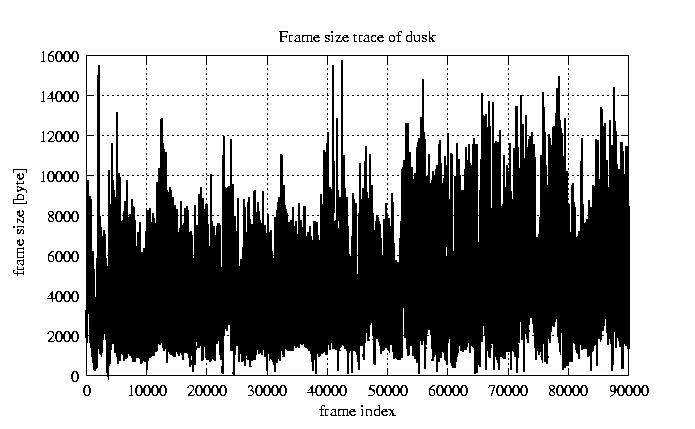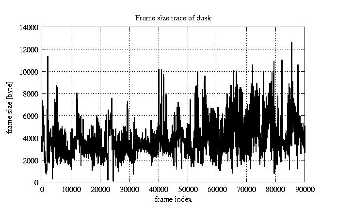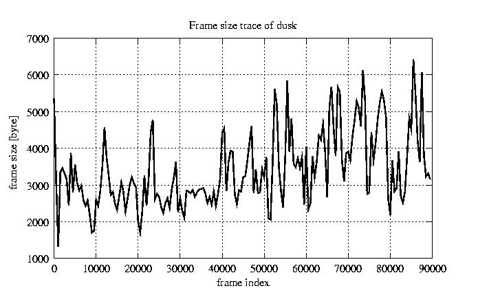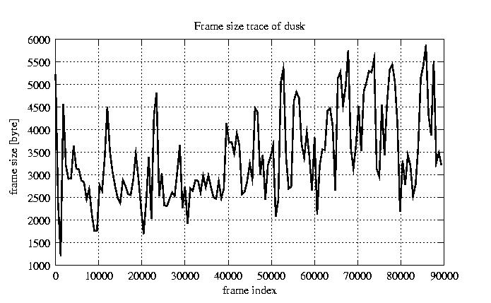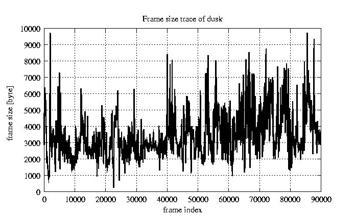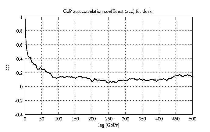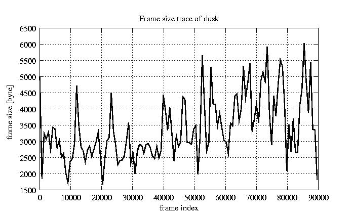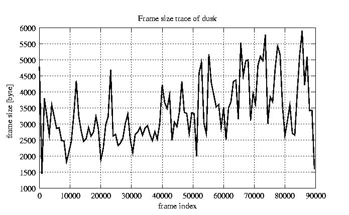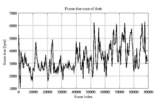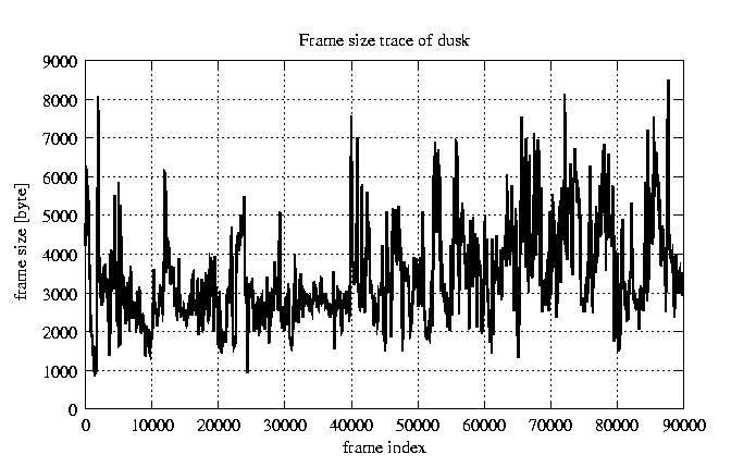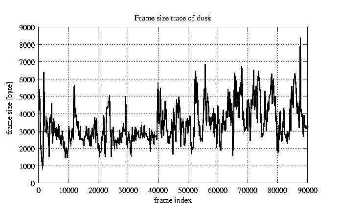 GoP statistics # of GoPs - 7499 mean GoP size byte 4.1e+04 var GoP size - 3.1e+08 CoV of GoP size - 0.43 min GoP size byte 1877 max GoP size byte 138843 Mean bit rate bit/sec 6.8e+05 Peak bit rate bit/sec 2.3e+06 Peak/Mean of bit rate - 3.40