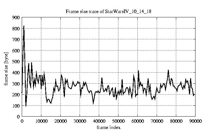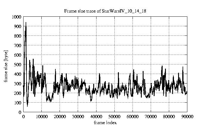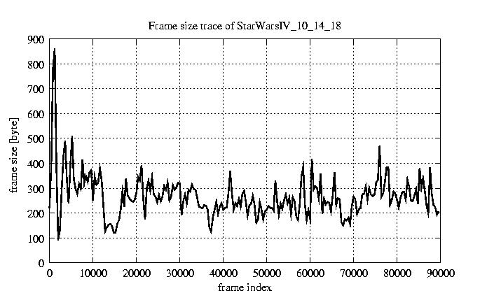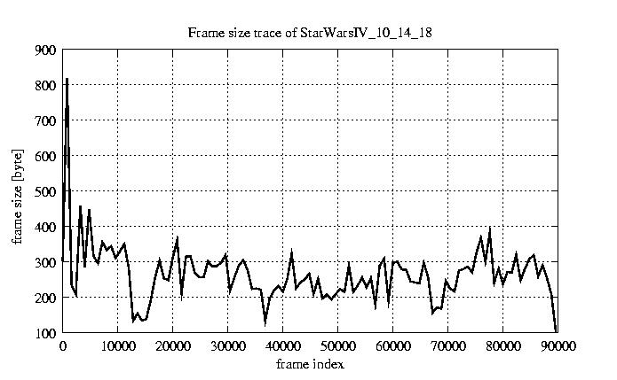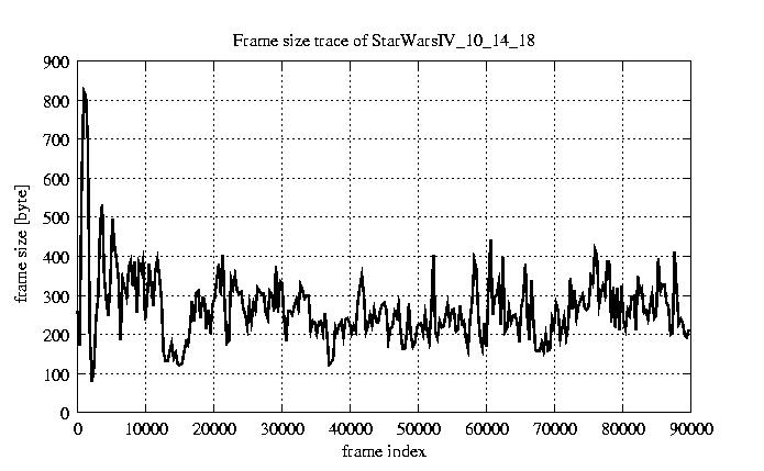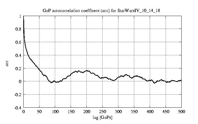 GoP statistics # of GoPs - 7499 mean GoP size byte 3.2e+03 var GoP size - 2.2e+06 CoV of GoP size - 0.46 min GoP size byte 736 max GoP size byte 17000 Mean bit rate bit/sec 5.3e+04 Peak bit rate bit/sec 2.8e+05 Peak/Mean of bit rate - 5.31