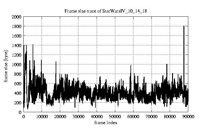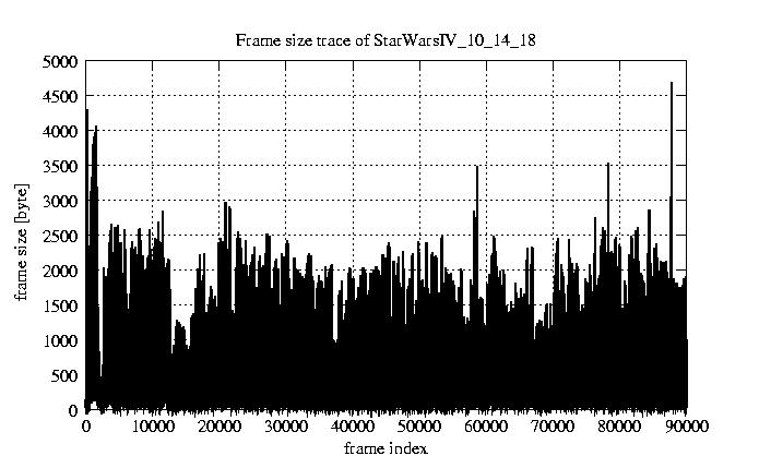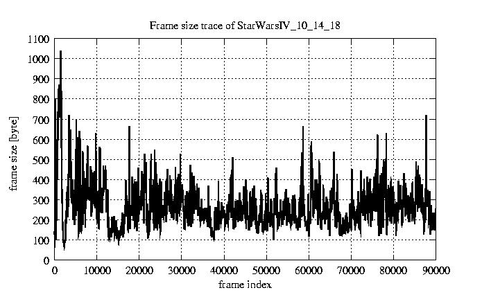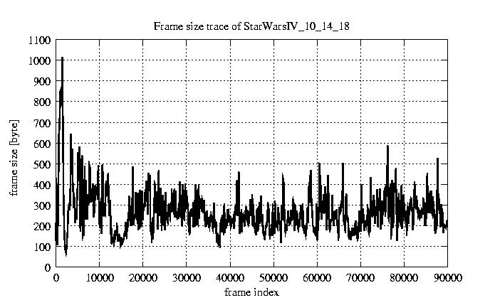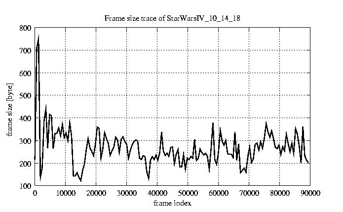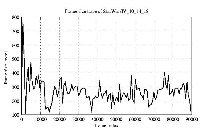 Frame statistics compression ratio YUV:MP4 142.52 File Size byte 2.4e+07 Video run time msec 3.6e+06 # of Frames - 89998 mean frame size byte 2.7e+02 var frame size - 2e+05 CoV of frame size - 1.68 min frame size byte 26 max frame size byte 4686 Mean bit rate bit/sec 5.3e+04 Peak bit rate bit/sec 9.4e+05 Peak/Mean of bit rate - 17.57