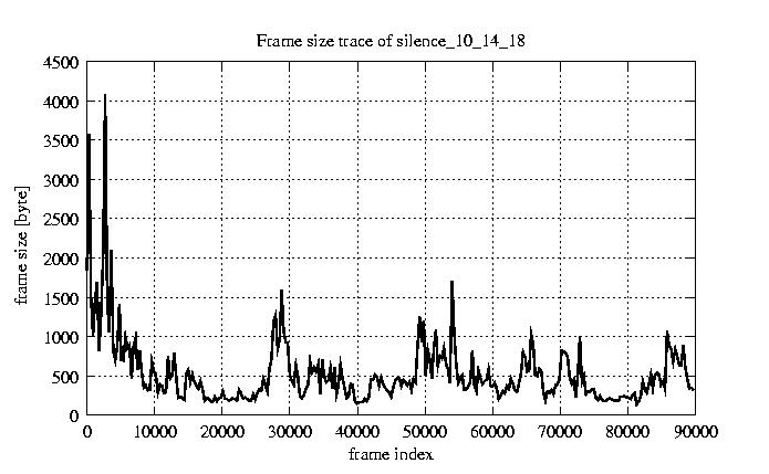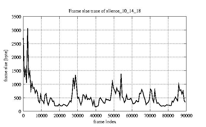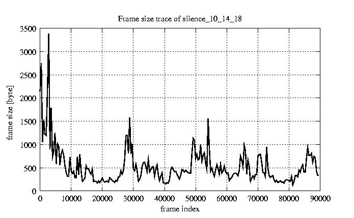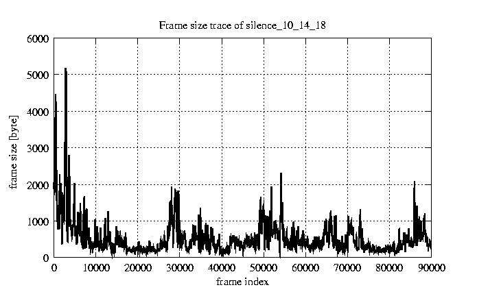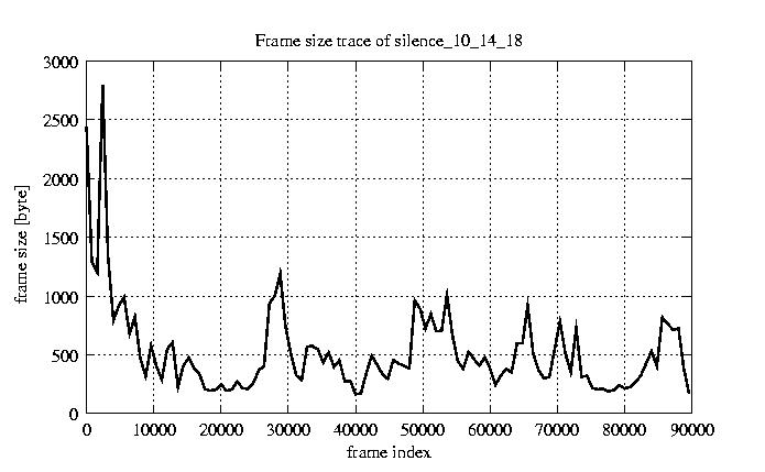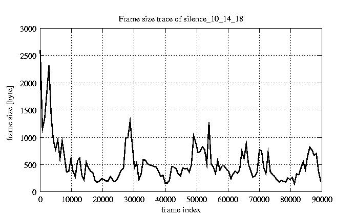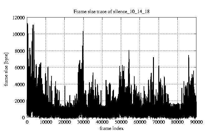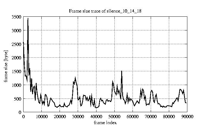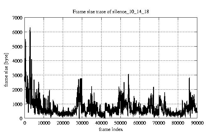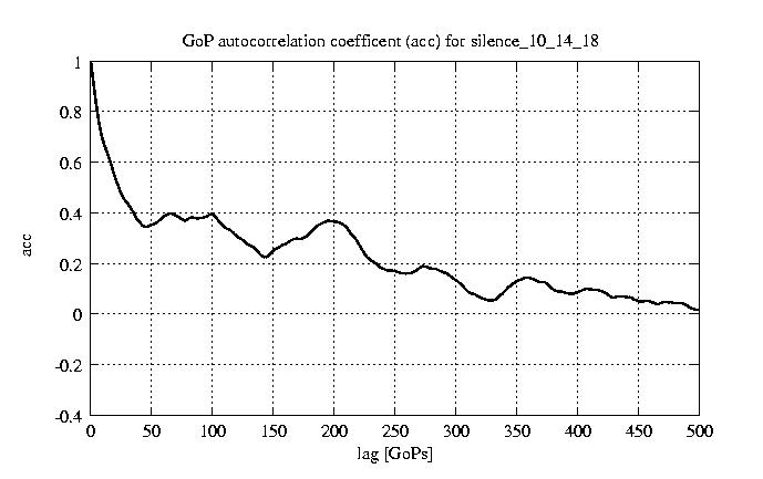 GoP statistics # of GoPs - 7499 mean GoP size byte 6.3e+03 var GoP size - 3.4e+07 CoV of GoP size - 0.92 min GoP size byte 1035 max GoP size byte 66374 Mean bit rate bit/sec 1.1e+05 Peak bit rate bit/sec 1.1e+06 Peak/Mean of bit rate - 10.48