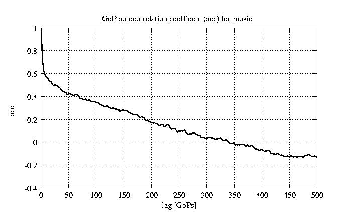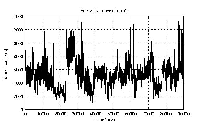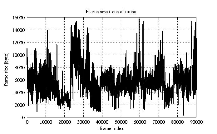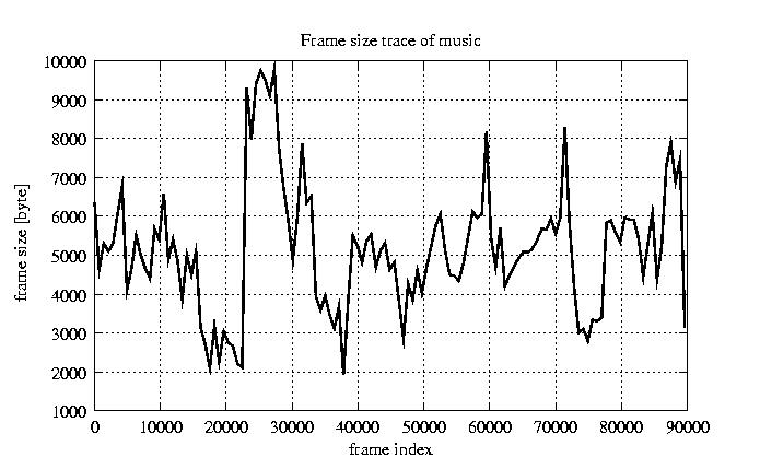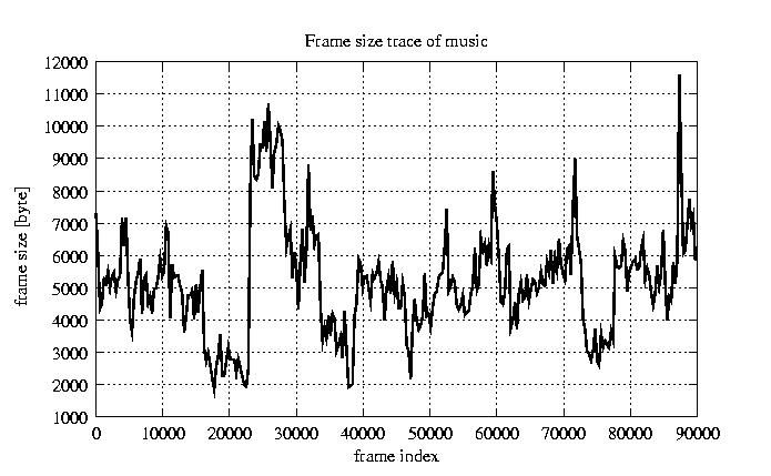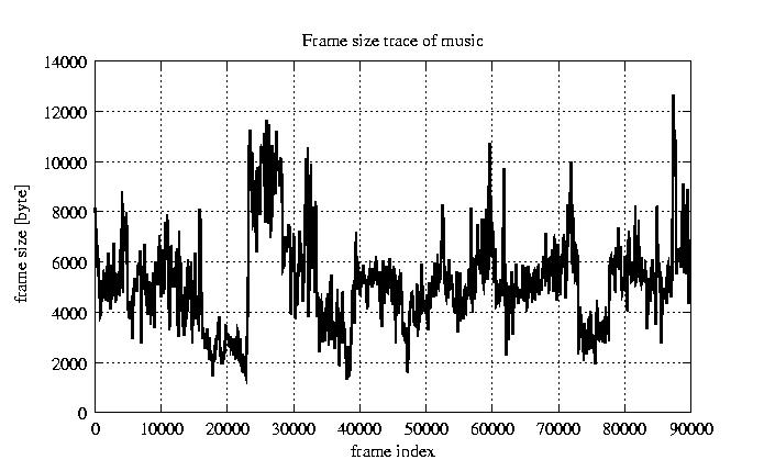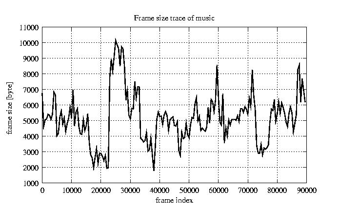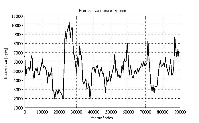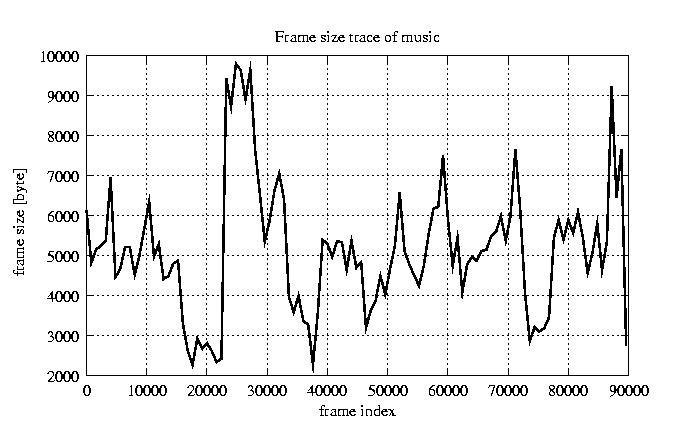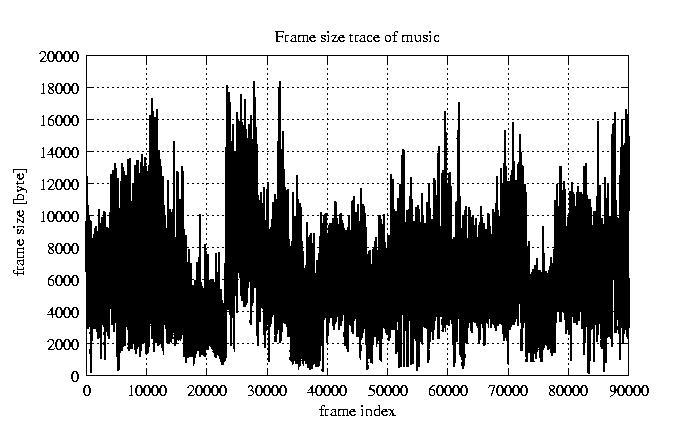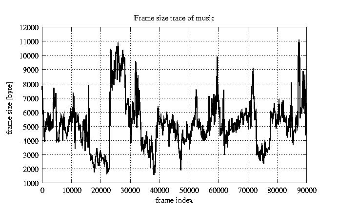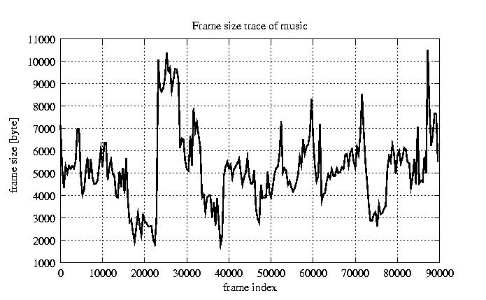 GoP statistics # of GoPs - 7499 mean GoP size byte 6.2e+04 var GoP size - 6.7e+08 CoV of GoP size - 0.42 min GoP size byte 3109 max GoP size byte 176087 Mean bit rate bit/sec 1e+06 Peak bit rate bit/sec 2.9e+06 Peak/Mean of bit rate - 2.84