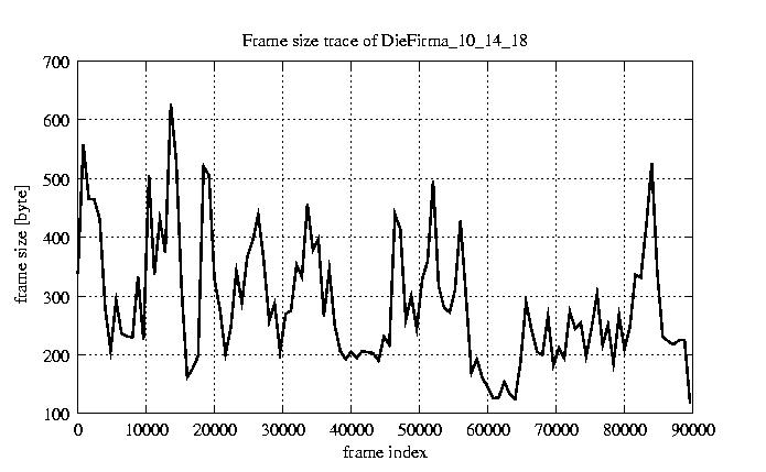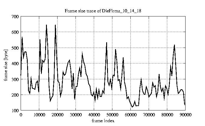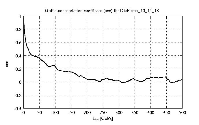 GoP statistics # of GoPs - 7499 mean GoP size byte 3.5e+03 var GoP size - 3.3e+06 CoV of GoP size - 0.52 min GoP size byte 1018 max GoP size byte 15493 Mean bit rate bit/sec 5.8e+04 Peak bit rate bit/sec 2.6e+05 Peak/Mean of bit rate - 4.48