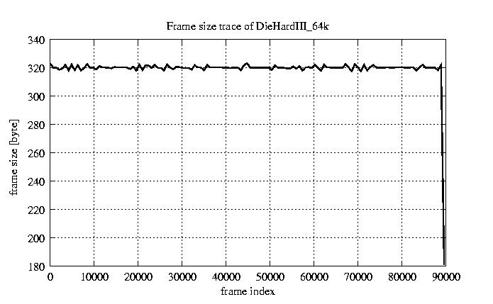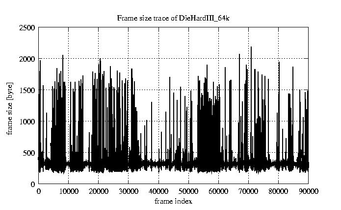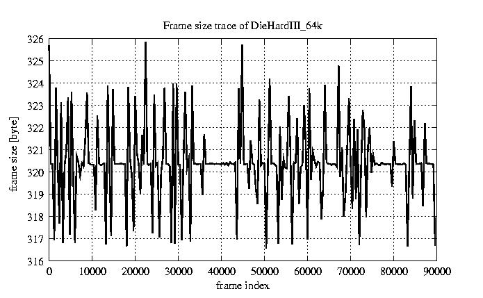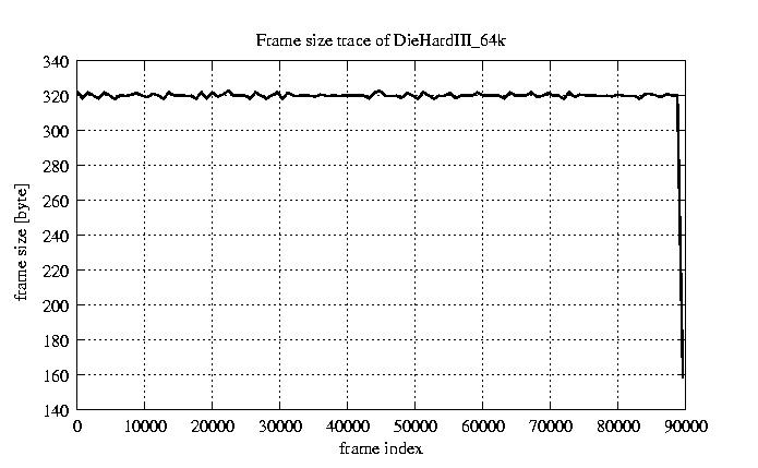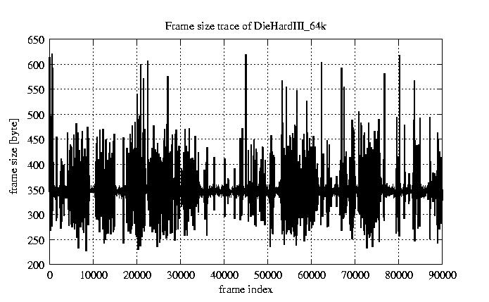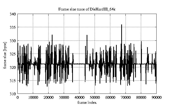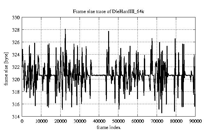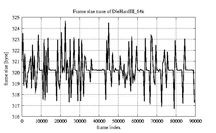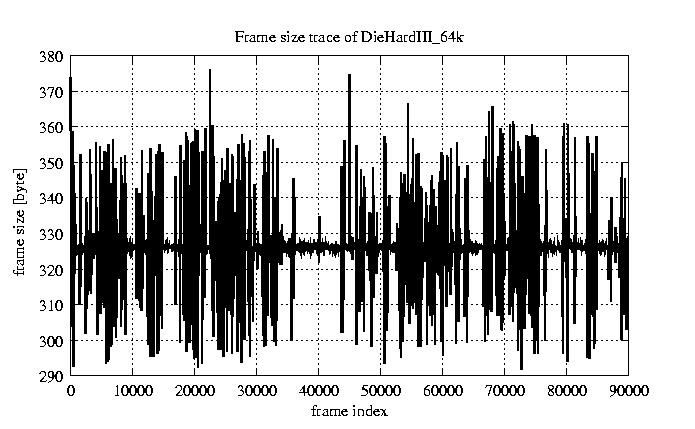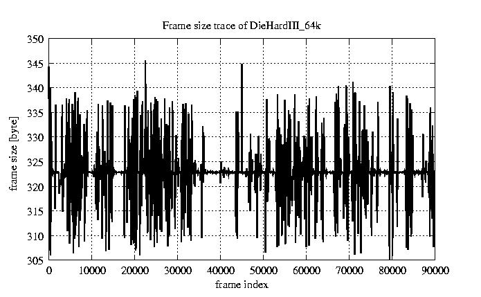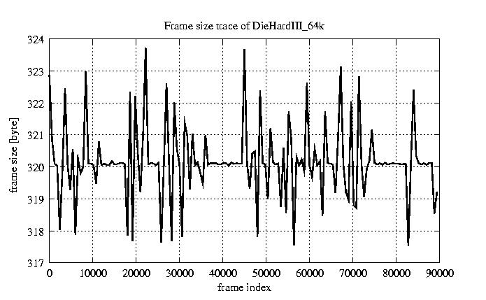 Frames Rates compression ratio YUV:H261 118.94 File size byte 2.9e+07 Video run time msec 3.6e+06 3.6e+06 # of Frames - 90000.00 mean frame size byte 319.64 var frame size - 5151.58 CoV of frame size - 0.22 min frame size byte 173.00 max frame size byte 2188.00 Peak/Mean frame - 6.85 Mean bit rate bit/sec 6.4e+04 Peak bit rate bit/sec 4.4e+05 Peak/Mean of bit rate - 6.8 CoV of bit rate - 0.22 max inter frame space frames 1.00