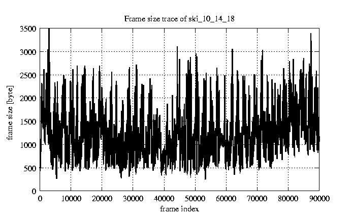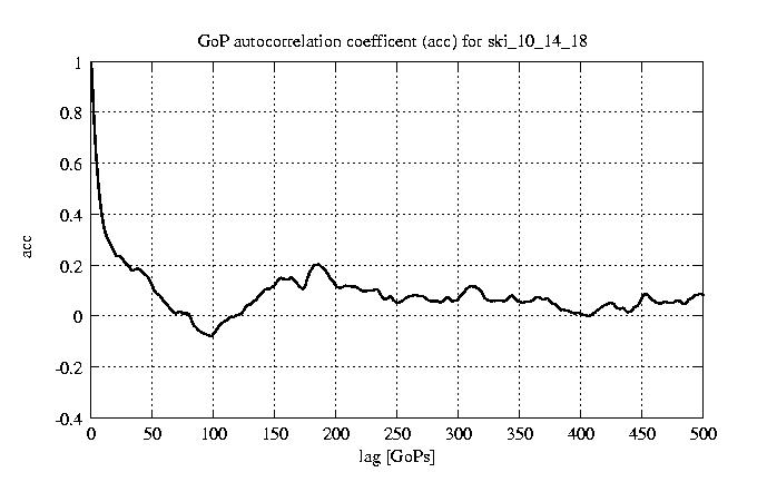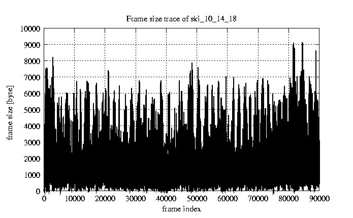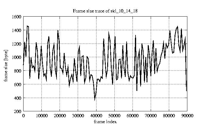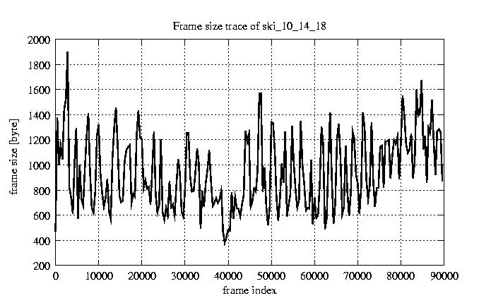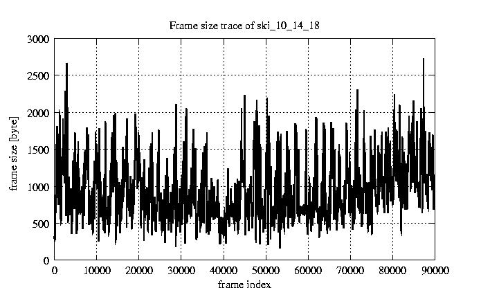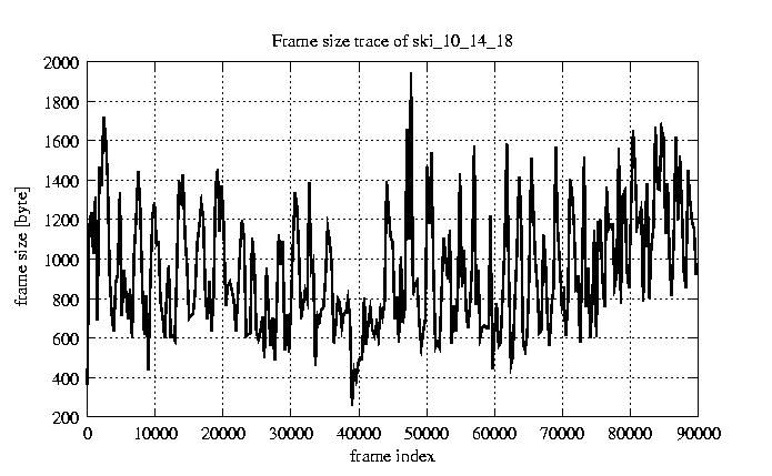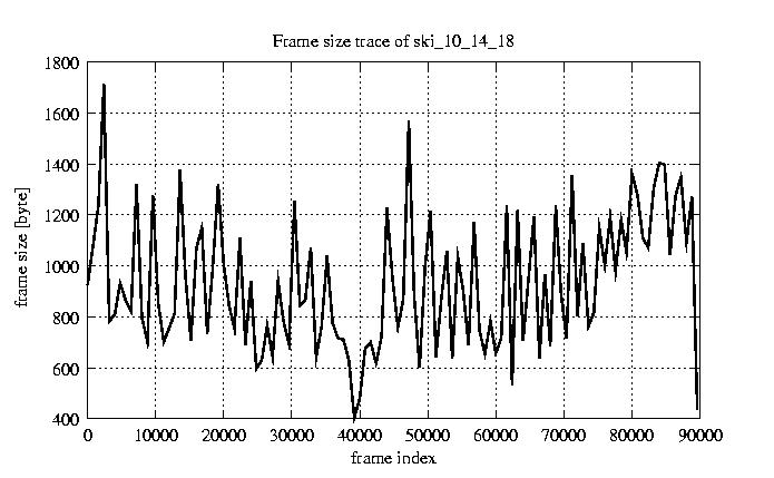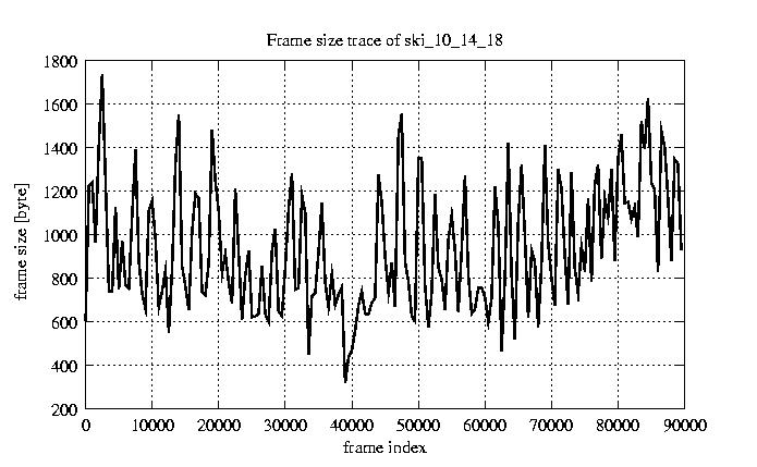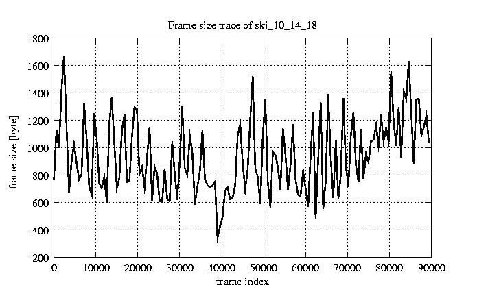 GoP statistics # of GoPs - 7499 mean GoP size byte 1.1e+04 var GoP size - 2.8e+07 CoV of GoP size - 0.47 min GoP size byte 1950 max GoP size byte 35270 Mean bit rate bit/sec 1.9e+05 Peak bit rate bit/sec 5.9e+05 Peak/Mean of bit rate - 3.14