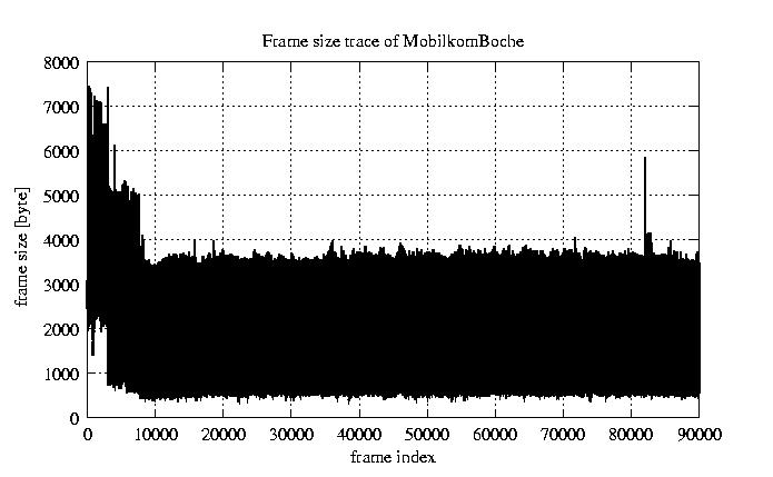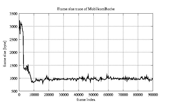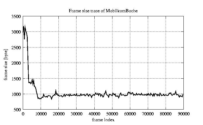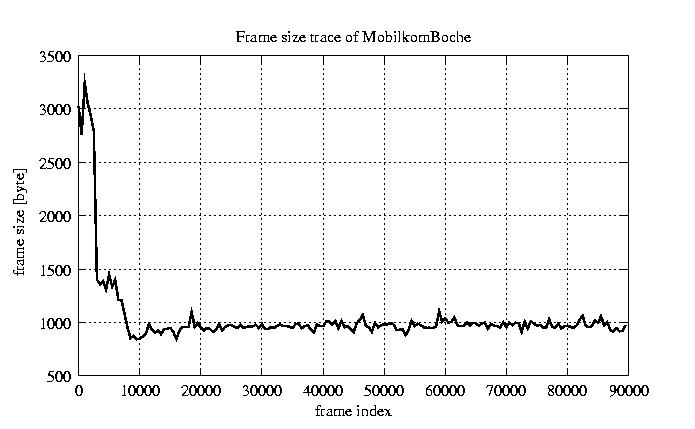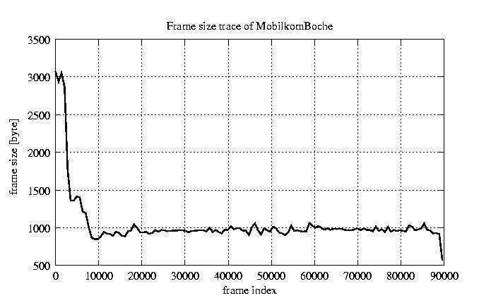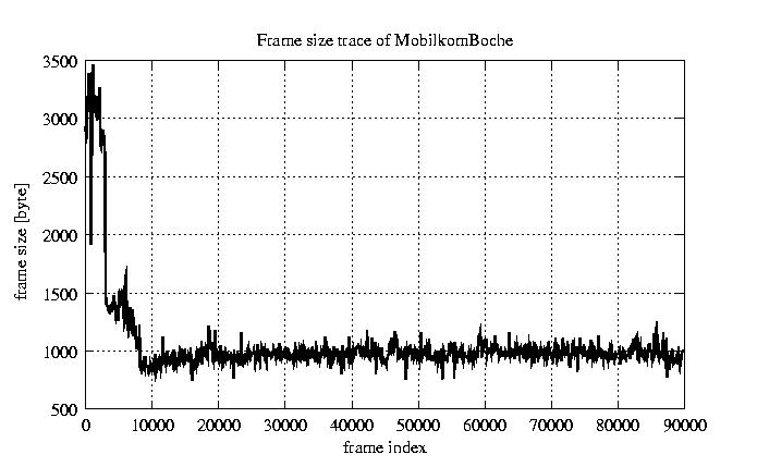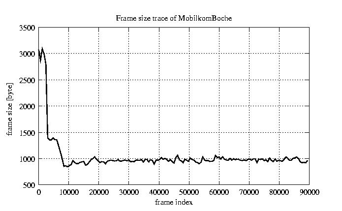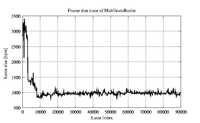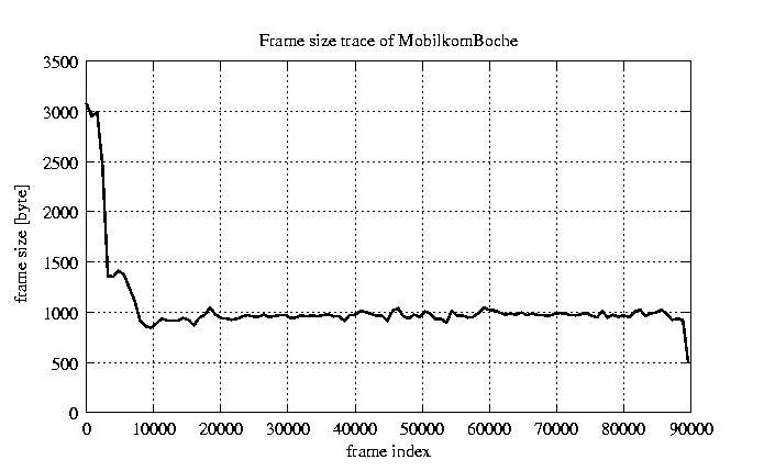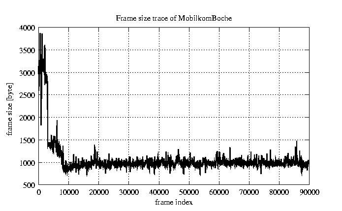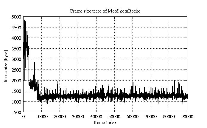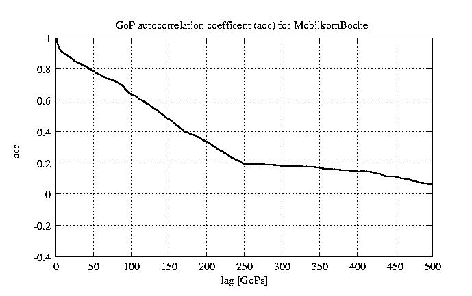 GoP statistics # of GoPs - 7499 mean GoP size byte 1.3e+04 var GoP size - 2.1e+07 CoV of GoP size - 0.36 min GoP size byte 8132 max GoP size byte 51017 Mean bit rate bit/sec 2.1e+05 Peak bit rate bit/sec 8.5e+05 Peak/Mean of bit rate - 4.06