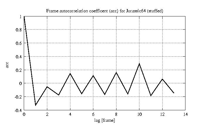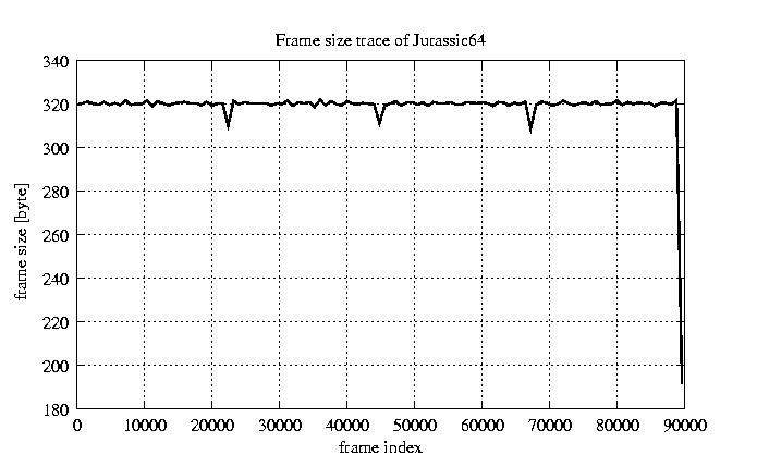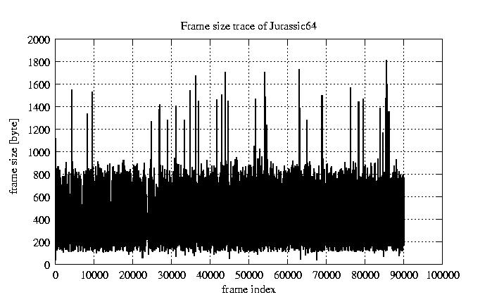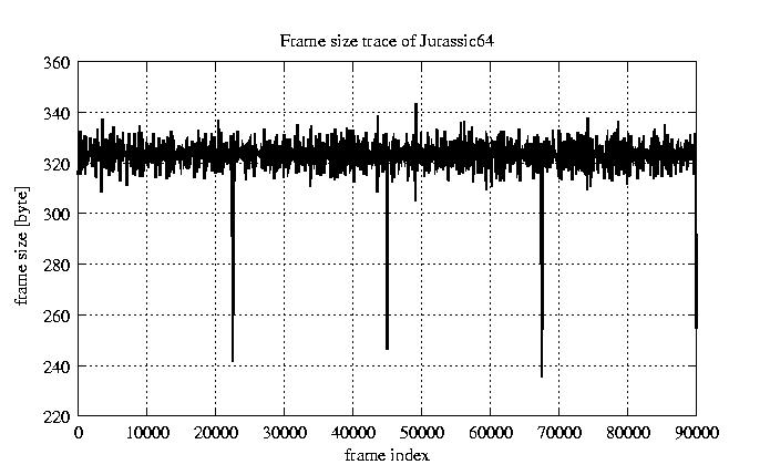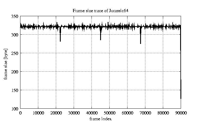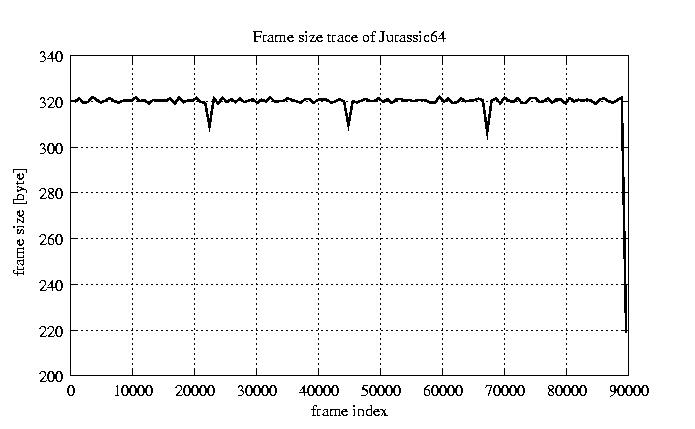 Frames, stuffed Rates Frames, original compression ratio YUV:H263 118.96 118.96 File size byte 2.9e+07 2.9e+07 Video run time msec 3.6e+06 3.6e+06 3.6e+06 # of Frames - 90082.00 25432.00 mean frame size byte 319.59 1132.02 var frame size - 307342.80 168939.08 CoV of frame size - 1.73 0.36 min frame size byte 0.00 38.00 max frame size byte 8935.00 8935.00 Peak/Mean frame - 27.96 7.89 Mean bit rate bit/sec 6.4e+04 Peak bit rate bit/sec 3.6e+05 Peak/Mean of bit rate - 5.7 CoV of bit rate - 0.42 max inter frame space frames 1.00 33.00