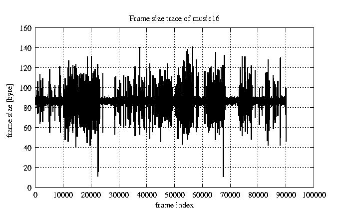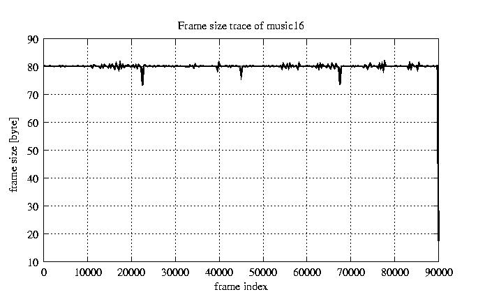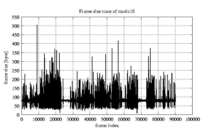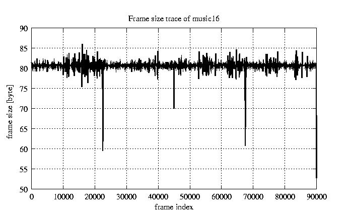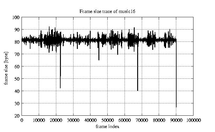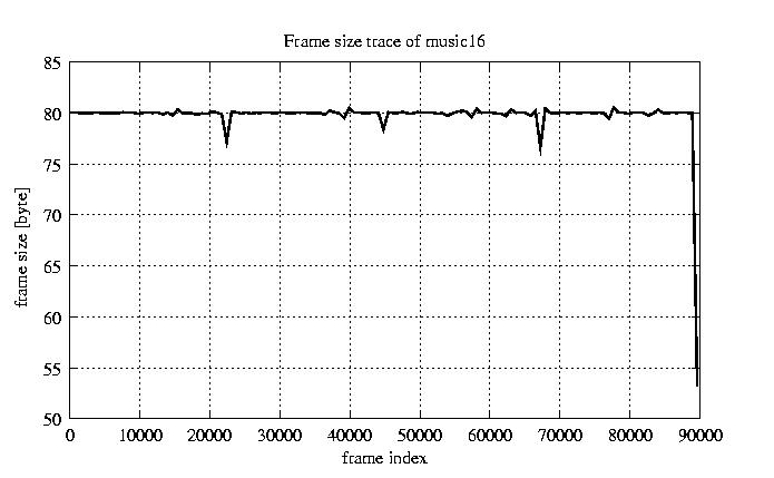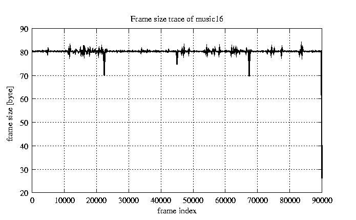 Frames, stuffed Rates Frames, original compression ratio YUV:H263 476.17 476.17 File size byte 7.2e+06 7.2e+06 Video run time msec 3.6e+06 3.6e+06 3.6e+06 # of Frames - 90066.00 13362.00 mean frame size byte 79.84 538.16 var frame size - 60120.03 158596.25 CoV of frame size - 3.07 0.74 min frame size byte 0.00 44.00 max frame size byte 7095.00 7095.00 Peak/Mean frame - 88.87 13.18 Mean bit rate bit/sec 1.6e+04 Peak bit rate bit/sec 1e+05 Peak/Mean of bit rate - 6.3 CoV of bit rate - 0.24 max inter frame space frames 1.00 87.00