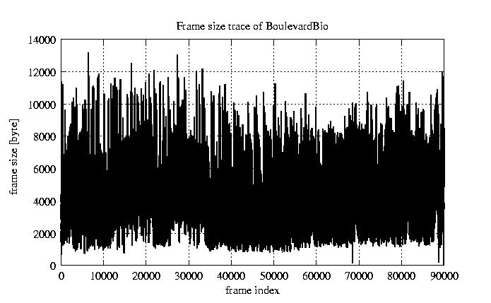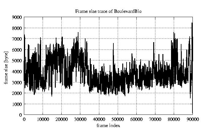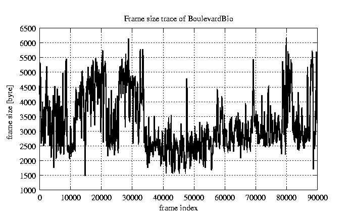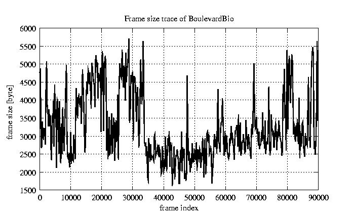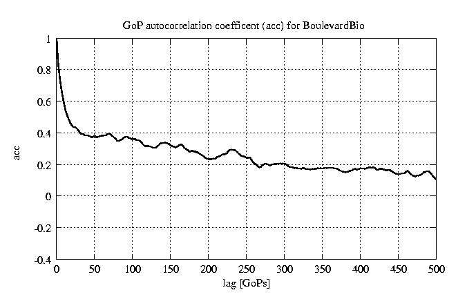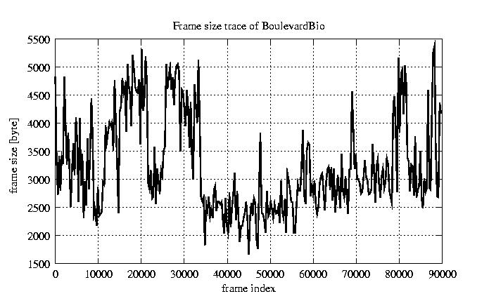 GoP statistics # of GoPs - 7499 mean GoP size byte 3.9e+04 var GoP size - 1.6e+08 CoV of GoP size - 0.33 min GoP size byte 1897 max GoP size byte 90090 Mean bit rate bit/sec 6.5e+05 Peak bit rate bit/sec 1.5e+06 Peak/Mean of bit rate - 2.32