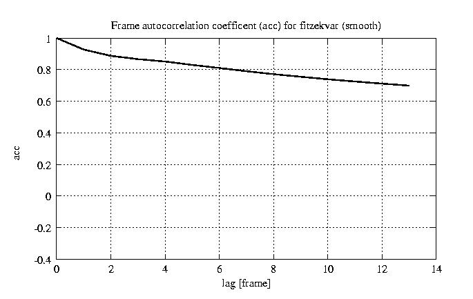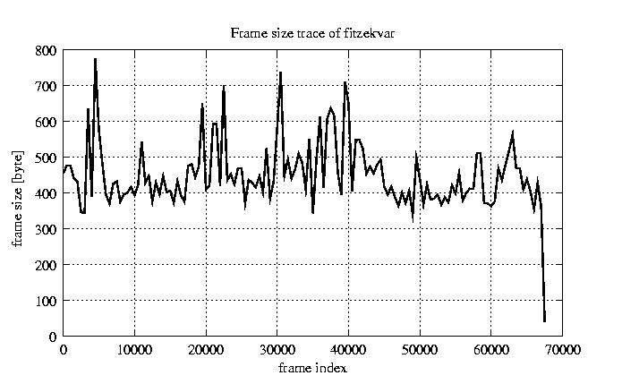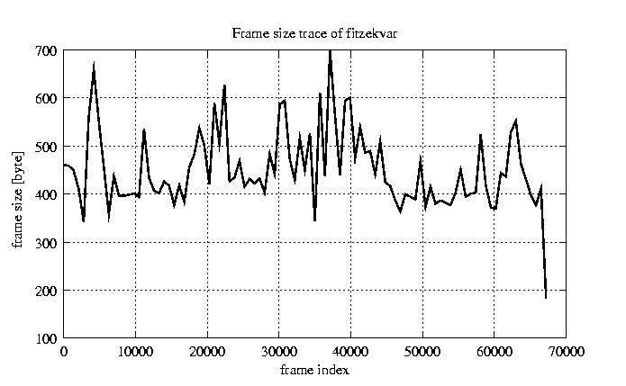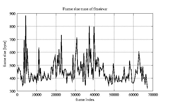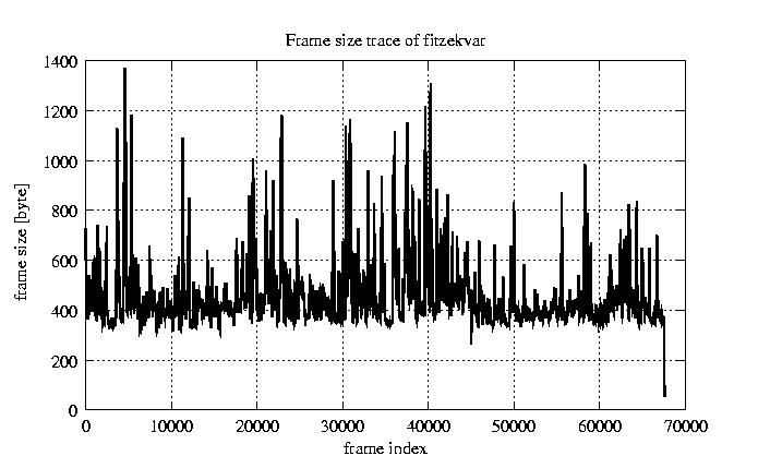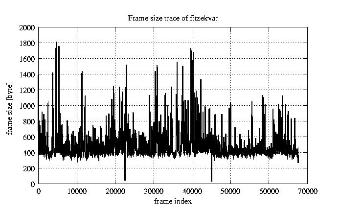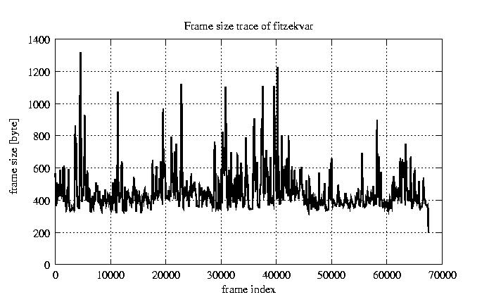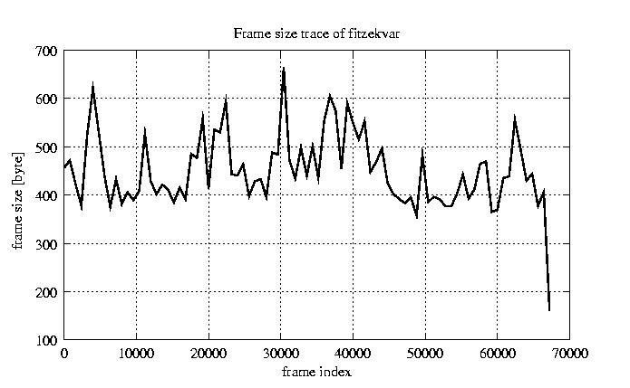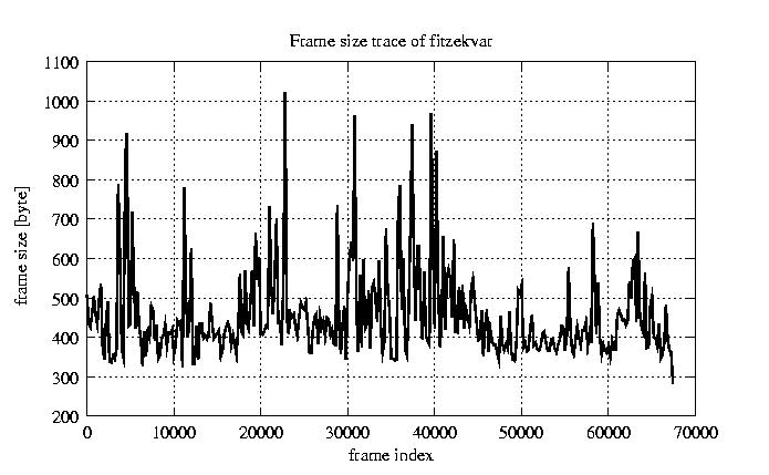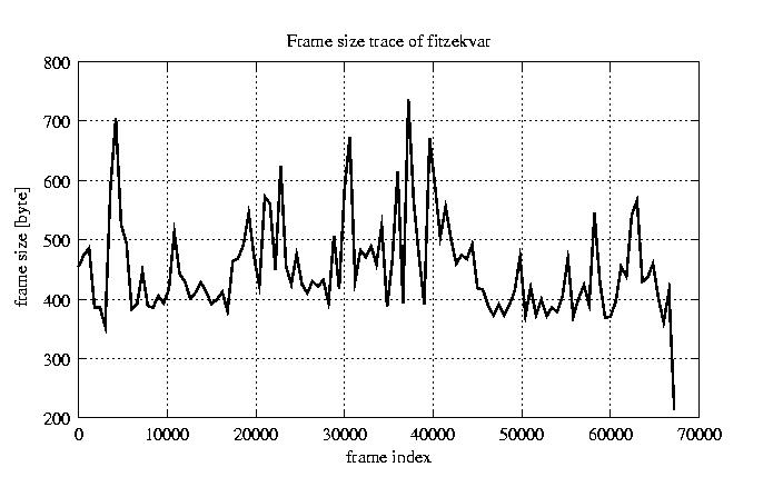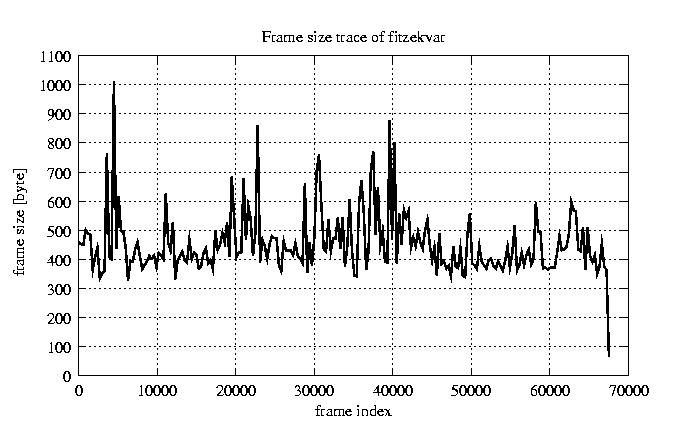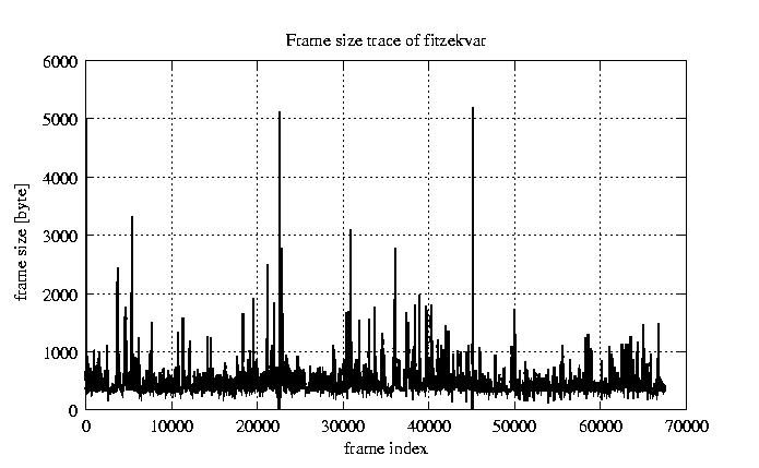 Frames, stuffed Rates Frames, original compression ratio YUV:H263 84.01 84.01 File size byte 3.1e+07 3.1e+07 Video run time msec 2.7e+06 2.7e+06 2.7e+06 # of Frames - 67556.00 33825.00 mean frame size byte 452.52 903.78 var frame size - 257858.86 107157.07 CoV of frame size - 1.12 0.36 min frame size byte 0.00 254.00 max frame size byte 5191.00 5191.00 Peak/Mean frame - 11.47 5.74 Mean bit rate bit/sec 9.1e+04 Peak bit rate bit/sec 1e+06 Peak/Mean of bit rate - 11 CoV of bit rate - 0.38 max inter frame space frames 1.00 29.00