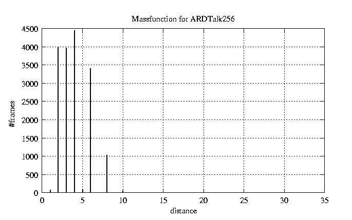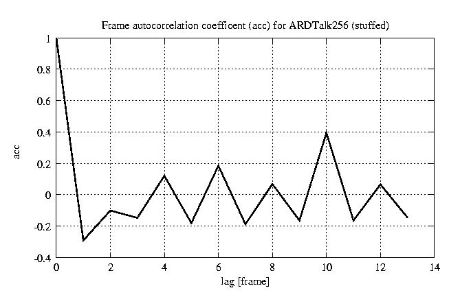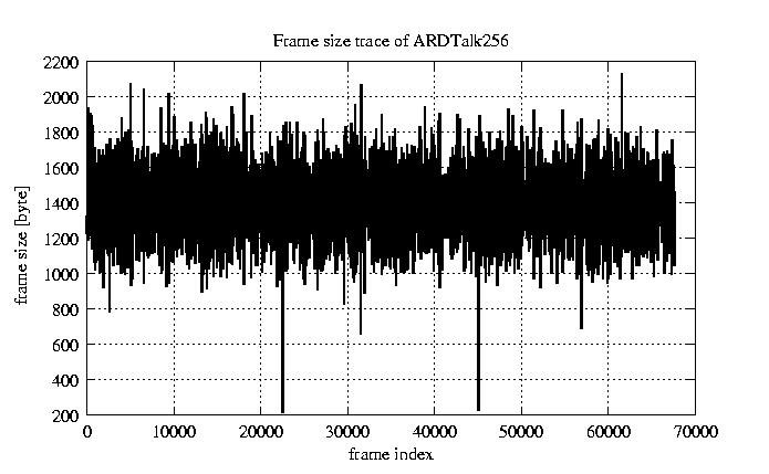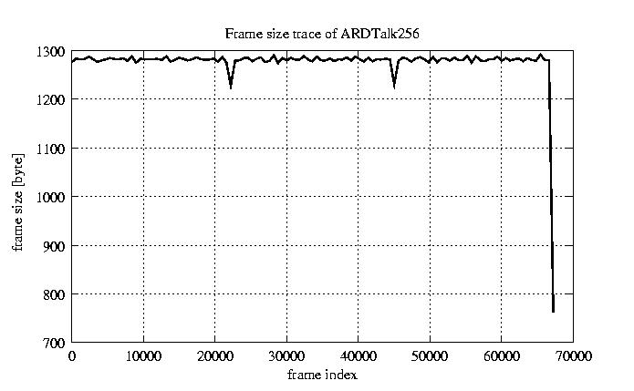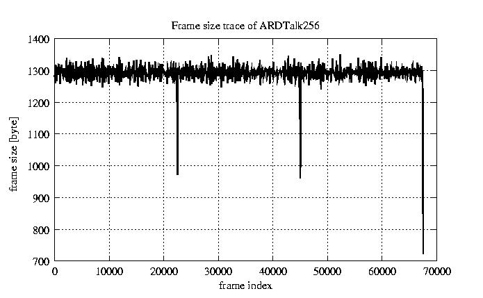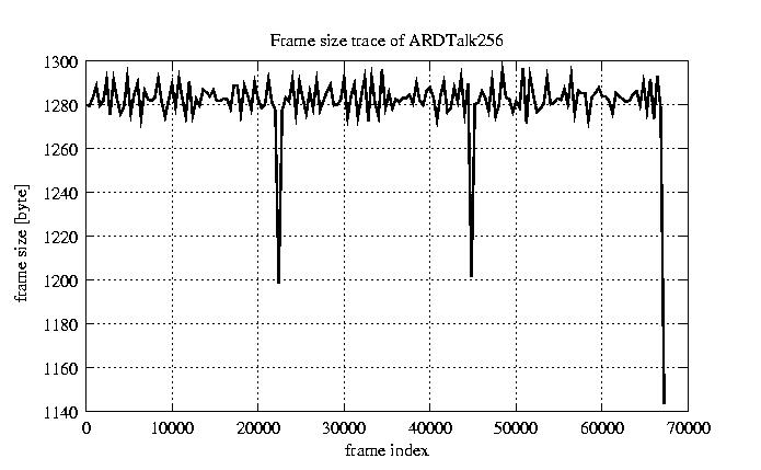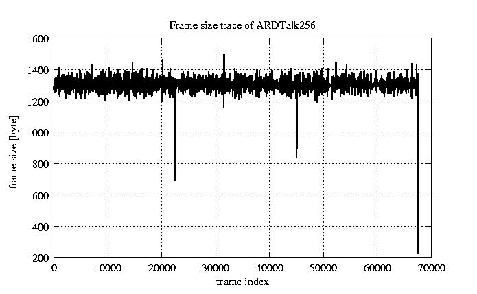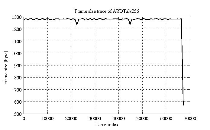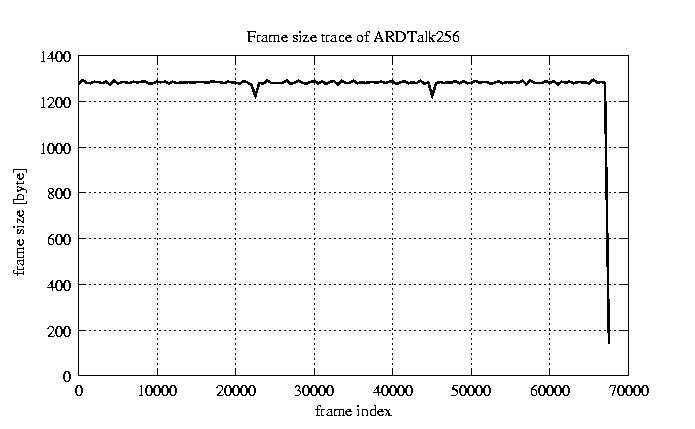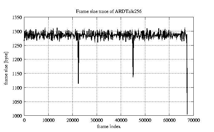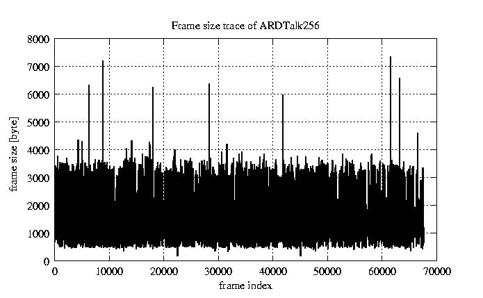 Frames, stuffed Rates Frames, original compression ratio YUV:H263 29.73 29.73 File size byte 8.6e+07 8.6e+07 Video run time msec 2.7e+06 2.7e+06 2.7e+06 # of Frames - 67557.00 17067.00 mean frame size byte 1278.89 5062.28 var frame size - 5589937.68 2974104.07 CoV of frame size - 1.85 0.34 min frame size byte 0.00 636.00 max frame size byte 10330.00 10330.00 Peak/Mean frame - 8.08 2.04 Mean bit rate bit/sec 2.6e+05 Peak bit rate bit/sec 1.5e+06 Peak/Mean of bit rate - 5.8 CoV of bit rate - 0.43 max inter frame space frames 1.00 31.00