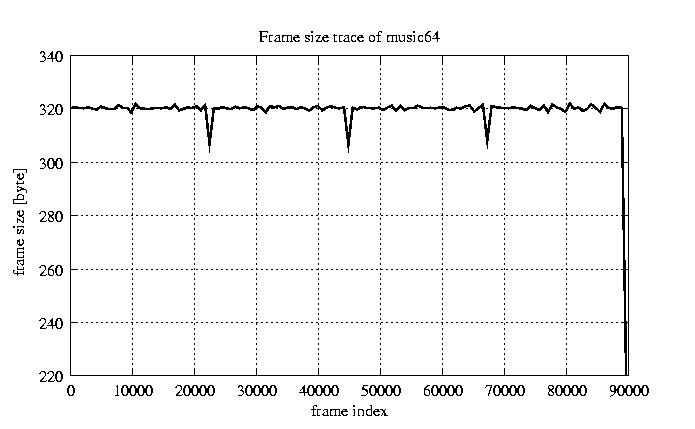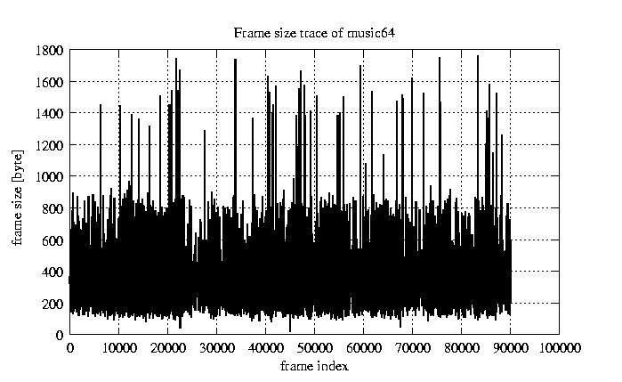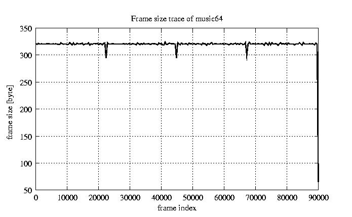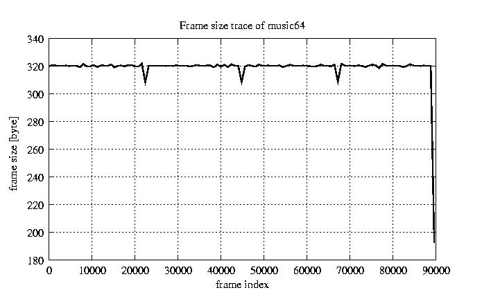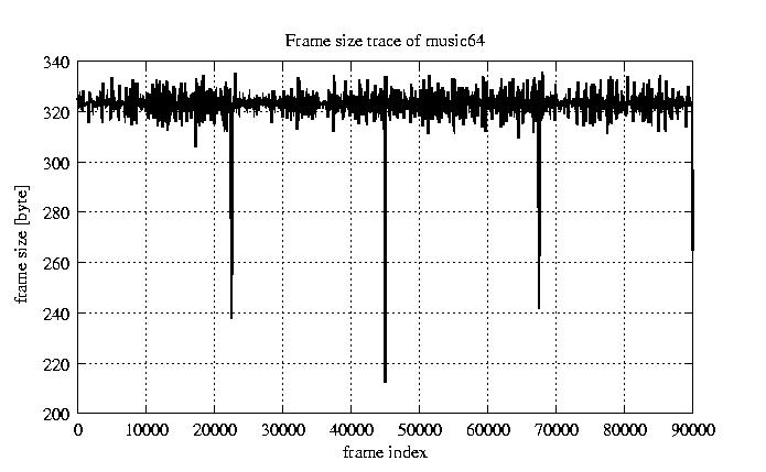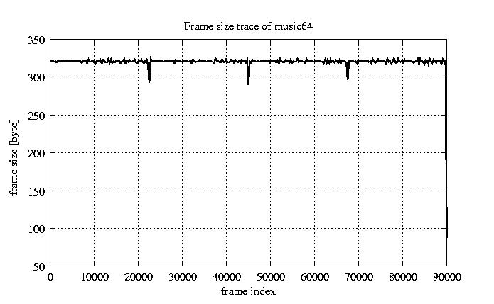 Frames, stuffed Rates Frames, original compression ratio YUV:H263 118.96 118.96 File size byte 2.9e+07 2.9e+07 Video run time msec 3.6e+06 3.6e+06 3.6e+06 # of Frames - 90081.00 28739.00 mean frame size byte 319.59 1001.75 var frame size - 271089.77 166370.25 CoV of frame size - 1.63 0.41 min frame size byte 0.00 88.00 max frame size byte 7095.00 7095.00 Peak/Mean frame - 22.20 7.08 Mean bit rate bit/sec 6.4e+04 Peak bit rate bit/sec 3.5e+05 Peak/Mean of bit rate - 5.5 CoV of bit rate - 0.36 max inter frame space frames 1.00 33.00